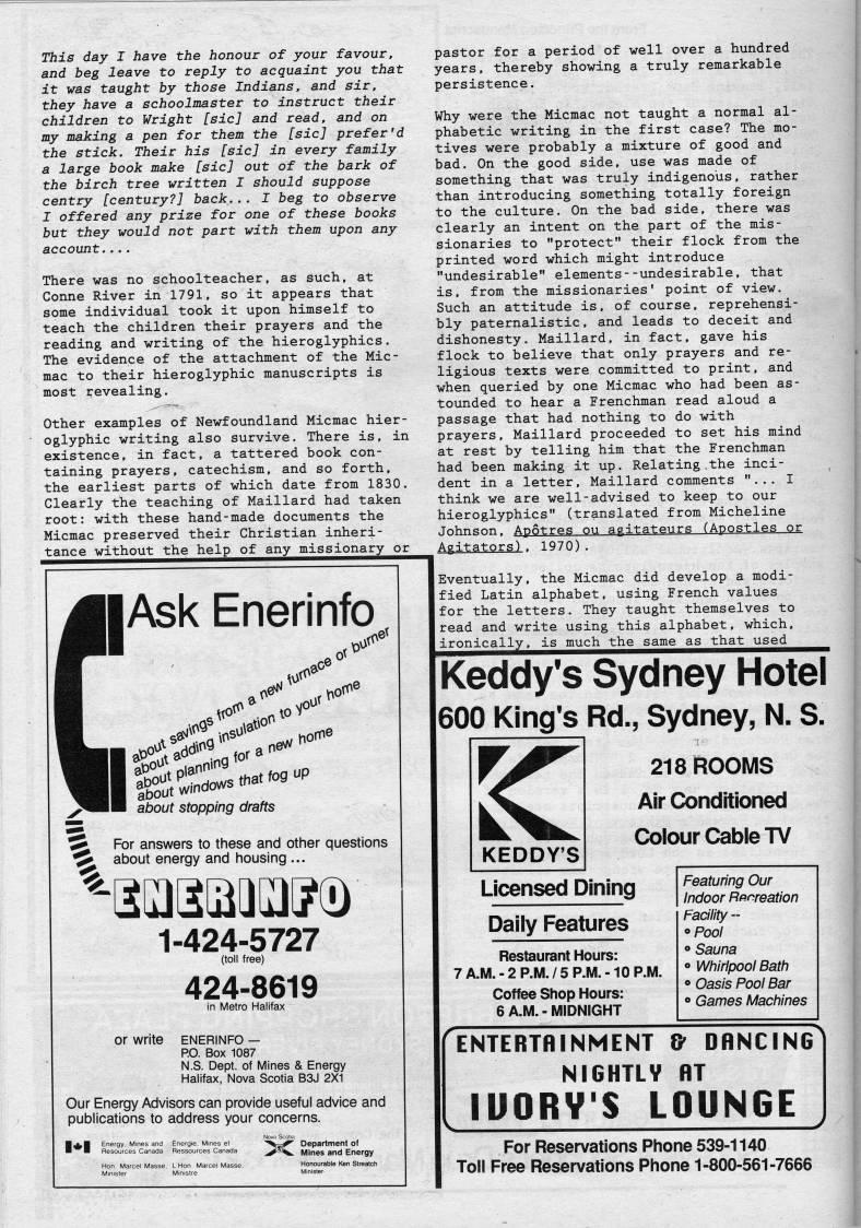 Published by Ronald Caplan on 1988/1/1 (411 reads)This day I have the honour of your favour, and beg leave to reply to acquaint you that it was taught by those Indians, and sir, they have a schoolmaster to instruct their children to Wright [sic] and read, and on my making a pen for them the [sic] prefer'd the stick. Their his [sic] in every family a large book make [sic] out of the bark of the birch tree written I should suppose centry [century?] back... I beg to observe I offered any prize for one of these books but they would not part with them upon any account.... There was no schoolteacher, as such, at Conne River in 1791, so it appears that some individual took it upon himself to teach the children their prayers and the reading and writing of the hieroglyphics. The evidence of the attachment of the Mic? mac to their hieroglyphic manuscripts is most revealing. Other examples of Newfoundland Micmac hier? oglyphic writing also survive. There is, in existence, in fact, a tattered book con? taining prayers, catechism, and so forth, the earliest parts of which date from 1830. Clearly the teaching of Maillard had taken root: with these hand-made documents the Micmac preserved their Christian inheri- tance without the help of any missionary or lAsk Enerinfo A'S'' fi' ato"' ,toV lOO' tiorn' • ''"n'--' about stopping drafts ' For answers to these and other questions *S about energy and housing ... 1-424-5727 (toll free) 424-8619 in Metro Halifax or write enerinfo • P.O. Box 1087 N.S. Dept. of Mines & Energy Halifax, Nova Scotia B3J 2X1 Our Energy Advisors can provide useful advice and publications to address your concerns. 1'1 Energy. Mines and Energie, M.nes < pastor for a period of well over a hundred years, thereby showing a truly remarkable persistence. Why were the Micmac not taught a normal al? phabetic writing in the first case? The mo? tives were probably a mixture of good and bad. On the good side, use was made of something that was truly indigenous, rather than introducing something totally foreign to the culture. On the bad side, there was clearly an intent on the part of the mis? sionaries to "protect" their flock from the printed word which might introduce "undesirable" elements--undesirable, that is, from the missionaries' point of view. Such an attitude is, of course, reprehensi- bly paternalistic, and leads to deceit and dishonesty. Maillard, in fact, gave his flock to believe that only prayers and re? ligious texts were committed to print, and when queried by one Micmac who had been as? tounded to hear a Frenchman read aloud a passage that had nothing to do with prayers, Maillard proceeded to set his mind at rest by telling him that the Frenchman had been making it up. Relating.the inci? dent in a letter, Maillard comments "... I think we are well-advised to keep to our hieroglyphics" (translated from Micheline Johnson, Apotres ou agitateurs (Apostles or Agitators). 1970). Eventually, the Micmac did develop a modi? fied Latin alphabet, using French values for the letters. They taught themselves to read and write using this alphabet, which, ironically, is much the same as that used Keddy's Sydney Hotel 600 King's Rd., Sydney, N. S. KEDDY'S 218 ROOMS Air Conditioned Colour Cable TV Licensed Dining Daily Features Restaurant Hours: 7 A.M. - 2 P.M. / 5 P.M. -10 P.M. Coffee Shop Hours: 6 A.M. - MIDNIGHT Featuring Our Indoor Rfinreation Facility ~ <>Pool ? Sauna ? Whirlpool Bath ?? Oasis Pool Bar ? Games Machines ENTERTAINMENT & DANCING NIGHTLV AT lUORV'S LOUNGE For Reservations Phone 539-1140 Toll Free Reservations Phone 1-800-561-7666