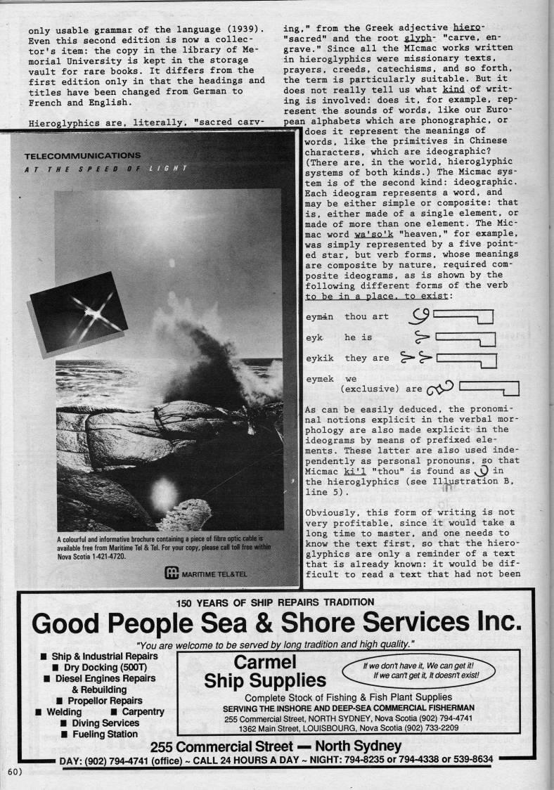 Published by Ronald Caplan on 1988/1/1 (527 reads)only usable grammar of the language (1939). Even this second edition is now a collec? tor's item: the copy in the library of Me? morial University is kept in the storage vault for rare books. It differs from the first edition only in that the headings and titles have been changed from German to French and English. Hieroglyphics are, literally, "sacred carv- A colourful and informative brochure containing a piece of fibre optic d'lst available free from Maritime Tel & Tel. For your copy, please call toll free ?ififlw: Nova Scotia 1-421-4720. ing," from the Greek adjective hiero- "sacred" and the root glyph- "carve, en? grave." Since all the Micmac works written in hieroglyphics were missionary texts, prayers, creeds, catechisms, and so forth, the term is particularly suitable. But it does not really tell us what kind of writ? ing is involved: does it, for example, rep? resent the sounds of words, like our Euro? pean alphabets which are phonographic, or does it represent the meanings of words, like the primitives in Chinese characters, which are ideographic? (There are, in the world, hieroglyphic systems of both kinds.) The Micmac sys? tem is of the second kind: ideographic. Each ideogram represents a word, and may be either simple or composite: that is, either made of a single element, or made of more than one element. The Mic? mac word wa'so'k "heaven," for example, was simply represented by a five point? ed star, but verb forms, whose meanings are composite by nature, required com? posite ideograms, as is shown by the following different forms of the verb to be in a place, to exist: eymin thou art eyk- he is eykik they are ':' ':' Q K3 eymek we r r- (exclusive) are Q'-' • -- =a As can be easily deduced, the pronomi? nal notions explicit in the verbal mor? phology are also made explicit in the ideograms by means of prefixed ele? ments. These latter are also used inde? pendently as personal pronouns, so that Micmac ki'1 "thou" is found as ''p in the hieroglyphics (see Illustration B, line 5). ' Obviously, this form of writing is not very profitable, since it would take a long time to master, and one needs to know the text first, so that the hiero? glyphics are only a reminder of a text that is already known: it would be dif? ficult to read a text that had not been 150 YEARS OF SHIP REPAIRS TRADITION Good People Sea & Shore Services Inc. "You are welcome to be sen/ed by long tradition and high quality." ?? Ship & Industrial Repairs Dry Docking (SOOT) ?? Diesel Engines Repairs & Rebuilding ?? Propeller Repairs Welding ?? Carpentry ?? Diving Services ?? Fueling Station Carmel Ship Supplies If we don't have it, We can get it! If we cant get it, It doesn't exist! Complete Stock of Fishing & Fish Plant Supplies SERVING THE INSHORE AND DEEP-SEA COMMERCIAL FISHERMAN 255 Commercial Street, NORTH SYDNEY, Nova Scotia (902) 794-4741 1362 Main Street, LOUISBOURG, Nova Scotia (902) 733-2209 60) 255 Commercial Street • North Sydney ?? DAY: (902) 794-4741 (office) ~ CALL 24 HOURS A DAY ~ NIGHT: 794-8235 or 794-4338 or 539-8634