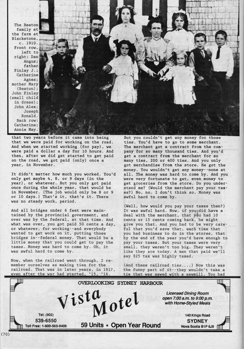 The Beaton family at the farm at Blackstone, c. 1910. Front row, left to right: Dan Angus; father Finlay J.; Catherine Agnes; mother Mary (Beaton); John Finlay (small child in dress); John Alex; Joseph Ronald. Back row: Catherine; Annie May. that two yefeirs before it came into being that we were paid for working on the road. And when we started working (for pay), we were paid a dollar a day for 10 hours. And then, after we did get started to get paid on the road, we got paid (only) once a year, in November. It didn't matter how much you worked. You'd only get maybe 4, 8, or 9 days (in the year), or whatever. But you only got paid once during the whole year, that would be in November. (The job would only be 8 or 9 or 10 days.) That's it, that's it. There was no steady work, period. And all bridges under 6 feet were main? tained by the provincial government, and over was by the federal, at that time. And what was over, you got paid 50 cents a day, or whatever, for working--and everybody wanted to get work on it, putting those bridges in--federal money. That would be a little money that you could get to pay the taxes. Money was hard to come by. Oh, it was awful hard to come by. Now, when the railroad went through, I re? member ourselves as making ties for the railroad. That was in later years, in 1917, even after th'w''ia'''a'e''''''''''' But you couldn't get any money for those ties. You'd have to go to some merchant. The merchant got a contract from the com? pany for so many thousand ties. And you'd get a contract from the merchant for so many ties, 200 or 400 ties. And you only got merchandise from the store. He got the money. You wouldn't get any money--none at all. The money was hard to come by. And you were very fortunate to get, even money to get groceries from the store. Do you under? stand me? (Would the merchant pay your tax? es?) No, no. I don't think so. Money was awful hard to come by. (Well, how would you pay your taxes then?) It was awful hard. Now, if you did have a deal with the merchant, that ydu had 10 cents or 15 cents coming back, he might give you that. And you had to be very care? ful that you'd save that, each time that you had business to do in the stores, that by the end of the year you'd have enough to pay your taxes. But your taxes were very small, they weren't too big. They weren't like they are today. A man that paid we'll say $25 tax was highly taxed. (And these railroad ties....) Now this was the funny part of it--they wouldn't take a tie that was sawed with a sawmill. You had IJr OVERLOOKING SYDNEY HARBOUR VistJiotel nin Tel: (902) 539-6550 Toll Free: 1-800-565-9409 ' 59 Units * Open Year Round Licensed Dining Room open 7:00 a.m. to 9:00 p.m. witti Home-Styled Meals 140 Kings Road SYDNEY Nova Scotia BIP 6J9 uQT nm (70)