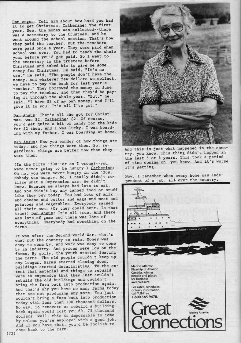(72) Dan Angus: Tell him about how hard you had it to get Christmas. Catherine: The first year. See, the money was collected--there was a secretary to the trustees, and he went around the school section. That's how they paid the teacher. But the teachers were paid once a year. They were paid when school was over. You had to teach the whole year before you'd get paid. So I went to the secretary to the trustees before Christmas and asked him to give me some money for Christmas. He said, "It's no use." He said, "The people don't have the money. And whatever few dollars we collect, we have to pay the bank for last year's teacher." They borrowed the money in June to pay the teacher, and then they'd be pay? ing it through the whole year. "But," he said, "I have $2 of my own money, and I'll give it to you. It's all I've got." Dan Angus: That's all she got for Christ? mas, was $2. Catherine: $2. Of course, you'd get quite a bit of candy for the kids for $2 then. And I was lucky, I was board? ing with my father. I was boarding at home. Dan Angus: Now you wonder of how things are today, and how things were then. So, re? gardless, things are better now than they were then. (In the Dirty '30s--or am I wrong?--you were never going to be hungry.) Catherine: Oh no, you were never hungry in the '30s. Nobody was hungry. No. I really didn't re? alize what a Depression was. We didn't know. Because we always had lots to eat. And you didn't buy any canned food or stuff like they buy today. You had lots of milk and cheese and butter and eggs and meat and potatoes and vegetables. Everybody raised all their own. (Or they could hunt. Is that true?) Dan Angus: It's all true. And there was lots of game and there was lots of everything. Everybody had something on the farms. It was after the Second World War, that's what put the country to ruin. Money was easy to come by, and work was easy to come by in industry. And prices were low on the farms. By golly, the youth started leaving the farms. The old people couldn't keep up any longer. Farms started closing down, buildings started deteriorating. To the ex? tent that material and things to rebuild were so expensive that they just couldn't rebuild the old buildings and couldn't bring the farm back into production again. And that's why you have so many farms today that are not producing any more. You just couldn't bring a farm back into production today with less than 100 thousand dollars. No way. To renovate or rebuild a building back again would cost you 60, 75 thousand dollars. Well, this is impossible to come by unless you're employed with a good job. And if you have that, you'd be foolish to come back to the farm. And this is just what happer'eu i':. -r.t. __.:- try, you know. This thing didn't happen in the 1-ast 5 or 6 years. This took a period of time coming on, you know. And it's worse it's getting. Now, I remember when every home was inde? pendent of a job, all over the country. Marine Atlantic, Flagship of Atlantic Canada, joining people and places for business and pleasure. For rates, schedules, or ferry information call Toll-Free 1-800-565-9470, '''X. '''''.X' Marine Atlantic (jonnections