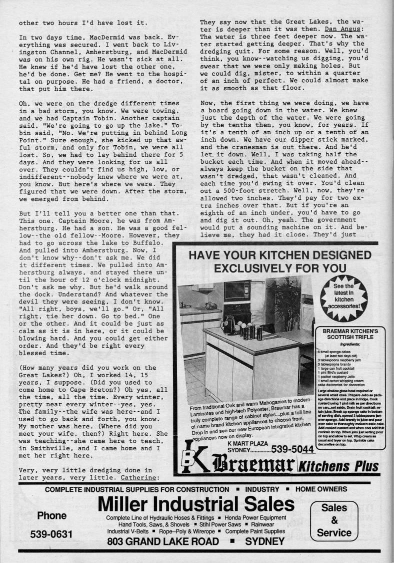 other two hours I'd have lost it. In two days time, MacDermid was back. Ev? erything was secured. I went back to Liv? ingston Channel, Amherstburg, and MacDermid was on his own rig. He wasn't sick at all. He knew if he'd have lost the other one, he'd be done. Get me? He went to the hospi? tal on purpose. He had a friend, a doctor, that put him there. They say now that the Great Lakes, the wa? ter is deeper than it was then. Dan Angus: The water is three feet deeper now. The wa? ter started getting deeper. That's why the dredging quit. For some reason. Well, you'd think, you know--watching us digging, you'd swear that we were only making holes. But we could dig, mister, to within a quarter of an inch of perfect. We could almost make it as smooth as that floor. Oh, we were on the dredge different times in a bad storm, you know. We were towing, and we had Captain Tobin. Another captain said, "We're going to go up the lake." To? bin said, "No. We're putting in behind Long Point." Sure enough, she kicked up that aw? ful storm, and only for Tobin, we were all lost. So, we had to lay behind there for 5 days. And they were looking for us all over. They couldn't find us high, low, or indifferent--nobody knew where we were at, you know. But here's where we were. They figured that we were down. After the storm, we emerged from behind. But I'll tell you a better one than that. This one. Captain Moore, he was from Am? herstburg. He had a son. He was a good fel low--the old fellow--Moore. However, they had to go across the lake to Buffalo. And pulled into Amherstburg. Now, I don't know why--don't ask me. We did it different times. We pulled into Am? herstburg always, and stayed there un? til the hour of 12 o'clock midnight. Don't ask me why. But he'd walk around the dock. Understand? And whatever the devil they were seeing, I don't know. "All right, boys, we'll go." Or, "All right, tie her down. Go to bed." One or the other. And it could be just as calm as it is in here, or it could be blowing hard. And you could get either order. And they'd be right every blessed time. Now, the first thing we were doing, we have a board going down in the water. We knew just the depth of the water. We were going by the tenths then, you know, for years. If it's a tenth of an inch up or a tenth of an inch down. We have our dipper stick marked, and the cranesman is out there. And he'd let it down. Well, I was taking half the bucket each time. And when it moved ahead-- always keep the bucket on the side that wasn't dredged, that wasn't cleaned. And each time you'd swing it over. You'd clean out a 500-foot stretch. Well, now, they're allowed two inches. They'd pay for two ex? tra inches over that. But if you're an eighth of an inch tinder, you'd have to go and dig it out. Oh, yeah. The government would put a sounding machine on it. And be? lieve me, they had it close. They'd just (How many years did you work on the Great Lakes?) Oh, I worked 14, 15 years, I suppose. (Did you used to come home to Cape Breton?) Oh yes, all the time, all the time. Every winter, pretty near every winter--yes, yes. 'The family--the wife was here--and I used to go back and forth, you know. My mother was here. (Where did you meet your wife, then?) Right here. She was teaching--she came here to teach, in Smithville, and I came home and I met her right here. Very, very little dredging done in later years, very little. Catherine: HAVE YOUR KITCHEN DESIGNED EXCLUSIVELY FOR YOU "'Mcesnov, on display. KMARTPLAZA __. --,. SYDNEY 539-5044 BRAEMAR KITCHEN'S SCOTTISH TRIFLE 6 small sponge cakes (at least two days old) 3 tablespoons raspberry jam 3 tablespoons brandy 1 large can fruit cocktail 1 pint Bird's custard 1 packet raspbeny Jello 1 small carton whipping cream cake decorettes (or decoratkjn Lsge shancw glass bowl reqiired or custard using 1 pint milk as per drections on can...set aside. Drain fniit codctail; r tain juice. Break up sponge calte in bottc of serving dish, spread 3 tafaiespoons iai over sponge. Add brandy to juice and pa over cake to tfuroughly moisten stale cake. I Add cooked custard and when cod add fiUt cocktail on topL When jello just setting pour on top and allow to set Whip cresm aa layer on topi Sprinkle cake MtnZmnXlKitchens Plus COMPLETE INDUSTRIAL SUPPLIES FOR CONSTRUCTION INDUSTRY HOME OWNERS Phone 539-0631 Miller Industrial Sales rsai'r' Complete Line of Hydraulic Hoses & Fittings ?? Honda Power Equipment Hand Tools, Saws, & Shovels ?? Stihl Power Saws ?? Rainwear Industrial V-Belts ?? Rope-Poly & Wirerope ?? Complete Paint Supplies 803 GRAND LAKE ROAD " SYDNEY & Service