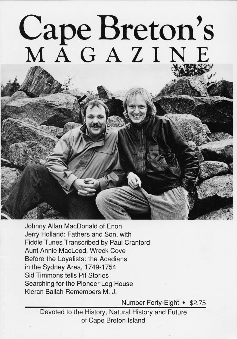 • Johnny Allan MacDonald of Enon • Jerry Holland: Fathers and Son • Aunt Annie MacLeod, Wreck Cove • Before the Loyalists: the Acadians in the Sydney Area, 1749-1754 • Sid Timmons tells Pit Stories • Searching for the Pioneer Log House • Kieran Ballah Remembers M. J