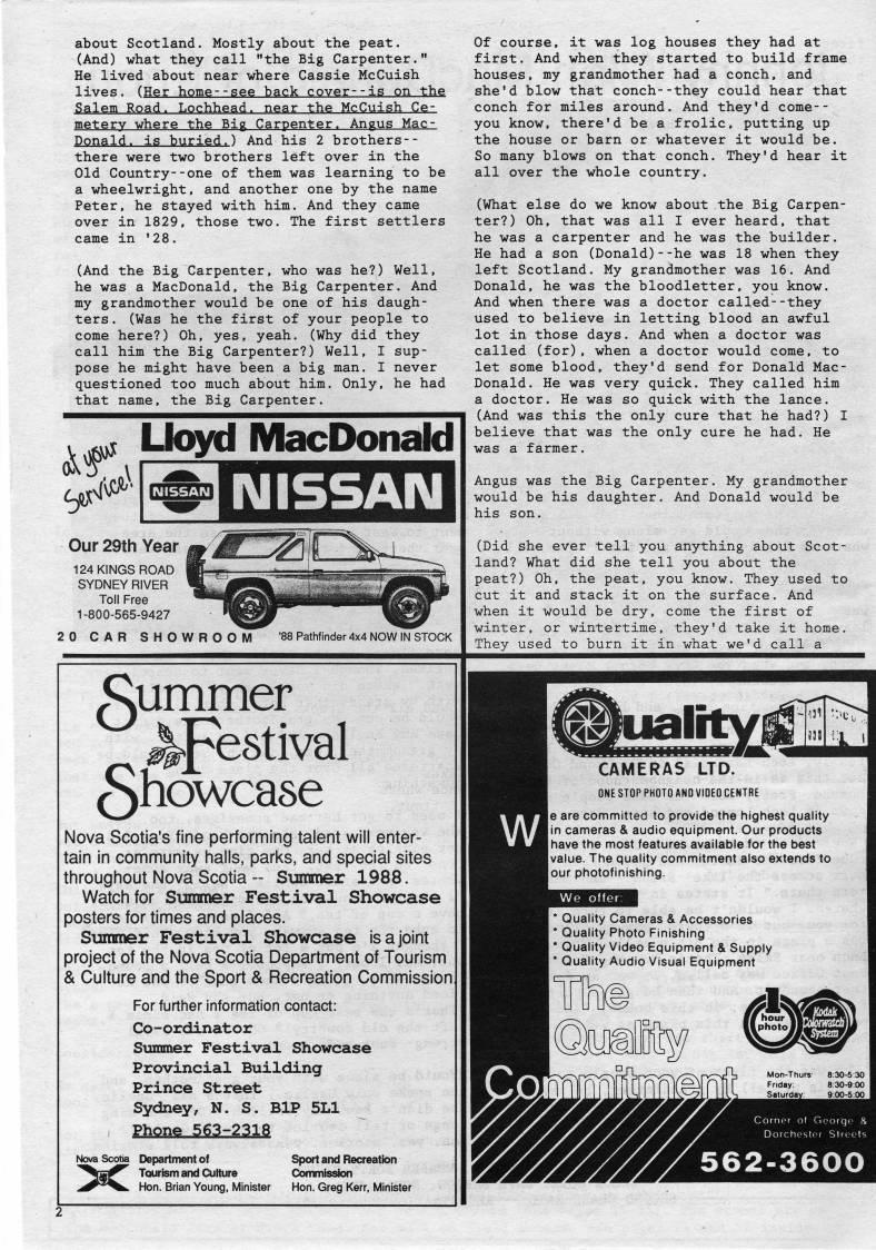 Published by Ronald Caplan on 1988/6/1 (418 reads)about Scotland. Mostly about the peat. (And) what they call "the Big Carpenter." He lived about near where Cassie McCuish lives. (Her home--see back cover--is on the Salem Road. Lochhead. near the McCuish Ce? metery where the Big Carpenter. Angus Mac? Donald. is buried.) And his 2 brothers-- there were two brothers left over in the Old Country--one of them was learning to be a wheelwright, and another one by the name Peter, he stayed with him. And they came over in 1829, those two. The first settlers came in '28. (And the Big Carpenter, who was he?) Well, he was a MacDonald, the Big Carpenter. And my grandmother would be one of his daugh? ters. (Was he the first of your people to come here?) Oh, yes, yeah. (Why did they call him the Big Carpenter?) Well, I sup? pose he might have been a big man. I never questioned too much about him. Only, he had that name, the Big Carpenter. Ltoyd MacDonald 'NISSAN Our 29th Year 124 KINGS ROAD SYDNEY RIVER Toll Free 1-800-565-9427 20 CAR SHOWROOM '88 Pathfinder 4x4 NOW IN STOCK Of course, it was log houses they had at first. And when they started to build frame houses, my grandmother had a conch, and she'd blow that conch--they could hear that conch for miles around. And they'd come-- you know, there'd be a frolic, putting up the house or barn or whatever it would be. So many blows on that conch. They'd hear it all over the whole country. (What else do we know about the Big Carpen? ter?) Oh, that was all I ever heard, that he was a carpenter and he was the builder. He had a son (Donald)--he was 18 when they left Scotland. My grandmother was 16. And Donald, he was the bloodletter, you know. And when there was a doctor called--they used to believe in letting blood an awful lot in those days. And when a doctor was called (for), when a doctor would come, to let some blood, they'd send for Donald Mac? Donald. He was very quick. They called him a doctor. He was so quick with the lance. (And was this the only cure that he had?) I believe that was the only cure he had. He was a farmer. Angus was the Big Carpenter. My grandmother would be his daughter. And Donald would be his son. (Did she ever tell you anything about Scot? land? What did she tell you about the peat?) Oh, the peat, you know. They used to cut it and stack it on the surface. And when it would be dry, come the first of winter, or wintertime, they'd take it home. They used to burn it in what we'd call a gummer 'pestival 'hov'case Nova Scotia's fine performing talent will enter? tain in community halls, parks, and special sites throughout Nova Scotia - Summer 1988. Watch for Siammer Festival Showcase posters for times and places. Simimer Festival Showcase is a joint project of the Nova Scotia Department of Tourism & Culture and the Sport & Recreation Commission For further information contact: Co-ordinator Summer Festival Showcase Provincial Building Prince Street Sydney, N. S. BIP 5L1 Phpng $$3-2319 Nova Scotia Department of ''taj'*' Tourism and Culture ,'''''h. Hon. Brian Young, Minister Sport and Recreation Commission Hon. Greg Kerr, Minister