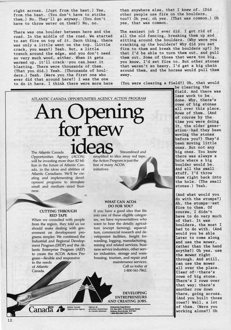 Published by Ronald Caplan on 1988/6/1 (283 reads)right across. (Just from the heat.) Yes, from the heat. (You don't have to strike them.) No. They'll go anyvay. (You don't have to throw water on them?) No, no. There was one boulder between here and the road. In the middle of the road. We started to set fire on top of it. Darn thing, there was only a little went on the top. (Little crack, you mean?) Yeah. But, a little trench around the edge, and you don't need so very much wood, either. When it gets warmed up, it'll crack--you can hear it blasting. There were thousands of them. (That you did.) Yeah. (Thousands of boul? ders.) Yeah. (Were you the first one who ever did that around here?) I was the one to do it here. I think there were more here ATLANTIC CANADA OPPORTUNITIES AGENCY ACTION PROGRAM An Opening for new ideas The Atlantic Canada Opportunities Agency (ACOA) will be investing more than $2 bil? lion in the future of Atlantic Can? ada, in the ideas and abilities of Atlantic Canadians. We'll be cre? ating and implementing devel? opment programs to stimulate small and medium-sized busi- CUTTING THROUGH RED TAPE When we consulted with people from the region, they told us we should make dealing with gov? ernment on development pro? grams simpler. We combined the Industrial and Regional Develop? ment Program (IRDP) and the At? lantic Enterprise Program (AEP) to create the ACOA Action Pro? gram • flexible and responsive to the needs of Atiantic than anywhere else, that I knew of. (Did other people use fire on the boulders, too?) Oh yes, oh yes. (That was common.) Oh yes, that was common. The easiest job I ever did. I got rid of all the old fencing, breaking them up and sitting around the boulders. (Why were you cracking up the boulders? Why did you set fire to them and break the boulders up?) So that I'd be able to turn them out, and pull them out. Some of those that were too big, you know, I'd set fire to. But other stones that weren't so heavy, I'd get a big chain around them, and the horses would pull them away. (You were clearing a field?) Oh, that would _be clearing the Ifield. And there was less work to be done. Why, there's rows of big stones all over this place. Rows of them. (And of course by the time you were doing it, the older gener? ation- -had they been moving the stones before you?) They'd been moving little ones. But not any big ones. You know there was always a hole where a big boulder would be. And all the small stuff, I'd throw them right back into the hole. (The small stones.) Yeah. (And what would you do with the stumps?) Ah, the stumps--set fire to them. Of course, I didn't have to do very much of that. It was boulders, the most I had to do with. (And would you be able later to come along and use the mower, rather than the hand scythe?) Oh yes, use the mower right through. And still, can use the mower all over the place. Clear of--there's rows of big stone. There's 2 rows over that way; there's another row down there, going across. (And you built those rows?) Well, a lot of them. (Were you working alone?) Oh Streamlined and simplified to slice away red tape, the Action Program is just the first of many ACOA initiatives. WHAT CAN ACOA DO FOR YOU? If you have a good idea that fits into one of these eligible categor? ies, we have representatives who want to hear the details: agricul? ture (except farming), aquacul- ture, commercial research and de? velopment facilities, freight for? warding, logging, manufacturing, mining and related services, busi? ness service industries, other serv? ice industries, storage and ware? housing, tourism, and repair and maintenance services. Call us today at 1-800-561-7862. DEVELOPING ENTREPRENEURS AND CREATING JOBS. Enterprise Cape Breton 1.800-565-9460 (Toll Fr