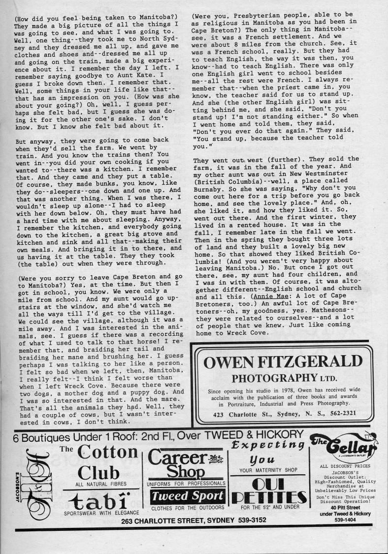 Published by Ronald Caplan on 1988/6/1 (286 reads)(How did you feel being taken to Manitoba?) They made a big picture of all the things I was going to see, and what I was going to. Well, one thing--they took me to North Syd? ney and they dressed me all up, and gave me clothes and shoes and--dressed me all up and going on the train, made a big experi? ence about it. I remember the day I left. I remember saying goodbye to Aunt Kate. I guess I broke down then. I remember that. Well, some things in your life like that-- that has an impression on you. (How was she about your going?) Oh, well, I guess per? haps she felt bad, but I guess she was do? ing it for the other one's sake. I don't know. But I know she felt bad about it. But anyway, they were going to come back when they'd sell the farm. We went by train. And you know the trains then? You went in--you did your own cooking if you wanted to--there was a kitchen. I remember that. And they came and they put a table. Of course, they made bunks, you know, like they do--sleepers--one down and one up. And that was another thing. When I was there, I wouldn't sleep up alone--I had to sleep with her down below. Oh, they must have had a hard time with me about sleeping. Anyway, I remember the kitchen, and everybody going down to the kitchen, a great big stove and kitchen and sink and all that--making their own meals. And bringing it in to there, and us having it at the table. They they took (the table) out when they were through. (Were you sorry to leave Cape Breton and go to Manitoba?) Yes, at the time. But then I got in school, you know. We were only a mile from school. And my aunt would go up? stairs at the window, and she'd watch me all the ways till I'd get to the village. We could see the village, although it was a mile away. And I was interested in the ani? mals, see. I guess if there was a recording of what I used to talk to that horse! I re? member that, and braiding her tail and braiding her mane and brushing her. I guess perhaps I was talking to her like a person. I felt so bad when we left, then, Manitoba, I really felt--I think I felt worse than when I left Wreck Cove. Because there were two dogs, a mother dog and a puppy dog. And I was so interested in that. And the mare. That's all the animals they had. Well, they had a couple of cows, but I wasn't inter? ested in cows, I don't think. (Were you, Presbyterian people, able to be as religious in Manitoba as you had been in Cape Breton?) The only thing in Manitoba-- see, it was a French settlement. And we were about 8 miles from the church. See, it was a French school, really. But they had to teach English, the way it was then, you know--had to teach English. There was only one English girl went to school besides me--all the rest were French. I always re? member that--when the priest came in, you know, the teacher said for us to stand up. And she (the other English girl) was sit? ting behind me, and she said, "Don't you stand up! I'm not standing either." So when I went home and told them, they said, "Don't you ever do that again." They said, "You stand up, because the teacher told you."" They went out west (further). They sold the farm, it was in the fall of the year. And my other aunt was out in New Westminster (British Columbia)--well, a place called Burnaby. So she was saying, "Why don't you come out here for a trip before you go back home, and see the lovely place." And, oh, she liked it, and how they liked it. So, went out there. And the first winter, they lived in a rented house. It was in the fall, I remember late in the fall we went. Then in the spring they bought three lots of land and they built a lovely big new home. So that showed they liked British Co? lumbia! (And you weren't very happy about leaving Manitoba.) No. But once I got out there, see, my aunt had four children, and I was in with them. Of course, it was alto? gether different--English school and church and all this. (Annie Mae: A lot of Cape Bretoners, too.) An awful lot of Cape Bre? toners- -oh, my goodness, yes. Mathesons-- they were related to ourselves--and a lot of people that we knew. Just like coming home to Wreck Cove. OWEN FITZGERALD PHOTOGRAPHY LTD. Since opening his studio in 1978, Owen has received wide acclaim with the publication of three books and awards in Portraiture, Industrial and Press Photography. 423 Charlotte St., Sydney, N. S., 562-2321 6 Boutiques Under 1 Roof: 2nd FL, Over TWEED & HICKORY "' Cotton' .Bxp'rti,.' Club ALL NATURAL FIBRES ':abr Careers Shoo UNIFORMS FOR PROFESSIONALS you YOUR MATERNITY SHOP Tweed Sport] CLOTHES FOR THE OUTDOORS SPORTSWEAR WITH ELEGANCE 263 CHARLOTTE STREET, SYDNEY 539-3152 CTITK FOR THE 5'2" AND UNDER ALL DISCOUNT PRICES JACOBSON'S Discount Outlet: High-Fashioned, Quality Merchandise at Unbelievably Low Prices Don 1 This uiscount Operation! 40 Pitt Street under Tweed & Hickory 539-1404