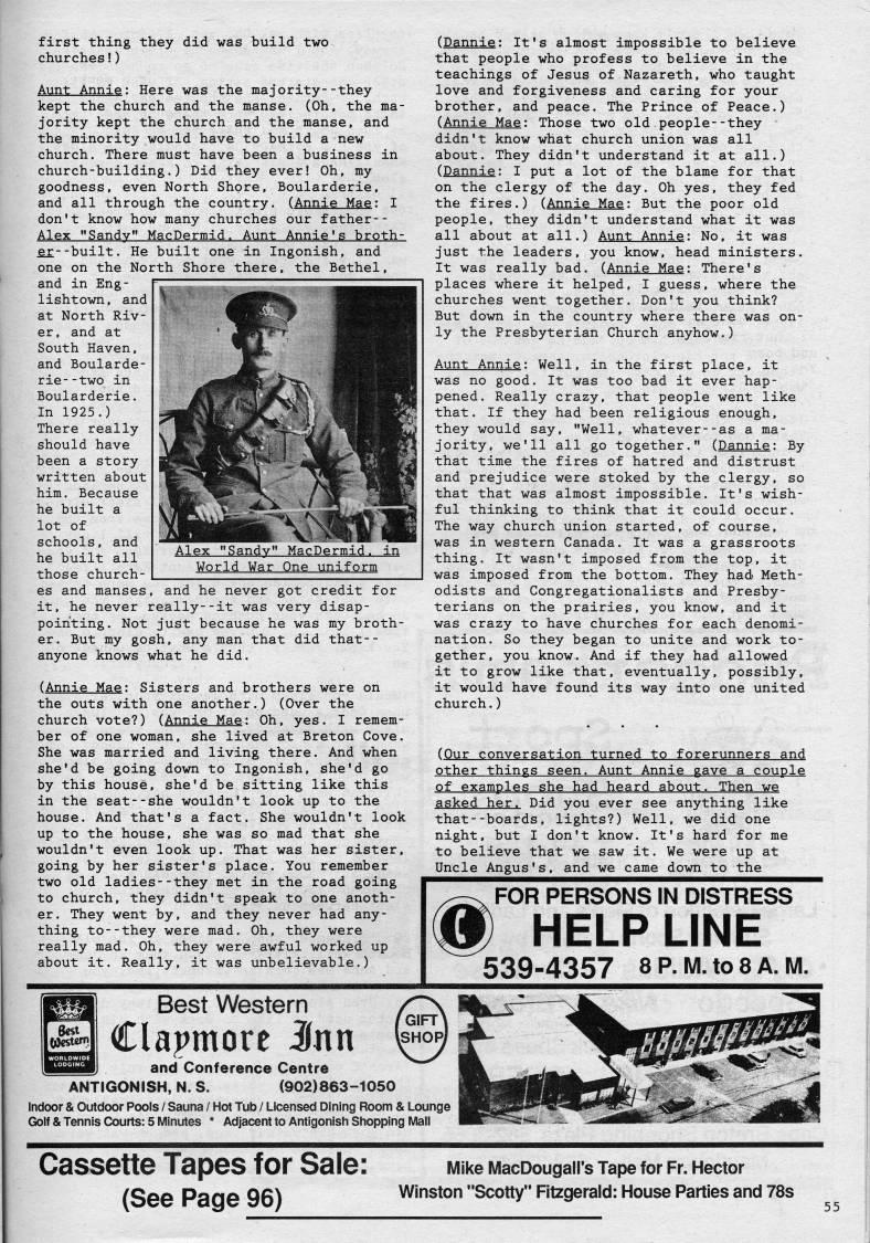 Published by Ronald Caplan on 1988/6/1 (180 reads)first thing they did was build two churches!) Aunt Annie: Here was the majority--they kept the church and the manse. (Oh, the ma? jority kept the church and the manse, and the minority would have to build a new church. There must have been a business in church-building.) Did they ever! Oh, my goodness, even North Shore, Boularderie, and all through the country. (Annie Mae: I don't know how many churches our father-- Alex "Sandy" MacDermid. Aunt Annie's broth? er- -built . He built one in Ingonish, and one on the North Shore there, the Bethel, and in Eng? lishtown, and at North Riv? er, and at South Haven, and Boularde? rie- -two in Boularderie. In 1925.) There really should have been a story written about him. Because he built a lot of schools, and he built all those church? es and manses, and he never got credit for it, he never really--it was very disap? pointing. Not just because he was my broth? er. But my gosh, any man that did that-- anyone knows what he did. (Annie Mae: Sisters and brothers were on the outs with one another.) (Over the church vote?) (Annie Mae: Oh, yes. I remem? ber of one woman, she lived at Breton Cove. She was married and living there. And when she'd be going down to Ingonish, she'd go by this house, she'd be sitting like this in the seat--she wouldn't look up to the house. And that's a fact. She wouldn't look up to the house, she was so mad that she wouldn't even look up. That was her sister, going by her sister's place. You remember two old ladies--they met in the road going to church, they didn't speak to one anoth? er. They went by, and they never had any? thing to--they were mad. Oh, they were really mad. Oh, they were awful worked up about it. Really, it was unbelievable.) Alex "Sandy" MacDermid. in World War One uniform (Dannie: It's almost impossible to believe that people who profess to believe in the teachings of Jesus of Nazareth, who taught love and forgiveness and caring for your brother, and peace. The Prince of Peace.) (Annie Mae: Those two old people--they didn't know what church union was all about. They didn't understand it at all.) (Dannie: I put a lot of the blame for that on the clergy of the day. Oh yes, they fed the fires.) (Annie Mae: But the poor old people, they didn't understand what it was all about at all.) Aunt Annie: No, it was just the leaders, you know, head ministers. It was really bad. (Annie Mae: There's places where it helped, I guess, where the churches went together. Don't you think? But down in the country where there was on? ly the Presbyterian Church anyhow.) Aunt Annie: Well, in the first place, it was no good. It was too bad it ever hap? pened. Really crazy, that people went like that. If they had been religious enough, they would say, "Well, whatever--as a ma? jority, we'll all go together." (Dannie: By that time the fires of hatred and distrust and prejudice were stoked by the clergy, so that that was almost impossible. It's wish? ful thinking to think that it could occur. The way church union started, of course, was in western Canada. It was a grassroots thing. It wasn't imposed from the top, it was imposed from the bottom. They had Meth? odists and Congregationalists and Presby? terians on the prairies, you know, and it was crazy to have churches for each denomi? nation. So they began to unite and work to? gether, you know. And if they had allowed it to grow like that, eventually, possibly, it would have found its way into one united church.) (Our conversation turned tP forerunners and other things seen. Aunt Annie gave a couple Qf examples she h'd hg'rd about- Then ve asked her. Did you ever see anything like that--boards, lights?) Well, we did one night, but I don't know. It's hard for me to believe that we saw it. We were up at Uncle Angus's, and we came down to the FOR PERSONS IN DISTRESS HELP UNE 539-4357 8 p. m. to 8 A. m. Best Western Clapmore Mn and Conference Centre ANTIGONISH, N. S. (902)863-1050 Indoor & Outdoor Pools / Sauna / Hot Tub / Licensed Dining Room & Lounge Golf & Tennis Courts: 5 Minutes * Adjacent to Antigonisfi Shopping Mall Cassette Tapes for Sale: (See Page 96) IVIike iAacDougairs Tape for Fr. Hector Winston "Scotty" Fitzgerald: House Parties and 78s