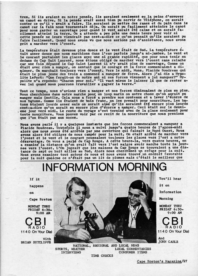 Published by Ronald Caplan on 1974/10/1 (548 reads)tres. Si ils avaient eu notre pensle, ils auraient settlement eu'la peine d'envoyer un canot en drive. Si la pens'e avait aussi bien pu servir de Telephone, on aurait conter ce qu'il y avait a faire. Ils'auraient pu mettre des rames et du pain dans le canot car la faim nous tourmentait deja. On aurait pu fa9ilement atteindre le canot pour nous garder un sauvetage pour quand le vent aurait ete calme et on aurait fa? cilement atteint la terre. On a attendu a peu pr'es une demie heure pour voir si cette pensee ne leurs viendrait pas cest-a-dire ce qu'on pensait qu'ils auraient pu faire facilement, Quand nous avons vu que nous aurions pas d'assistance, nous avons prit a marcher vers 1'ouest. La temperature etait devenue plus douce et le vent etait de Sud. La temperature e- tait asser douce que nous marchions dans I'eau parfois jusqu'a mi-jambes, Le vent et le courant portaient les glaces avec une si grande rapidit', que pour nous tenir en dedans du Cap Sait Laurent, nous etions oblig' de marcher vers I'ouest sans relache car une fois depasse le Cap Saint Laurent il n'y avait plus de sauvetage, Comme on 'tait avec rien a manger, on sentait que le courage et la force commencaient a di- minuer. On marchait toujours vers I'ouest, Vers le midi, Mons, Placide Boudreau qui etait le plus jeune des trois a commence a manquer de force, Alors j'ai dis a Hypo- lite LeFort: "Que ferait-on de notre ami si ses forces viennent a lui manquer?" Hy- polite m??a repondu: "Chacun pour soi." "II vaut mieux le laisser 'a que de rester a- vec lui quand nous pourrons travailler a gagner la terre." Tout ce temps, nous n'avions rien a manger et nos forces diminuaient de plus en plus, Nous cherchions dans notre marche pour un loup marin ou autre chose qu'on aurait pu manger mais inutile. Cela nous a force a prendre nos couteaux et a lever I''corce de nos batons, Comme ils 'taient de bois franc, 'on les prenait pour nourriture, Les ba? tons etaient lourds asser mais on aurait aime qu'ils auraient et' encore plus lourds cest-a-dire qu'on aurait eu encore plus d'ecorce a manger, Ceci etait sur le deuxi- . eme jour vers midi. Le reste du voyage s'est termine avec de la glace seulement pour toute nourriture. Vous pouvez voir par ce recit de la nourriture que nous prenions que I'on 'tait pas aux noces. Nous avons parle il y a quelques instants que les forces commencaient a manquer a Placide Boudreau. Toutefois il'nous. a suivi jusqu'a quatre heures de I'apres-midi alors que nous avons ete arretes par'une ouverture qui faisait le'Nord Ouest, Nous avons alors 'te obliges de nous camper pour la nuit. On etait arret' de marcher vers I'ouest et le vent et le courant poussaient toujours les glaces vers I'est a notre d'savantage. On vous a parle du Cap Rouge, A cette heure-la, vers quatre heures,' on a examine la distance qu'on avait fait vers I'est malgre avoir marche toute la jour- nee vers I'ouest, L'On jugeait que les maisons du Cap gouge se trouvaient a une dis? tance de sept ou huit milles au Sud, Alors nous chercharaes un refuge pour la nuit. Nous avons examiner tout autour de nous et nous avons trouv' un endroit favorable pour la nuit quoioue ce n''tait pas un lit de plumes mais c??etait le meilleur que INFORMATION MORNING If it happens on Cape Breton MONDAY THRU FRIDAY 6:30- 9:00 AM CBI RADIO 1140 On Your Dial With BRIAN SUTCLIFFE 1140 On Your Dial NATIONAL, REGIONAL AND LOCAL NEWS SPORTS, WEATHER LOCAL COMMENTARIES INTERVIEWS CONSUMER ITEMS TIME CHECKS Cape Breton's Magazine/27