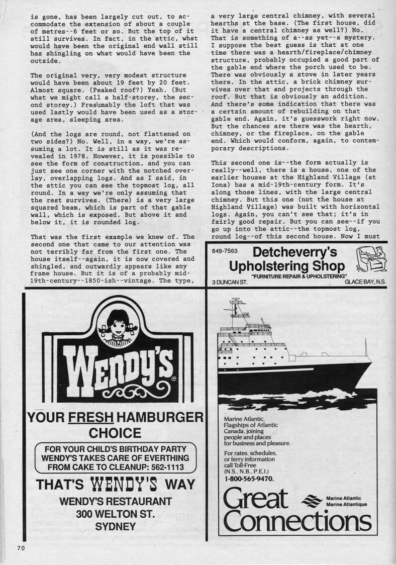 Published by Ronald Caplan on 1988/6/1 (330 reads)is gone, has been largely cut out, to ac? commodate the extension of about a couple of metres--6 feet or so. But the top of it still survives. In fact, in the attic, what would have been the original end wall still has shingling on what would have been the outside. The original very, very modest structure would have been about 19 feet by 20 feet. Almost square. (Peaked roof?) Yeah. (But what we might call a half-storey, the sec? ond storey.) Presumably the loft that was used lastly would have been used as a stor? age area, sleeping area. (And the logs are round, not flattened on two sides?) No. Well, in a way, we're as? suming a lot. It is still as it was re? vealed in 1978. However, it is possible to see the form of construction, and you can just see one corner with the notched over? lay, overlapping logs. And as I said, in the attic you can see the topmost log, all round. In a way we're only assuming that the rest survives. (There) is a very large squared beam, which is part of that gable wall, which is exposed. But above it and below it, it is rounded log. That was the first example we knew of. The second one that came to our attention was not terribly far from the first one. The house itself--again, it is now covered and shingled, and outwardly appears like any frame house. But it is of a probably mid- 19th-century--1850-ish--vintage. The type. a very large central chimney, with several hearths at the base. (The first house, did it have a central chimney as well?) No. That is something of a--as yet--a mystery. I suppose the best guess is that at one time there was a hearth/fireplace/chimney structure, probably occupied a good part of the gable end where the porch used to be. There was obviously a stove in later years there. In the attic, a brick chimney sur? vives over that and projects through the roof. But that is obviously an addition. And there's some indication that there was a certain amount of rebuilding on that gable end. Again, it's guesswork right now. But the chances are there was the hearth, chimney, or the fireplace, on the gable end. Which would conform, again, to contem? porary descriptions. This second one is--the form actually is really--well, there is a house, one of the earlier houses at the Highland Village (at lona) has a mid-19th-century form. It's along those lines, with the large central chimney. But this one (not t'e house at Highland Village) was built with horizontal logs. Again, you can't see that; it's in fairly good repair. But you can see--if you go up into the attic--the topmost log, round log--of this second house. Now I must 849-7563 Detcheverry's Upholstering Shop "FURNITURE REPAIR & UPHOLSTERING" GLACE BAY, N.S. YOUR FRESH HAMBURGER CHOICE FOR YOUR CHILD'S BIRTHDAY PARTY WENDY'S TAKES CARE OF EVERTHING FROM CAKE TO CLEANUP: 562-1113 THAT'S WENDY'S WAY WENDY'S RESTAURANT 300 WELTON ST. SYDNEY Marine Atlantic, Flagships of Atlantic Canada, joining people and places for business and pleasure. For rates, schedules, or ferry information call Toil-Free (N.S.,N.B..P.E.I.) 1-800-565'470. Great ' (jonnections Marine Atlantic Marine Atlantique