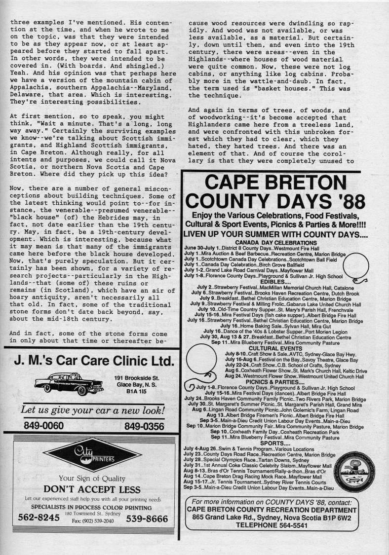 Published by Ronald Caplan on 1988/6/1 (338 reads)three examples I've mentioned. His conten? tion at the time, and when he wrote to me on the topic, was that they were intended to be as they appear now, or at least ap? peared before they started to fall apart. In other words, they were intended to be covered in. (With boards. And shingled.) Yeah. And his opinion was that perhaps here we have a version of the mountain cabin of Appalachia, southern Appalachia--Maryland, Delaware, that area. Which is interesting. They're interesting possibilities. At first mention, so to speak, you might think, "Wait a minute. That's a long, long way away." Certainly the surviving examples we know--we're talking about Scottish immi? grants, and Highland Scottish immigrants, in Cape Breton. Although really, for all intents and purposes, we could call it Nova Scotia, or northern Nova Scotia and Cape Breton. Where did they pick up this idea? Now, there are a number of general miscon? ceptions about building techniques. Some of the latest thinking would point to--for in? stance, the venerable--presumed venerable-- "black house" (of) the Hebrides may, in fact, not date earlier than the 19th centu? ry. May, in fact, be a 19th-century devel? opment. Which is interesting, because what it may mean is that many of the immigrants came here before the black house developed. Now, that's purely speculation. But it cer? tainly has been shown, for a variety of re? search projects--particularly in the High? lands- -that (some of) these ruins or remains (in Scotland), which have an air of hoary antiquity, aren't necessarily all that old. In fact, some of the traditional stone forms don't date back beyond, say, about the mid-18th century. And in fact, some of the stone forms come in only about that time or thereafter be- J. M.'s Car Care Clinic Ltd. 191 BrooksldeSt. Glace Bay, N. S. 81A115 Let us give your car a new look! 849-0060 849-0356 Your Sign of Quality DONT ACCEPT LESS Let our experienced staff help you with all your printing needs SPECIALISTS IN PROCESS COLOR PRINTING 562-8245 Fax:(902)539-2040 539-8666 cause wood resources were dwindling so rap? idly. And wood was not available, or was less available, as a material. But certain? ly, down until then, and even into the 19th century, there were areas--even in the Highlands--where houses of wood material, were quite common. Now, these were not log cabins, or anything like log cabins. Proba? bly more in the wattle-and-daub. In fact, the term used is "basket houses." This was the technique. And again in terms of trees, of woods, and of woodworking--it's become accepted that Highlanders came here from a treeless land, and were confronted with this unbroken for? est which they had to clear, which they hated, they hated trees. And there was an element of that. And of course the corol? lary is that they were completely unused to CAPE BRETON COUNTY DAYS '88 Enjoy the Various Celebrations, Food Festivals, Cultural & Sport Events, Picnics & Parties & Morel!!! LIVEN UP YOUR SUMMER WITH COUNTY DAYS.... CANADA DAY CELEBRATIONS June 30-July 1..District 8 County Days..Westmount Fire Hall July 1..Mira Auction & Beef Barbecue-Recreation Centre, Marion Bridge' July L.Scotchtown Canada Day Celebrations..Scotchtown Ball Field July 1..Canada Day Celebration..Birch Grove Ballfield July 1-2..Grand Lake Road Carnival Days..Mayflower Mall July 1-8..Florence County Days..Playground & Sullivan Jr. High School EDIBLES.... July 2..Strawberry Festival..MacMillan Memorial Church Hall, Catalone July 6..Strawberry Festival..Brooks Haven Recreation Centre, Dutch Brook July 9..Breakfast..Bethel Christian Education Centre, Marion Bridge July 9..Strawberry Festival & Milling Frolic.Gabarus Lake United Church Hall July 10..Old-Time Country Supper..St. Mary's Parish Hall, Frenchvale July 15-16..Mira Festival Days (fish cake supper)..AIbert Bridge Fire Hall July 16..Strawberry FestivaL.Bethel Christian Education Centre, Marion Bridge July 16..Home Baking Sale..Sylvan Hall, Mira Gut July 16..Dance of the'40s & Lobster Supper..Port Morien Legion July 30, Aug 13 & 27..Breakfast..Bethel Christian Education Centre Sep 11..Mira Blueberry Festival..Mira Community Pasture CULTURAL EVENTS July 8-10..Craft Show & Sale..AVTC, Sydney-Glace Bay Hwy. July 16-Aug 6..Festival on the Bay..Savoy Theatre, Glace Bay July 22-24..Craft Show..C.B. School of Crafts, Sydney Aug 6..Coxheath Flower Show..St. Mark's Church Hall, Keltic Drive Aug 24..Westmount Rower Show..Westmount United Church Hall PICNICS & PARTIES.... July 1-8..Florence County Days..Playground & Sullivan Jr. High School July 15-16..Mira Festival Days (dances)..Albert Bridge Fire Hall July 24..Brooks Haven Community Family Picnic.Two Rivers Park, Marion Bridge July 30..St. Margaret's Summer Picnic.St. Margaret's Parish Hall, Grand Mira Aug 6..Lingan Road Community PicnicJohn Golemic's Farm, Lingan Road Aug 13..Albert Bridge Firemen's Picnic.Albert Bridge Fire Hall Sep 3-5..Main-a-Dieu Credit Union Labour Day Events..Main-a-Dieu Sep 10..Marion Bridge Community Fair..Mira Community Pasture, Marion Bridge Sep 10..Coxheath Family Day..Coxheath Recreation Park Sep 11..Mira Blueberry Festival..Mira Community Pasture SPORTS.... July 4-Aug 26..Swim & Tennis Program..Various Locations July 23..County Days Road Race..Recreation Centre, Marion Bridge ' July 28..Special Olympics Race..Tartan Downs, Sydney July 31..1st Annual Coke Classic Celebrity Slalom..Mayflower Mall i Aug 8-13..Bras d'Or Tennis Tournament/Rally-a-thon..Bras d'Or Aug 14..Cape Breton Drag Racing Mock Race..Mayflower Mall Aug 15-17..Jr. Tennis Tournament..Sydney River Tennis Courts Sep 3-5..Main-a-Dieu Credit Union Labour Day Events..Main-a-Dieu ' For more information on COUNTY DAYS '88, contact: CAPE BRETON COUNTY RECREATION DEPARTMENT 865 Grand Lake Rd., Sydney, Nova Scotia BIP 6W2 . TELEPHONE 564-5541