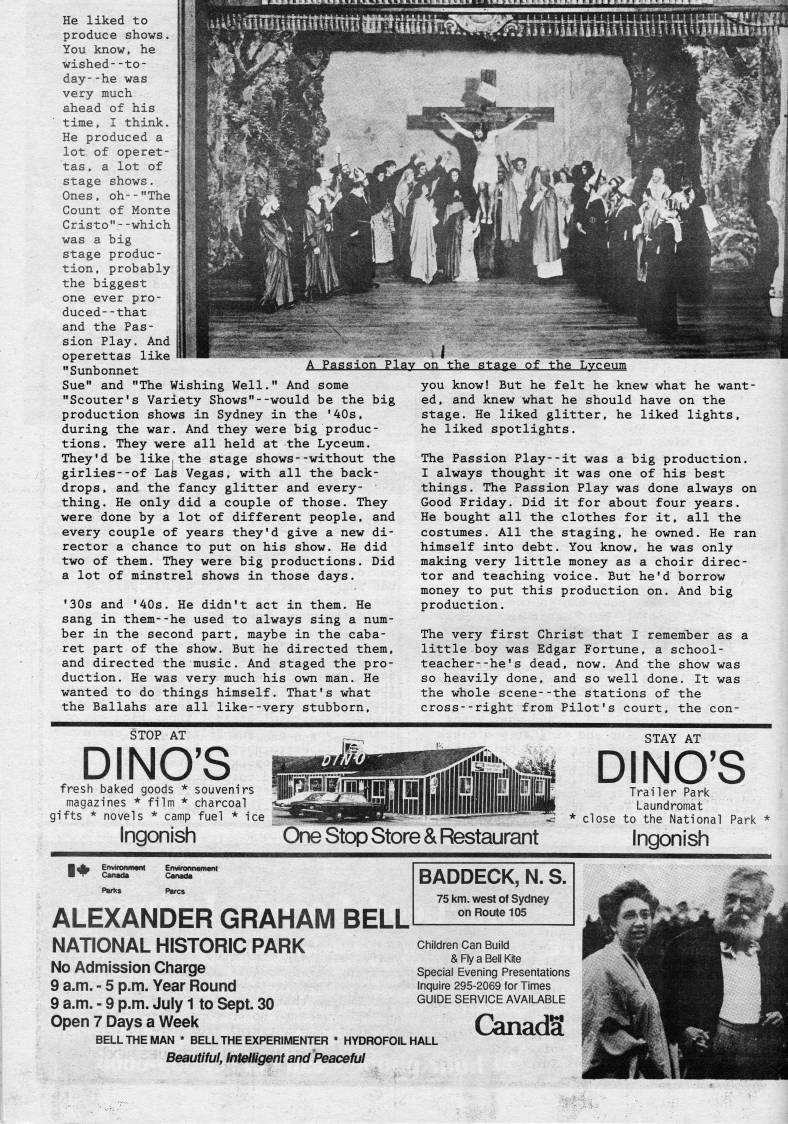 ii'j'fliiilpMtiiffitaitttM He liked to produce shows. You know, he wished--to? day- -he was very much ahead of his time, I think. He produced a lot. of operet? tas , a lot of stage shows. Ones, oh--"The Count of Monte Cristo"--which was a big stage produc? tion, probably the biggest one ever pro? duced- -that and the Pas? sion Play. And j operettas like ' "Sunbonnet Sue" and "The Wishing Well." And some "Scouter's Variety Shows"--would be the big production shows in Sydney in the '40s, during the war. And they were big produc? tions. They were all held at the Lyceum. They'd be like,the stage shows--without the girlies--of La' Vegas, with all the back? drops , and the fancy glitter and every? thing. He only did a couple of those. They were done by a lot of different people, and every couple of years they'd give a new di? rector a chance to put on his show. He did two of them. They were big productions. Did a lot of minstrel shows in those days. '30s and '40s. He didn't act in them. He sang in them--he used to always sing a num? ber in the second part, maybe in the caba? ret part of the show. But he directed them, and directed the music. And staged the pro? duction. He was very much his own man. He wanted to do things himself. That's what the Ballahs are all like--very stubborn. m'''. you know! But he felt he knew what he want? ed, and knew what he should have on the stage. He liked glitter, he liked lights, he liked spotlights. The Passion Play--it was a big production. I always thought it was one of his best things. The Passion Play was done always on Good Friday. Did it for about four years. He bought all the clothes for it, all the costumes. All the staging, he owned. He ran himself into debt. You know, he was only making very little money as a choir direc? tor and teaching voice. But he'd borrow money to put this production on. And big production. The very first Christ that I remember as a little boy was Edgar Fortune, a school- teacher--he's dead, now. And the show was so heavily done, and so well done. It was the whole scene--the stations of the cross--right from Pilot's court, the con- STOP AT DINO'S fresh baked goods * souvenirs magazines * film * charcoal gifts * novels * camp fuel * ice Ingonish STAY AT One Stop Store & Restaurant DINO'S Trailer Park Laundromat * close to the National Park * Ingonish 1' ALEXANDER GRAHAM BELL NATIONAL HISTORIC PARK No Admission Charge 9 a.m. - 5 p.m. Year Round 9 a.m. - 9 p.m. July 1 to Sept. 30 Open 7 Days a Week BELL THE MAN * BELL THE EXPERIMENTER * HYDROFOIL HALL Beautiful, hitelUgent and Peaceful BADDECK, N. S. 75 km. west of Sydney on Route 105 Children Can Build & Fly a Bell Kite Special Evening Presentations Inquire 295-2069 for Times GUIDE SERVICE AVAILABLE CanadS