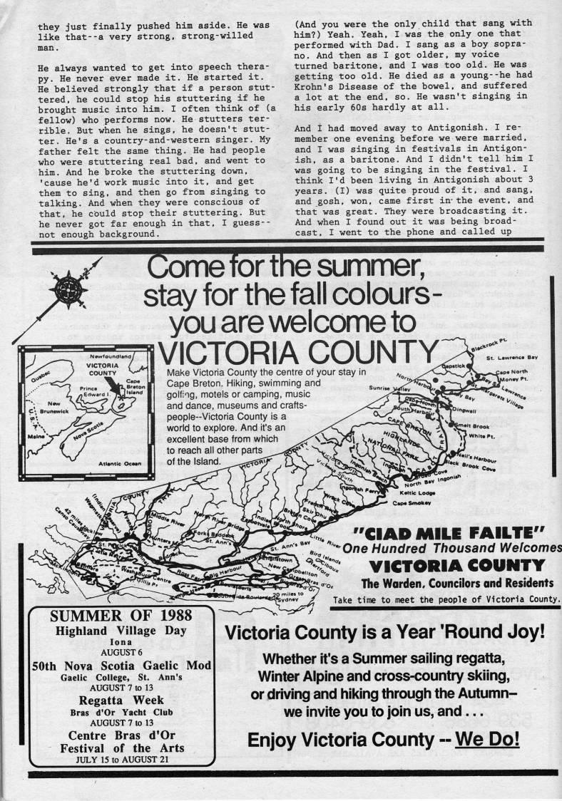 Published by Ronald Caplan on 1988/6/1 (257 reads)they just finally pushed him aside. He was like that--a very strong, strong-willed man. He always wanted to get into speech thera? py. He never ever made it. He started it. He believed strongly that if a person stut? tered, he could stop his stuttering if he brought music into him. I often think of (a fellow) who performs now. He stutters ter? rible. But when he sings, he doesn't stut? ter. He's a country-and-western singer. My father felt the same thing. He had people who were stuttering real bad, and went to him. And he broke the stuttering down, 'cause he'd work music into it, and get them to sing, and then go from singing to talking. And when they were conscious of that, he could stop their stuttering. But he never got far enough in that, I guess-- not enough background. (And you were the only child that sang with him?) Yeah. Yeah, I was the only one that performed with Dad. I sang as a boy sopra? no. And then as I got older, my voice turned baritone, and I was too old. He was getting too old. He died as a young--he had Krohn's Disease of the bowel, and suffered a lot at the end, so. He wasn't singing in his early 60s hardly at all. And I had moved away to Antigonish. I re? member one evening before we were married, and I was singing in festivals in Antigon? ish, as a baritone. And I didn't tell him I was going to be singing in the festival. I think I'd been living in Antigonish about 3 years. (I) was quite proud of it, and sang, and gosh, won, came first in-the event, and that was great. They were broadcasting it. And when I found out it was being broad? cast, I went to the phone and called up Come for the summer, stay for the fall colours- you are welcome to VICTORIA county: Make Victoria County the centre of your stay in Cape Breton. Hiking, swimming and ' golfing, motels or camping, music and dance, museums and crafts? people-Victoria County is a world to explore. And it's an excellent base from which to reach all other parts of the Island. St. Lawranc* Bay I? Brook f Whlt? Pt. <'.'>. Keltic Lodga ''CIADMILE FAILTE'' One Hundred Thousand Welcomes VICTORIA COUNTY The Worden, Councilors ond Residents Take time to meet the people of Victoria County. SUMMER OF 1988 Highland Village Day lona AUGUST 6 50th Nova Scotia Gaelic Mod Gaelic College, St. Ann's AUGUST 7 to 13 Regatta Week Bras d'Or Yacht Club AUGUST 7 to 13 Centre Bras d*Or Festival of the Arts . JULY 15 to AUGUST 21 . Victoria County is a Year 'Round Joy Whether it's a Summer sailing regatta, Winter Alpine and cross-country skiing, or driving and hiking through the Autumn- we invite you to join us, and... Enjoy Victoria County - We Do