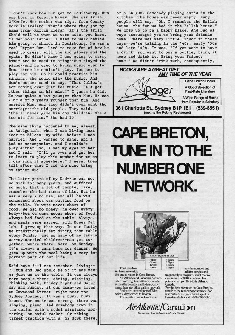 Published by Ronald Caplan on 1988/6/1 (185 reads)I don't know how Mum got to Louisbourg. Mum was born in Reserve Mines. She was Irish-- O'Keefe. Her mother was right from County Cork in Ireland. That's where they got my name from--Martin Kieran--it's the Irish. She'd tell us when we were kids, you know, "I met your father. I used to walk behind him going to church in Louisbourg. He was a real Dapper Dan. Used to make fun of how he used to dress, with the kid gloves and the spats. He didn't know I was going to marry him!" And he used to bring--Mum played the piano--and he used to bring music over to Mum. since he couldn't play, for her to play for him. So he could practice his singing, she would play the music. And Mum's mother used to say, "That fellow's not coming over just for music. He's got other things on his mind!" I guess he did. He was quite a bit younger than Mum. He was 7 or 8 or 9 years younger than Mum. And married Mum. And they didn't even want the marriage--the old people. They said, "She'll never give him any children. She's too old for him." She had 10! or a BB gun. Somebody playing cards in the kitchen. The house was never empty. Many people will say, "Oh, I remember the Ballah house--the fun we had in the Ballah house." We grew up to be a happy place. And Dad al? ways encouraged you to bring your friends home. There was very little liquor in those days--we're talking in the '40s, early '50s and late '40s. It was, "If you want to have a drink, you want to buy a bottle, bring it home and drink it. Bring your friends home." We didn't drink much, consequently. The same thing happened to me, almost, in Antigonish, when I was living next door to Eileen--my wife--before I was married. And I wanted to sing, and I had no accompanist, and I couldn't play either. So, I had my eyes on her. And I said, "I'll go over and get her to learn to play this number for me so I can sing it somewhere." I never knew till after that I did the same thing my father did. The later years of my Dad--he was so, so sick for many years, and suffered so much, that a lot of people, like, remember the bad times of him. But he was a very kind man, and all he was concerned about was putting food on the table. We were never short of food. We had no money--he owed every? body- -but we were never short of food. Always had food on the table. Always And meals were sacred, with Mosey Bal? lah. I grew up that way. In our family we traditionally eat dining room table every Sunday, and as many of my family as--my married children--can get to? gether, we're there--here--on Sunday. It's always a gang here for dinner. We grew up with the meal being a very im portant part of our life. We'd have 7--I can remember, living-- 7--Mum and Dad would be 9: it was nev? er just us at the table. It was always more people there, eating, visiting. Thinking back, Friday night and Satur day and Sunday, at our home--we lived on Townsend Street, right near the Sydney Academy. It was a busy, busy house. The music was strong: there was singing, piano. And somebody down in the cellar with a model airplane, mor taring, an awful racket. Or taking target practice with a .22 down there BOOKS ARE A GREAT GIFT ANY TIME OF THE YEAR Cape Breton Books A Good Selectbn of First-Rate Literature ' • A Wide Range of Books from Popular to Scholarly 361 Charlotte St., Sydney BIP 1 El (next to the Peking Restaurant) (539-8551) CAPEBRETXDN, TUNE IN TO THE NUMBER ONE NETWORK. The Canadian Airlines network is the one to watch in Cape Breton. Air Atlantic and Canadian Airlines offer more flights in Atlantic Canada, across the country and to five conti? nents than any otiier airline network. And we're expanding too! With twice a day service to Boston. The number one network also has the number one inflight service and frequent flyer program. You'll receive a minimum of 800 Canadian Plus points when you fly within Atlantic For the best reception in Cape Breton, tune in to the number one network. For reservations call your travel agent or Canadian Airiines at 1-800-565-1800. AirAlkmttlCdaaaidiyvi The Number One Network in Atlantic Catmda.