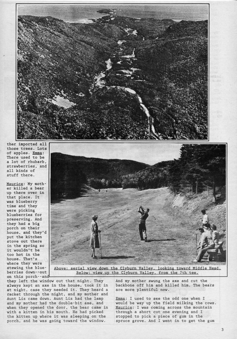 Published by Ronald Caplan on 1988/8/1 (372 reads)?? 1 H 1 1 1 1 m $ ''' H'''pil: ''''Ri-".'' 'Ijaif,;';"-"?-. C- ''".A j' '' ' ' * '' "'s"** 7.''- '??-i*''- Jf ..,'' _.''. ' ',' • • I ?? :-.flS "-.v:*?- ' ?? '. 'V'C''t -7 ther imported all those trees. Lots of apples. Emma: There used to be a lot of rhubarb, strawberries, and all kinds of stuff there. Maurice: My moth? er killed a bear up there over in that place. It was blueberry time and they were picking blueberries for preserving. And they had a big porch on their house, and they'd put the kitchen stove out there in the spring so it wouldn't be too hot in the house. That's where they were stewing the blue? berries down--out on this porch--and they left the window out that night. They always kept an axe in the house, took it in at night, case they needed it. They heard a racket through the night, and my mother and Aunt Liz came down. Aunt Liz had the lamp and my mother had the double-bit axe, and when they opened the door, the bear came in with a kitten in his mouth. He had picked the kitten up where it was sleeping on the porch, and he was going toward the window. Above: Bglpw; view up the Clyburn Vallgy. from thQ 7th t'Qt ,.e Head, And my mother swung the axe and cut the backbone off him and killed him. The bears are more plentiful now. Emma; I used to see the odd one when I would be way up the field milking the cows. Maurice: I was coming across the mountain through a short cut one evening and I stopped to pick a piece of gum in the spruce grove. And I went in to get the gum
