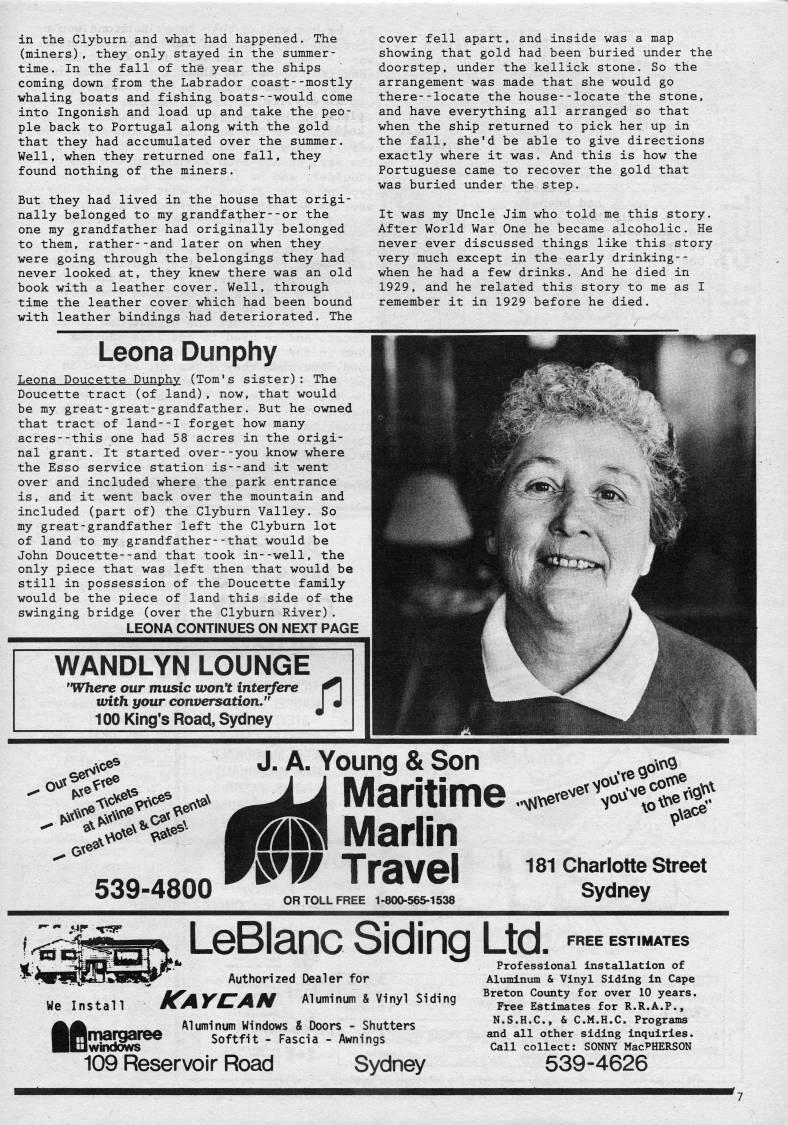 Published by Ronald Caplan on 1988/8/1 (402 reads)in the Clyburn and what had happened. The (miners), they only stayed in the summer? time. In the fall of the year the ships coming down from the Labrador coast--mostly whaling boats and fishing boats--would come into Ingonish and load up and take the peo? ple back to Portugal along with the gold that they had accumulated over the summer. Well, when they returned one fall, they found nothing of the miners. But they had lived in the house that origi? nally belonged to my grandfather--or the one my grandfather had originally belonged to them, rather--and later on when they were going through the belongings they had never looked at, they knew there was an old book with a leather cover. Well, through time the leather cover which had been bound with leather bindings had deteriorated. The cover fell apart, and inside was a map showing that gold had been buried under the doorstep, under the kellick stone. So the arrangement was made that she would go there--locate the house--locate the stone, and have everything all arranged so that when the ship returned to pick her up in the fall, she'd be able to give directions exactly where it was. And this is how the Portuguese came to recover the gold that was buried under the step. It was my Uncle Jim who told me this story. After World War One he became alcoholic. He never ever discussed things like this story very much except in the early drinking-- when he had a few drinks. And he died in 1929, and he related this story to me as I remember it in 1929 before he died. Leona Dunphy Leona Doucette Dunphy (Tom's sister): The Doucette tract (of land), now, that would be my great-great-grandfather. But he owned that tract of land--I forget how many acres--this one had 58 acres in the origi? nal grant. It started over--you know where the Esso service station is--and it went over and included where the park entrance is, and it went back over the mountain and included (part of) the Clyburn Valley. So my great-grandfather left the Clyburn lot of land to my grandfather--that would be John Doucette--and that took in--well, the only piece that was left then that would be still in possession of the Doucette family would be the piece of land this side of the swinging bridge (over the Clyburn River). LEONA CONTINUES ON NEXT PAGE WANDLYN LOUNGE "Where our music won*t interfere ' with your conversation." J J 100 King's Road, Sydney . 6?e* . ViO>'* 9??' 539-4800 A. Young & Son Maritime mSR Marlin m/ Travel OR TOLL FREE 1-800-565-1538 • '',V'ete'' >,ov>'vNetv' • 181 Charlotte Street Sydney ,Mr -crsp We Install LeBlanc Siding Ltd. • beest.mates • * Professional Installation of Authorized Dealer for K'AYCAN Aluminum & Vinyl Siding margaree Iwlndows Aluminum Windows & Doors - Shutters Softfit - Fascia - Awnings 109 Reservoir Road Sydney Professional installation of Aluminum & Vinyl Siding in Cape Breton County for over 10 years. Free Estimates for R.R.A.P., N.S.H.C, & C.M.H.C. Programs and all other siding inquiries. Call collect: SONNY MacPHERSON 539-4626