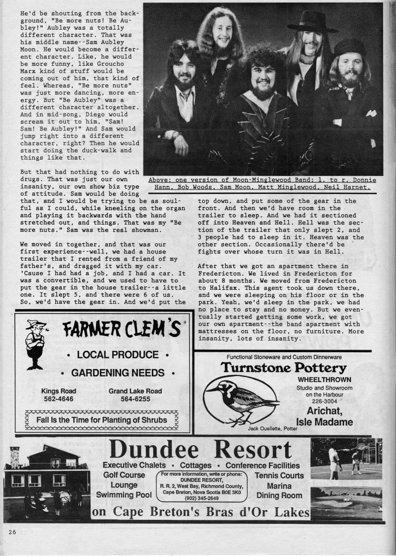 Published by Ronald Caplan on 1988/8/1 (422 reads)He'd be shouting from the back? ground, "Be more nuts! Be Au- bley!" Aubley was a totally different character. That was his middle name--Sam Aubley Moon. He would become a differr ent character. Like, he would be more funny, like Groucho Marx kind of stuff would be coming out of him, that kind of feel. Whereas, "Be more nuts" was just more dancing, more en? ergy. But "Be Aubley" was a different character altogether. And in mid-song, Diego would scream it out to him, "Sam! Sam! Be Aubley!" And Sam would jump right into a different character, right? Then he would start doing the duck-walk and things like that. But that had nothing to do with drugs. That was just our own Above insanity, our own show biz type Hann. Bob of attitude. Sam would be doing • ?''' • '' • that, and I would be trying to be as soul? ful as I could, while kneeling on the organ and playing it backwards with tllie hand stretched out, and things. That was my "Be more nuts." Sam was the real showman. We moved in together, and that was our first experience--well, we had a house trailer that I rented from a friend of my father's, and dragged it with my car. 'Cause I had had a job, and I had a car. It was a convertible, and we used to have to put the gear in the house trailer--a little one. It slept 5, and there were 6 of us. So, we'd have the gear in. And we'd put the • LOCAL PRODUCE • • GARDENING NEEDS • one version of Moon-Minglewood Band: 1. to r. Donnie Woods. Sam Moon. Matt Minglewood. Neil Harnet. top down, and put some of the gear in the front. And then we'd have room in the trailer to sleep. And we had it sectioned off into Heaven and Hell. Hell was the sec? tion of the trailer that only slept 2, and 3 people had to sleep in it. Heaven was the other section. Occasionally there'd be fights over whose turn it was in Hell. After that we got an apartment there in Fredericton. We lived in Fredericton for about 8 months. We moved from Fredericton to Halifax. This agent took us down there, and we were sleeping on his floor or in the park. Yeah, we'd sleep in the park, we had no place to stay and no money. But we even? tually started getting some work, we got our own apartment--the band apartment with mattresses on the floor, no furniture. More insanity, lots of insanity. Kings Road 562-4646 Grand Lake Road 564-6255 Fall Is the Time for Planting of Shrubs Functional Stoneware and Custom Dinnenware Turnstone Pottery WHEELTHROWN Studio and Showroom on the Harbour 226-3004 Arichat, Isle Madame Jack Ouellette, Potter Dundee Resort Executive Chalets Golf Course Lounge Swimming Pool Cottages /'For more information, write or phone:' DUNDEE RESORT, R. R. 2, West Bay, Richmond County, Cape Breton, Nova Scotia BOE 3K0 .' (902) 345-2649 Conference Facilities Tennis Courts Marina Dining Room on Cape Breton's Bras d'Or Lakes