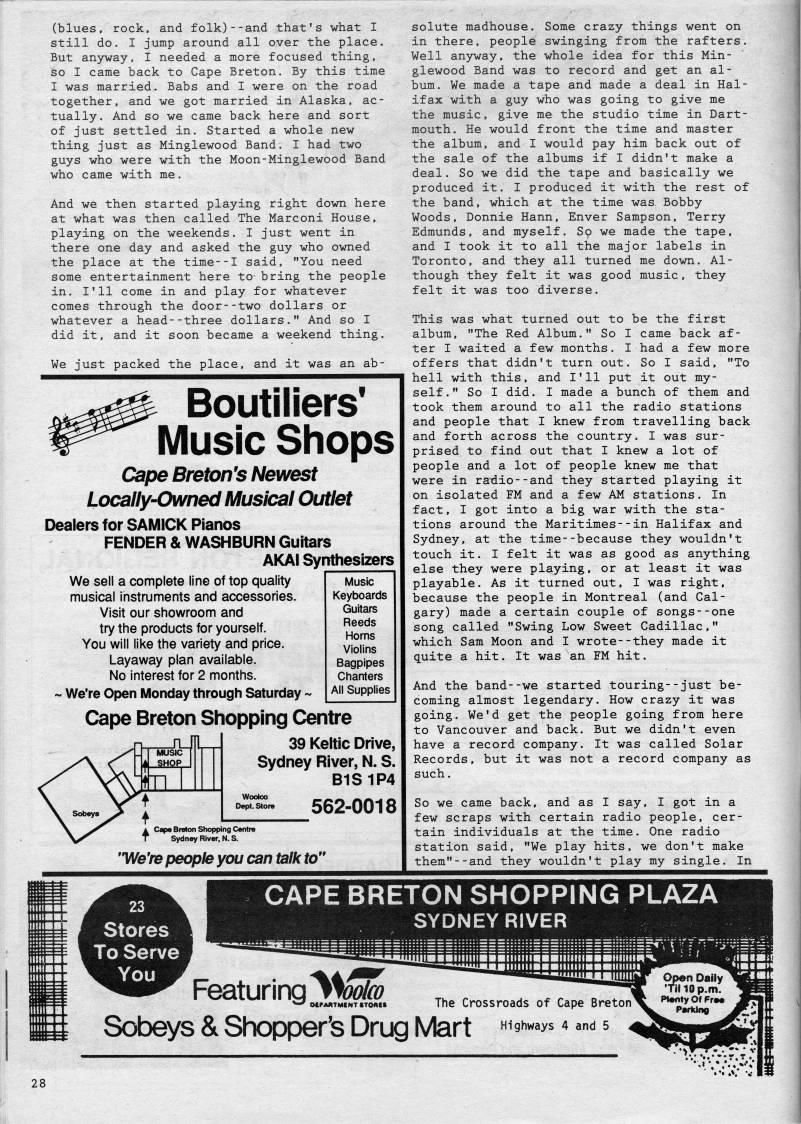 Published by Ronald Caplan on 1988/8/1 (437 reads)(blues, rock, and folk)--and that's what I still do. I jump around all over the place. But anjrway, I needed a more focused thing, so I came back to Cape Breton. By this time I was married. Babs and I were on the road together, and we got married in Alaska, ac? tually. And so we came back here and sort of just settled in. Started a whole new thing just as Minglewood Band. I had two guys who were with the Moon-Minglewood Band who came with me. And we then started playing right down here at what was then called The Marconi House, playing on the weekends. I just went in there one day and asked the guy who owned the place at the time--I said, "You need some entertainment here to bring the people in. I'll come in and play for whatever comes through the door--two dollars or whatever a head--three dollars." And so I did it, and it soon became a weekend thing. We just packed the place, and it was an ab- Boutiliers* Music Shops Cape Breton's Newest Locally-Owned Musical Outlet Dealers for SAMICK Pianos FENDER & WASHBURN Guitars AKAI Synthesizers We sell a complete line of top quality musical instruments and accessories. Visit our showroom and try the products for yourself. You will like the variety and price. Layaway plan available. No interest for 2 months. ~ We're Open Monday through Saturday Music Keyboards Guitars Reeds Horns Violins Bagpipes Chanters All Supplies Cape Breton Shopping Centre 39 Keltic Drive, Sydney River, N. S. B1S1P4 '' _562-0018 "We're people you can talk to" solute madhouse. Some crazy things went on in there, people swinging from the rafters. Well anyway, the whole idea for this Min? glewood Band was to record and get an al? bum. We made a tape and made a deal in Hal? ifax with a guy who was going to give me the music, give me the studio time in Dart? mouth. He would front the time and master the album, and I would pay him back out of the sale of the albums if I didn't make a deal. So we did the tape and basically we produced it. I produced it with the rest of the band, which at the time was. Bobby Woods, Donnie Hann, Enver Sampson, Terry Edmunds, and myself. So we made the tape, and I took it to all the major labels in Toronto, and they all turned me down. Al? though they felt it was good music, they felt it was too diverse. This was what turned out to be the first album, "The Red Album." So I came back af? ter I waited a few months. I had a few more offers that didn't turn out. So I said, "To hell with this, and I'll put it out my? self." So I did. I made a bunch of them and took them around to all the radio stations and people that I knew from travelling back and forth across the country. I was sur? prised to find out that I knew a lot of people and a lot of people knew me that were in radio--and they started playing it on isolated FM and a few AM stations. In fact, I got into a big war with the sta? tions around the Maritimes--in Halifax and Sydney, at the time--because they wouldn't touch it. I felt it was as good as anything else they were playing, or at least it was playable. As it turned out, I was right, because the people in Montreal (and Cal? gary) made a certain couple of songs--one song called "Swing Low Sweet Cadillac," which Sam Moon and I wrote--they made it quite a hit. It was an FM hit. And the band--we started touring--just be? coming almost legendary. How crazy it was going. We'd get the people going from here to Vancouver and back. But we didn't even have a record company. It was called Solar Records, but it was not a record company as such. So we came back, and as I say, I got in a few scraps with certain radio people, cer? tain individuals at the time. One radio station said, "We play hits, we don't make them"--and they wouldn't play my single. In Stores To Serve You mS' Featuring "'Wfl? Sobeys & Shopper's Drug Mart