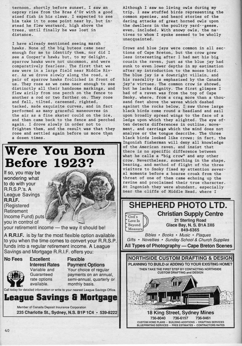 ternoon, shortly before sunset, I saw an osprey rise from the Bras d'Or with a good sized fish in his claws. I expected to see him take it to some point near by, but in? stead he flew westward, high above the trees, until finally he was lost in distance. I have already mentioned seeing marsh hawks. None of the big buteos came near enough for me to identify them, nor did I see a Cooper's hawki but, to my delight, sparrow hawks were not uncommon, and were comparatively fearless. The first that we saw were in a large field near Middle Riv? er. As we drove slowly along the road, a pair of sparrow hawks frolicked in front of us. They rose as we came near enough to see distinctly all their handsome markings, and flew airily from one perch on the fence to another a rod or two farther on. They rose and fell, tilted, careened, righted, tacked, made exquisite curves, and in fact performed as many graceful maneouvres in the air as a fine skater could on the ice, and then came back to the fence and perched again. I drove slowly in order not to frighten them, and the result was that they rose and settled again before us more than a dozen times. Were You Born Before 1923? if so, you may be wondering what to do with your R.R.S.P.'s.A League Savings R.R.I.F. (Registered Retirement Income Fund) puts you in control of '' ' '' your retirement income • the way it should be! A R.R.LF. is by far the most flexible option available to you when the time comes to convert your R.R.S.P. funds into a regular retirement income. A League Savings and Mortgage R.R.I.F. offers you: Flexible Payment Options Your choice of regular payments on an annual, semi-annual, quarterly or monthly basis. Call today for detailed information or write to your nearest League Savings Office. League Savings 8 Mortgage Member of Canada Deposit Insurance Corporation 235 Charlotte St., Sydney, N.S. B1P1C4 • 539-8222 No Fees Excellent interest Rates Variable and Guaranteed rate options available. Although I saw no living owls during my trip, I saw stuffed birds representing the common species, and heard stories of the daring attacks of great horned owls upon the dwellers in the poultry yard--geese, even, included. With snowy owls, the na? tives to whom I spoke seemed to be wholly unacquainted. Crows and blue jays were common in all sec? tions of Cape Breton, but the crow grew less interesting after I had met his big cousin the raven, just as the blue jay had sunk to even lower depths in my estimation after my introduction to the moose bird. The blue jay is a downright villain, and his rascality is emphasized by the Canada jay's virtues. The common crow is shrewd, but he lacks dignity. The first glimpse I had of a raven was from the top of Cape Smoky, where, from a crag more than a thou? sand feet above the waves which dashed against the rocks below, I saw three large black birds come round a headland and sail upon broadly spread wings to the face of a ledge upon which they alighted. The eye of? ten detects differences in outline, move? ment , and carriage which the mind does not analyze or the tongue describe. The three black birds looked like crows; in fact, the Ingonish fisherman will deny all knowledge of the American raven, and insist that there is no specific difference between what he calls a "big crow" and any other crow. Nevertheless, something in the shape, bearing, and method of flight of the three visitors to Smoky fixed my attention sever? al moments before a hoarse croak from the throat of one of them came echoing up the ravine and proclaimed their true character. At Ingonish they were abundant, especially near the cliffs of Middle Head, where I SHEPHERD PHOTO LTD. Christian Supply Centre 21 Sterling Road GlaceBay,N.S. B1A3X6 849-6365 Bibles • Books • !Ausic • Plaques Gifts * Novelties • Sunday School & Church Supplies All Types of Phiotography • Cape Breton Scenes PLANNING TO BUILD or ADDING TO YOUR EXISTING HOME? THEN TAKE THE FIRST STEP BY CONTACTING NORTHSIDE CUSTOM DRAFTING and DESIGN 18 King Street, Sydney i/llnes 736-8040 736-6157 736-9461 CUSTOM HOME PLANS • BUILDING ADDITIONS • DRAFTING SERVICES BLUEPRINTING SERVICES • FREE ESTIMATES • CONTRACTORS RATES
