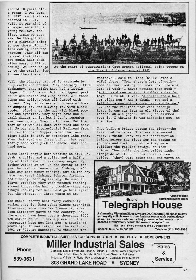 Published by Ronald Caplan on 1988/8/1 (310 reads)around 10 years old, I guess. I was born in 1892, and that was started in 1901. Well, it was kind of an experience to us young fellows, the first train we ever saw. We thought it was a glorious thing to see those old puf? fers coming into the station. They all ran by coal that time. You could hear them miles away, puffing, coming. We used to go up to the station just to see them there... At the gtart of constriACtipn; Cape Brgton Railrpad. PQint Tupper Qn the Strait of Canso. August 1901 Well, the biggest part of it was jmade by dump carts and horses. They hadv'i''ry little machinery. They might have had a little digger, I don't know. But the biggest part of it was horses and dump carts. All those dumps and hollows were all dumped with horses. They had dozens and dozens of hors? es dumping it. And blowing it, with black powder, blowing up the mud with black pow? der and dynamite. They might have had a small digger on it, but I don't remember ever seeing any. They could have. But the most of it was all done with pick and shov? el. So was the Intercolonial Railroad from Halifax to Point Tupper, when that was first built in 1880 or something like that. When that road was first built, that was mostly done with pick and shovel work and hand work. (Were local people here working on it?) Oh, yeah. A dollar and a dollar and a half a day at that time. It was cheap wages. My father worked at it. In the spring of the year he used to leave to go fishing--he'd make way more money fishing. Out in the bay here: mackerel fishing, lobster fishing, cod fishing, herring fishing. He used to leave. Probably they were through fishing around August--he had no trouble--they were always looking for men. He'd go back again for the winter.... Three years at it. The whole--pretty near every community worked onto it. From other places too--from Inverness, some from New Brunswick, some from different parts of the country. No, there must have been over a thousand, 15 00 men worked on it. I saw a piece (in the newspaper) here not long ago, a couple of years ago. It was taken from the railroad, 1901 or '02, at Hastings. "A thousand men wanted." I said to Clara (Billy James's wife) there, "God, there's lots of work-- some of them looking for work now--there's lots of work--I never noticed that much." "A thousand men wanted. A dollar a day for boys"- -1 think it was. "A dollar and a half for older men." And I think, "Two and a half for a man with a dump cart and horse!" ... For the railroad that went through here. It was cut from an old (issue of the) Record, an old paper. But I just skimmed over it, I thought it was happening now, at the time! They built a bridge across the river--the train had to cross. That was the second year, I think. They built a construction bridge across the river for the trains to go back and forth on, while they were building the regular bridge, an iron bridge. They built the iron bridge right alongside of it. But this construction bridge, (they) were going back and forth on Historic Open Fireplace Comfortable Dining Room Telegraph House A chanmng Victorian House, where Dr. Graham Bell chose to stay and royalty still chooses to dine, features rooms with period decor as well as modem motel units. Eiyoy home cooked meals in our licensed dining room, beside the warmth of open fires. Est. 1860 - Five Generations of the Dunlop Family Baddeck, Nova Scotia BOE 1 BO Telephone (902) 295-9988 COIVIPLETE INDUSTRIAL SUPPLIES FOR CONSTRUCTION ?? INDUSTRY ?? HOMEOWNERS Phone 539-0631 Miller industrial Sales rs' Complete Line of Hydraulic Hoses & Fittings ?? Honda Power Equipment Hand Tools, Saws, & Shovels ?? Stihl Power Saws ?? Rainwear Industrial V-Betts ?? Rope-Poly & Wirerope ?? Complete Paint Supplies 803 GRAND LAKE ROAD ?? SYDNEY & Service