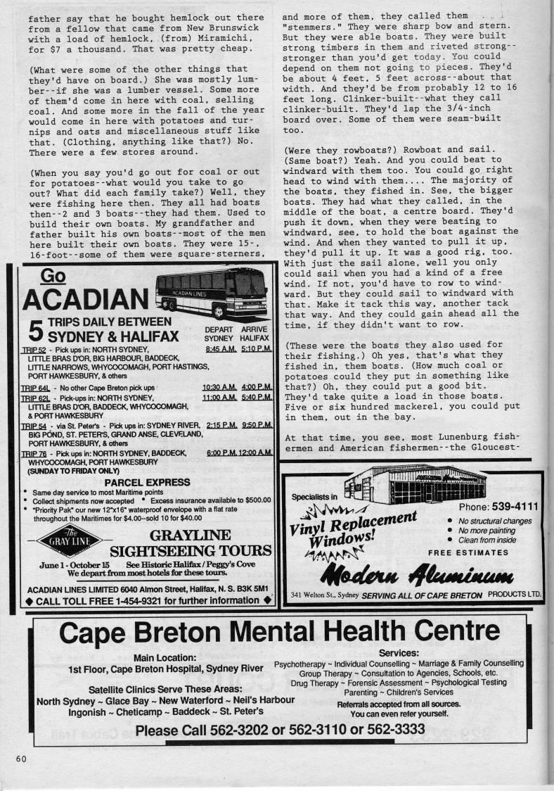Published by Ronald Caplan on 1988/8/1 (270 reads)father say that he bought hemlock out there from a fellow that came from New Brunswick with a load of hemlock, (from) Miramichi, for $7 a thousand. That was pretty cheap. (What were some of the other things that they'd have on board.) She was mostly lum? ber- -if she was a lumber vessel. Some more of them'd come in here with coal, selling coal. And some more in the fall of the year would come in here with potatoes and tur? nips and oats and miscellaneous stuff like that. (Clothing, anything like that?) No. There were a few stores around. (When you say you'd go out for coal or out for potatoes--what would you take to go out? What did each family take?) Well, they were fishing here then. They all had boats then--2 and 3 boats--they had them. Used to build their own boats. My grandfather and father built his own boats--most of the men here built their own boats. They were 15-, 16-foot--some of them were square-sterners, DEPART ARRIVE SYDNEY HALIFAX 8:45 A.M. 5:10 P.M.I Go ACADIAN STRIPS DAILY BETWEEN SYDNEY & HALIFAX TRIP 52 - Pick ups in: NORTH SYDNEY. LITTLE BRAS D'OR. BIG HARBOUR. BADDECK, LITTLE NARROWS. WHYCOCOMAGH. PORT HASTINGS. PORT HAWKESBURY. & others TRIP64L - No other Cape Breton pick ups 10:30 A.M. 4:00 P.M. TRIP62L - Pick-ups in: NORTH SYDNEY. 11:00 A.M. 5:40 P.M. LITTLE BRAS D'OR. BADDECK. WHYCOCOMAGH. & PORT HAWKESBURY RIP 54 - via St. Peter's - Pick ups in: SYDNEY RIVER. 2:15 P.M. 9:50 P.M BIG POND. ST. PETER'S, GRAND ANSE. CLEVELAND, PORT HAWKESBURY, & others TRIP 76 - Pick ups in: NORTH SYDNEY. BADDECK. 6:00 P.M. 12:00 A.M. WHYCOCOMAGH, PORT HAWKESBURY (SUNDAY TO FRIDAY ONLY) PARCEL EXPRESS Same day servk:e to most Maritime points Collect shipments now accepted * Excess Insurance available to $500.00 "Prfority Pak" our new 12"x16" waterproof envelope with aflat rate throughout the Maritimes for $4.00~sold 10 for $40.00 GRAYLINE SIGHTSEEING TOURS June 1 - October 15 See Historic Halifax / Peggy's Cove We depart from most hotels for these tours. ACADIAN LINES LIMITED 6040 Almon Street, Halifax, N. S. B3K 5M1 CALL TOLL FREE 1-454-9321 for further information and more of them, they called them i "stemmers." They were sharp bow and stern. But they were able boats. They were built strong timbers in them and riveted strong-- stronger than you'd get today. You could depend on them not going to pieces. They'd be about 4 feet, 5 feet across--about that width. And they'd be from probably 12 to 16 feet long. Clinker-built--what they call clinker-built. They'd lap the 3/4-inch board over. Some of them were seam-built too. (Were they rowboats?) Rowboat and sail. (Same boat?) Yeah. And you could beat to windward with them too. You could go right head to wind with them.... The majority of the boats, they fished in. See, the bigger boats. They had what they called, in the middle of the boat, a centre board. They'd push it down, when they were beating to windward, see, to hold the boat against the wind. And when they wanted to pull it up, they'd pull it up. It was a good rig, too. With just the sail alone, well you only could sail when you had a kind of a free wind. If not, you'd have to row to wind? ward. But they could sail to windward with that. Make it tack this way, another tack that way. And they could gain ahead all the time, if they didn't want to row. (These were the boats they also used for their fishing.) Oh yes, that's what they fished in, them boats. (How much coal or potatoes could they put in something like that?) Oh, they could put a good bit. They'd take quite a load in those boats. Five or six hundred mackerel, you could put in them, out in the bay. At that time, you see, most Lunenburg fish? ermen and American fishermen--the Gloucest- Specialists in ffruidows! 341 Welton St,. Sydney SERVING ALL OF CAPE BRETON PRODUCTS LTD. Phone:539-4111 • No structural changes • No nxire painting • Clean from inside FREE ESTIMATES Cape Breton Mental Health Centre Main Location: 1st Floor, Cape Breton Hospital, Sydney River Satellite Clinics Serve TTiese Areas: North Sydney ~ Glace Bay ~ New Waterford ~ Neil's Harbour ingonish ~ Cheticamp ~ Baddeck ~ St. Peter's Services: Psychotherapy ~ Individual Counselling ~ Marriage & Family Counselling Group Therapy ~ Consultation to Agencies, Schools, etc. Drug Tlierapy ~ Forensic Assessment ~ Psychological Testing Parenting ~ Children's Services Referrals accepted from all sources. You can even refer yourself. Please Call 562-3202 or 562-3110 or 562-3333