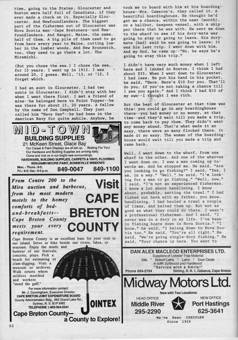 Published by Ronald Caplan on 1988/8/1 (270 reads)time, going to the States. Gloucester and Boston were half full of Canadians, if they ever made a check on it. Especially Glou? cester. And Newfoundlanders. The biggest part pf the fishermen out of Gloucester was Nova Scotia men--Cape Bretoners--and New? foundlanders. And Bangor, Maine, the same, half of them. A big pile of them used to go from here every year to Maine, cutting lum? ber in the lumber woods. And New Brunswick, too, they used to go there a lot. The Miramichi. (But you chose the sea.) I chose the sea, for 15 years. I went up in 1913. I was around 20, I guess. Well, '13, or '12, I forget which. I had an aunt in Gloucester. I had two aunts in Gloucester. I didn't stay with her when I went there first. I met a friend of mine--he belonged here to Point Tupper--he was there for about 15, 20 years. A fellow by the name of Dan Campbell. They just called him "Navy Dan"--he had been in the American Navy for quite awhile. Anyhow, he BUILDING SUPPLIES 21 McKeen Street, Glace Bay Our Carpet & Paint Displays are all set up... Waiting For You! Our Hardware and Building Supplies are arriving daily. Come and visit us in our bright new surroundings. HARDWARE, BUILDING SUPPLIES, CARPETS & VINYL FLOORING BENJAMIN MOORE PAINT, BONNEVILLE WINDOWS r'?s"t:tlp.m. 849-0047 849-1100 From Centre 200 to the Xfi''S* Mira auction and barbecue, VISII from the most modern '' _ r'i~ motels to the homey V'Ar't comforts of bed- and'breakfasts-- BRETON Cape Breton County meets your every ''''1 IMT'' requirement. '''' mm Cape Breton County is an excellent base for your visit to our island. Drive or hike beside our rivers, lakes, or seacoast. Enjoy the music and humour of our festivals, concerts, plays. Pick a beach for swimming or clam-digging. Visit a museum or archives. Walk streets where soldiers marched and workers "stood the gaff." For more information contact: Mr. J. Cunningham, Executive Director, CAPE BRETON JOINT EXPENDTTURE BOARD County Administration BIdg., 865 Grand Lake Rd., ?? ' ?? ai''m# Sydney, N.S.B1P6W2 lOINTEX TELEPHONE 1-902-564-5541 ? iWlll ?? mM Cape Breton County • a County to Explore! took me to board with him at his boarding- house- -Mrs. Cameron's, they called it. A beautiful boardinghouse. He thought he'd get me a chance, within the next (month), on a halibut, deepsea vessel, with a skip? per there that he was with. He sent me down to the wharf to see if his dory-mate was going to stay or going to leave. His dory- mate (had) said he was going to leave; it was his last trip. I went down with him. And my God, he came up--"No, he says he's going to stay this trip." I didn't have very much money when I left here and I landed in Boston. I think I had about $35. When I went down to Gloucester, I had less. He put his hand in his pocket, he said, "Here. Here's $10 for you. That'll do you, if you're not taking a chance till I see you again." And I think I had $10 of my own--I thought I was rich. But the best of Gloucester at that time was this: you could go in any boardinghouse there--you had money or no money, at that time--and they'd wait till you made a trip, to come back to pay them. They didn't want any money ahead. That's what made it so easy, there were so many flocked there. It made it so easy. The woman of the boarding? house would wait till you made a trip and came back. Well, I went down to the wharf, from one wharf to the other. And one of the wharves I went down on, I saw a man coming up to? wards me. And he stopped me. He said, "Are you looking to go fishing?" I said, "Yes, I am, in a way." "Well," he said, "I'm look? ing for a man to go fishing." "Well, now," I said, "I'm not an experienced fisherman. I know a lot about handlining. I know about, probably, setting the trawl." I had fished out here with my father, you know, handlining. I had hauled a trawl a couple of.times, and baited them up. But not as good as what they could do there. I wasn't a professional fisherman. And I said, "I never was in a dory in my life. I've been in fishing boats down in Nova Scotia." "I know," he said, "I belong down to Nova Sco? tia too." He said, "You're all right." He said, "We're going single-dory fishing." He said, "Your chance is here. You want to DAN ALEX MACLEOD ENTERPRISES LTD. Suppliers of Lobster Trap Material Sills * Bottom Laths * Laths * Door Cleats in both Softwood and Hardwood "Service with a Smile!" Phone 884-2794 Stirling, R. R. 1, Gabams, Cape Breton Midway Motors Ltd. Now with Two Locattons: HEAD OFFICE '' NEW OFFICE Middle River 'Sf Port Hastings 295-2290 ' • ' 625-3641 We've Been CHRYSLER Since 1926