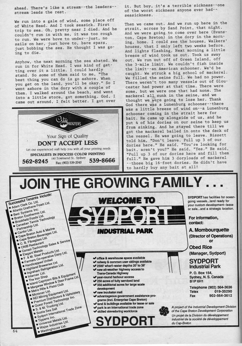 Published by Ronald Caplan on 1988/8/1 (248 reads)ahead. There's like a stream--the leaders-- stream leads the rest. We run into a gale of wind, some place off of White Head. And I took seasick. First trip to sea. Oh, pretty near I died. And he couldn't run in with me, it was too rough to run. We were hove to under--just, no sails on her, just hove to, bare spars, just bobbing the sea. He thought I was go? ing to die. Anyhow, the next morning the sea abated. We run in for White Head. I was kind of get? ting over it a little. I could hardly stand. So some of them said to me, "The best thing you can do is go ashore. When you get on the land, you'll be okay." So I went ashore in the dory with a couple of them. I walked around the beach, and went into a little store, got something. God, I came out around, I felt better. I got over Your Sign of Quality DON'T ACCEPT LESS Let our experienced staff help you with all your printing needs SPECIALISTS IN PROCESS COLOR PRINTING 562-8245 Fax:(902)539-2040 539-8666 it. But boy, it's a terrible sickness--one of the worst sickness anyone ever had-- seasickness. Then we came out. And we run up here in the strait, across by Sand Point, that night. And we were going to come over here (Evans? ton, Cape Breton) in the dory in the morn? ing, home. I could see the houses. Walkers' houses, that I only left two weeks before. And lights flashing.. Next morning a little breeze of wind took us out. Took us away out. We run out off of Green Island, off the 3-mile limit. We couldn't fish inside the limit--an American schooner. We'd be caught. We struck a big school of mackerel. We filled the seine full. We had no power. There weren't too many vessels out of Glou? cester had power at that time. There were some, but we were one that had none. The mackerel all sunk in the seine, and we thought we we|:e going to lose her. Thank God there was a Lunenburg schooner--there was a little breeze of wind on--a Lunenburg schooner coming in the strait here for bait. He came up alongside of us, and he put 4 of his dories on our seine to keep us from sinking. And he stayed there till we got the mackerel bailed in onto the deck of the vessel. He was going to leave. Bissett told him, "Don't leave. Pull up 3 of our dories here." He said, "You're looking for bait, aren't you?" He said, "Yes." He said, "Pull up 3 of our dories here and fill them full." He gave him 3 doryloads of mackerel "-those big 16-foot dories. He didn't have to hardly buy any bait at all! JOIN THE GROWING FAMILY ... WELCOME TO MDUSTRULPUnC 1' office & warehouse space available • / railway & common user sidings available • / 2500' wharf-water depths 20' to 38' ' new all-weather highway access to Trans-Canada Highway ?/ year-round harbour access ?/ 250 acres of fully serviced land ?/ 350 additional acres for large scale development ?/ new incubator mall ?/ advantageous government assistance pro? grams (incl. Enterprise Cape Breton) • ' land & buildings available for lease or sale • / park is an international trade zone */ skilled stevedoring workforce SYDPORT SYDPORT has facilities for ocean? going vessels...land ready for your custom development-lease or sale...and a strategic location. For information, contact: A. Mombourquette (Dh-ector of Operations) or /ObedRice (Manager, Sydport) SYDPORT Industrial Park p. O. BOX 154, Sydney, N. S. Canada B1P6H1 Telephone (902) 564-3636 Telex 019-35290 Fax 902-564-3612 A project of the Industrial Development Division of the Cape Breton Development Corporation Un projet de la Division du developpement industriel de la societe de developpement du Cap-Breton T