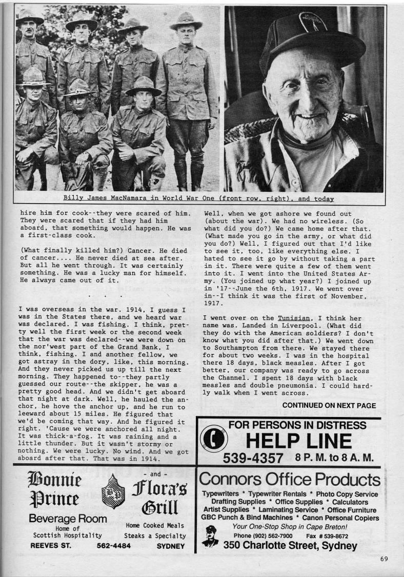 Published by Ronald Caplan on 1988/8/1 (200 reads)hire him for cook--they were scared of him. They were scared that if they had him aboard, that something would happen. He was a first-class cook. (What finally killed him?) Cancer. He died of cancer.... He never died at sea after. But all he went through. It was certainly something. He was a lucky man for himself. He always came out of it. I was overseas in the war. 1914, I guess I was in the States there, and we heard war was declared. I was fishing. I think, pret? ty well the first week or the second week that the war was declared--we were down on the nor'west part of the Grand Bank, I think, fishing. I and another fellow, we got astray in the dory, like, this morning. And they never picked us up till the next morning. They happened to--they partly guessed our route--the skipper, he was a pretty good head. And we didn't get aboard that night at dark. Well, he hauled the an? chor, he hove the anchor up, and he run to leeward about 15 miles. He figured that we'd be coming that way. And he figured it right. 'Cause we were anchored all night. It was thick-a-fog. It was raining and a little thunder. But it wasn't stormy or nothing. We were lucky. No wind. And we got aboard after that. That was in 1914. Well, when we got ashore we found out (about the war). We had no wireless. (So what did you do?) We came home after that. (What made you go in the army, or what did you do?) Well, I figured out that I'd like to see it, too, like everything else. I hated to see it go by without taking a part in it. There were quite a few of them went into it. I went into the United States Ar? my. (You joined up what year?) I joined up in '17--June the 6th, 1917. We went over in--I think it was the first of November, 1917. I went over on the Tunisian. I think her name was. Landed in Liverpool. (What did they do with the American soldiers? I don't know what you did after that.) We went down to Southampton from there. We stayed there for about two weeks. I was in the hospital there 18 days, black measles. After I got better, our company was ready to go across the Channel. I spent 18 days with black measles and double pneumonia. I could hard? ly walk when I went across. CONTINUED ON NEXT PAGE FOR PERSONS IN DISTRESS HELP LINE 539-4357 8p.m.to8A.M. prince and (??till Beverage Room ' . .. u i Scottish Hospitality Steaks a Specialty REEVES ST. 562-4484 SYDNEY Connors Office Products Typewriters * Typewriter Rentals * Photo Copy Service Drafting Supplies * Office Supplies * Calculators Artist Supplies * Laminating Service * Office Furniture GBC Punch & Bind Machines * Canon Personal Copiers A Your One-Stop Shop in Cape Breton I '' Phone (902) 562-7900 Fax # 539-8672 ' 350 Charlotte Street, Sydney