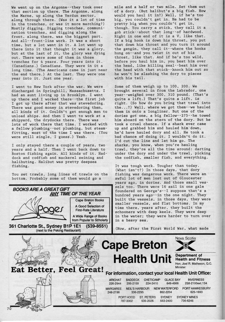 Published by Ronald Caplan on 1988/8/1 (227 reads)We went up on the Argonne--they took over that section up there. The Argonne, along the Marne, up along the Verdun sector, along through there. (Was it a lot of time in the trenches, or was it more marching?) Mostly digging. Digging trenches, communi? cation trenches, and digging along the front, along there, was the biggest part. And all--front-line work. It was a short time, but a lot went in it. A lot went up there into it that thought it was a glory, but at the last of it, the glory was dying out. There were some of them in those trenches for 4 years. Four years into it. (Canadians.) Canadians. They were in it a long time. (The Americans came in just near the end there.) At the last. They were one year into it. Just one year. I went to New York after the war. We were discharged in Springhill, Massachusetts. I had an aunt living up in Brooklyn. I went up there and I worked there--the first job I got up there after that was stevedoring. There was good money in stevedoring then, all kinds of it. Couldn't get enough men to unload ships. And then I went to work at a shipyard, the drydocks there. There was lots of work there that time. I worked with a fellow plumbing--not plumbing, but steam- fitting, most of the time I was there. (You were still single, I guess.) Yeah. I only stayed there a couple of years, two years and a half. Then I went back down to Boston fishing again. All kinds of it. Had? dock and codfish and mackerel seining and halibuting. Halibut was pretty deepsea fishing. You set trawls, long lines of trawls on the bottom. Probably some of them would go a BOOKS ARE A GREAT GIFT ANY TIME OF THE YEAR Cape Breton Books • A Good Selection of First-Rate literature • A Wide Range of Bool