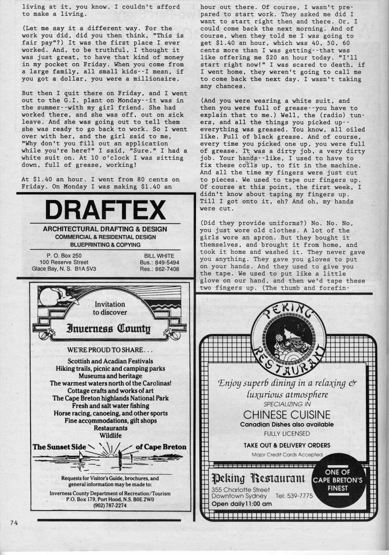 living at it, you know. I couldn't afford to make a living. (Let me say it a different way. For the work you did, did you then think, "This is fair pay"?) It was the first place I ever worked. And, to be truthful, I thought it was just great, to have that kind of money in my pocket on Friday. When you come from a large family, all small kids--I mean, if you got a dollar, you were a millionaire. But then I quit there on Friday, and I went out to the G.I. plant on Monday--it was in the summer--with my girl friend. She had worked there, and she was off, out on sick leave. And she was going out to tell them she was ready to go back to work. So I went over with her, and the girl said to me, "Why don't you fill out an application while you're here?" I said, "Sure." I had a white suit on. At 10 o'clock I was sitting down, full of grease, working! At $1.40 an hour. I went from 80 cents on Friday. On Monday I was making $1.40 an DRAFTEX ARCHITECTURAL DRAFTING & DESIGN COMMERCIAL & RESIDENTIAL DESIGN BLUEPRINTING & COPYING P. O. Box 250 100 Reserve Street Glace Bay, N. S. B1A5V3 BILL WHITE Bus.: 849-5494 Res.: 862-7408 WE'RE PROUD TO SHARE... Scottish and Acadian Festivals Hiking trails, picnic and camping parks Museums and heritage The warmest waters north of the Carolinas! Cottage crafts and works of art The Cape Breton highlands National Park Fresh and salt water fishing Horse racing, canoeing, and other sports Fine accprnmodations, gift shops Restaurants Wildlife The Sunset Side of Cape Breton Requests for Visitor's Guide, broctiures, and general information may be made to: Inverness County Department of Recreation/Tourism P.O. Box 179. Port Hood, N.S. BOE 2W0 (902)787-2274 hour out there. Of course, I wasn't pre? pared to start work. They asked me did I want to start right then and there. Or, I could come back the next morning. And of course, when they told me I was going to get $1.40 an hour, which was 40, 50, 60 cents more than I was getting--that was like offering me $20 an hour today. "I'll start right now!" I was scared to death, if I went home, they weren't going to call me to come back the next day. I wasn't taking any chances. (And you were wearing a white suit, and then you were full of grease--you have to explain that to me.) Well, the (radio) tun? ers, and all the things you picked up-- everything was greased. You know, all oiled like. Full of black grease. And of course, every time you picked one up, you were full of grease. It was a dirty job, a very dirty job. Your hands--like, I used to have to fix these cdlls up, to fit in the machine. And all the time my fingers were just cut to pieces. We used to tape our fingers up. Of course at this point, the first week, I didn't know about taping my fingers up. Till I got onto it, eh? And oh, my hands were cut. (Did they provide uniforms?) No. No. No, you just wore old clothes. A lot of the girls wore an apron. But they bought it themselves, and brought it from home, and took it home and washed it. They never gave you anything. They gave you gloves to put on your hands. And they used to give you the tape. We used to put like a little glove on our hand, and then we'd tape these two fingers up. (The thumb and forefin- "Enjoy superS dining in a re[a?(ing & iuTQirious atmospfiere SPECIALIZING IN CHINESE CUISINE Canadian Dishes also available FULLY LICENSED TAKE OUT & DELIVERY ORDERS Major Credit Cards Accepted ilekjng Hestaurant 355 Charlotte Street Dov/r'town Sydney Tel: 539-7775 Open daily] 1:00 am ONE OF } CAPE BRETON'S FINEST i U ''