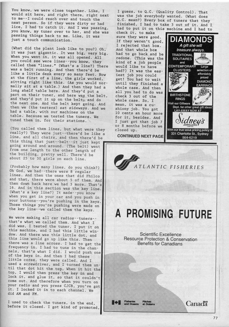You know, we were close together. Like, I would sit here, and right there, right next to me--I could reach over and touch the next person. So if they were dirty or had lice, I had to catch it. And I was passing, you know, my tuner over to her, and she was passing things back to me. Like, it was just a touch communication. (What did the plant look like to you?) Oh, it was just gigantic. It was big, very big. When you went in, it was all opened. All you could see were lines--you know, they called them "lines." (What's a line?) There was a belt running. And then there'd be like a little desk every so many feet. Now at the first of a line, the girls worked, sitting right like this. (As you would nor? mally sit at a table.) And then they had a long shelf table here. And they'd put a part on their tuner, and here was the belt, and they'd put it up on the belt, and do the next one. And the belt kept going. And then we (the testers) sat sideways. And we had a table, with our machines on the table. Because we tested the tuners. We tuned them in, for their stations. (You called them lines, but what were they really?) They were just--there'd be like a line, and all chairs, and then there'd be this thing that just--belt--it just kept going around and around. (The belt) went from one length to the other length of the building, pretty well. There'd be about 25 to 30 girls on each line. (Probably how many lines, do you think?) Oh God, we had--there were 8 regular lines. And then the ones that did Philco and that, there were about 5 of them. And then down back here we had 3 more. That's 16. And in this section was the key line. (What's a key line?) It made--you know when you get in your car and you push in your buttons--you're pushing in the keys. Those things you're pushing were made on the key line--we called them the keys. We were making all car radios--tuners-- that's what we called them. And what I did was, I tested the tuner. I put it on this machine, and I had this little win? dow. And there was this little dot, and this line would go up like this. Then there was a line across. I had to get the frequency in. I had to tune in the chan? nels, that's what I did. I would push one of the keys in. And then I had these little cores, they were called. And I used a screwdriver, and I turned them un? til that dot hit the top. When it hit the top, I would then press the key in and lock it, and glue it, so that it couldn't come out. And therefore when you turn on your radio and you press CJCB, you've got it. I locked it in to each channel. We did AM and FM. I used to check the tuners, in the end, before it closed. I got kind of promoted, I guess, to Q.C. (Quality Control). That was the job everybody wanted. (What does Q.C. mean?) Every box of tuners that they finished, I had to take 3 out of it. And I had to put it on this machine and I had to check it, to make sure they were good. If they weren't good, I rejected that box. And that whole box had to go back and be redone. (This was the kind of a job people would like to have had?) It was the eas? iest job you could get! You had to wait until they finished a whole case. And then all you had to do was check 3 out of the whole case. So, I mean, it was a cu? shiony job. You got 10 cents an hour more for it, besides. And I just got that job 7 or 8 months before we closed up. CONTINUED NEXT PAGE ATLANTIC FISHERIES A PROMISING FUTURE Scientific Excellence Resource Protection & Conservation Benefits for Canadians ! ! ' Canada