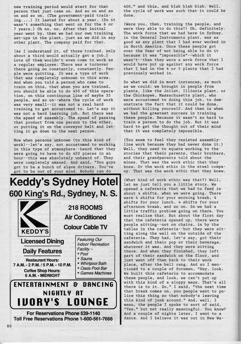 new training period would start for that person that just came on. And so on and so on and so on. (The government-paid train? ing....) It lasted for about a year. (So it wasn't something that went on for the 6 or 7 years.) Oh no, no. After that initial year went by, then we had our own training set-ups in the plant, just as we did in any other plant. The company paid for that. (As I understand it, of those trained, only about a third would actually get a job.) Lots of them wouldn't even come to work as a regular employee. There was a turnover there going on constantly, constantly. Peo? ple were quitting. It was a type of work that was completely unknown to this area. And when you told a person who came to train on this, that when you are trained, you should be able to do 450 of this opera? tion, on this continuous line of maybe 35 people, and so on--where the cycle of work was very small--it was not a real hard training to get accustomed to. Let's say it was not a hard learning job. But there was the speed of assembly. The speed of passing that product from one person to the other, or putting it on the conveyor belt and let? ting it go down to the next person. Now when persons unknown (to this kind of work)--let's say, not accustomed to working in this type of atmosphere--heard that they were going to have to do 450 pieces in an hour--this was absolutely unheard of. They were completely amazed. And said, "You guys got to be a bunch of slave drivers. You've got to be out of your mind. Nobody can do Keddy's Sydney Hotel 600 King's Rd., Sydney, N. S. KEDDY'S 218 ROOMS Air Conditioned Colour Cable TV Licensed Dining Daily Features Restaurant Hours: 7 A.M. - 2 P.M. / 5 P.M. -10 P.M. Coffee Shop Hours: 6 A.M. - MIDNIGHT Featuring Our Indoor Recreation Facility - ''Pool ? Sauna ? Whirlpool Bath ? Oasis Pool Bar o Games Machines ENTERTRINMENT & DRNCING NIGHTLY RT lUORV'S LOUNGE For Reservations Phone 539-1140 Toll Free Reservations Phone 1-800-561-7666 400," and this, and blah blah blah. Well, the cycle of work was such that it could be done. (Were you, then, training the people, and were they able to do this?) Oh, definitely. The work force that we had here in Sydney, in the General Instruments plant, was as good as any plant that I had ever worked in in North America. Once these people got over the fear of not being able to do it because it was "impossible"--which it wasn't--then they were a work force that I would have put up against any work force that I had in the 4 or 5 plants that I had previously worked in. So what we did in most instances, as much as we could: we brought in people from plants, like the Joliet, Illinois plant, or the Chickopee, Massachusetts plant, who were accustomed to doing this job, to dem? onstrate the fact that it could be done, without killing yourself. And then is when we had the greatest success in training these people. Because it wasn't so hard to train a person to do the job. But it was hard to get the thought out of their mind that it was completely impossible. (You seem to feel they resisted assembly- line work because they had never done it.) Well, they used to equate working to the stories that their parents, their brothers, and their grandparents told about the mines. That was the work ethic that they knew. Or the work ethic in the steel compa? ny. That was the work ethic that they knew. (What kind of work ethic was that?) Well, let me just tell you a little story. We opened a cafeteria that we had to feed in about 4 shifts, when we were going. There were 4 shifts for your morning break, 4 shifts for your lunch, 4 shifts for your afternoon break, and so on. So we had a little traffic problem going on there. You must realize that. But about the first day that the cafeteria opened up, there were people sitting--not on chairs, in by the tables in the cafeteria--but they were sit? ting along the wall on the outside of the cafeteria. They had, let's say, got their sandwich and their pop or their beverage, whatever it was. And they were sitting there. And when they finished, they left part of their sandwich on the floor, and just went off then back to their work place, after the bell rang. And so I men? tioned to a couple of foremen, "Hey, look. We built this cafeteria to accommodate these people, and look, we can't put up with this kind of a sloppy mess. That's all there is to it. So," I said, "the next time that break comes on, you people want to po? lice this thing so that nobody's leaving this kind of junk around." And, well, I mean, the people I spoke to sort of said, "Yes," but not really meaningful. You know? And a couple of nights later, I went to a dance. And I believe it was out in New Wa-