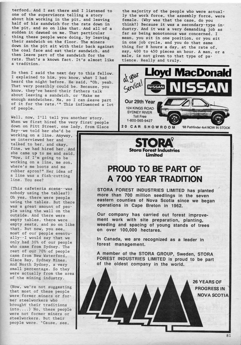 terford. And I sat there and I listened to one of the supervisors telling a story about him working in the pit, and leaving half of his sandwich for the rats down in the pit, and so on like that. And all of a sudden it dawned on me. That particular thing these people were doing, by leaving their sandwich on the floor. The miners down in the pit sit with their back against the coal face and eat their sandwich, and then leave part of the sandwich for the rats. That's a known fact. It's almost like a tradition. So then I said the next day to this fellow. I explained to him, you know, what I had heard the night before. He said, "Oh, yeah. That very possibly could be. Because, you know, they've heard their fathers talk about leaving a sandwich, or 'Make me enough sandwiches. Ma, so I can fleave part of it for the rats.'" This influenced a lot of people. Well, now, I'll tell you another story. When we first hired the very first people down on Pitt Street, one lady, from Glace Bay--we told her she'd be working on a line. Anyway, we interviewed her and talked to her, and okay, fine, we had hired her. And she came up to me and said, "Now, if I'm going to be working on a line, me son, where's me boots and me rubber apron?" Her idea of a line was a fish-cutting line. You see? the majority of the people who were actual? ly the work force, the assembly force, were female. (Why was that the case, do you think?) Because it was a secondary-type in? dustry. And it was a very demanding job as far as being monotonous was concerned. I mean, you sit in one position, or you sit in one job cycle, and you do that same thing for 8 hours a day, at the rate of, say, 400 to 450 pieces an hour. A man, or a male, is not given to that type of pa? tience. Really and truly. (This cafeteria scene--was nobody using the tables?) Oh yes, there were people using the tables. But there was a great amount of peo? ple using the wall on the outside. And there were empty tables, there were empty seats, and so on like that. But now, you see, most of our people eventu? ally- -I would say that we only had 3 0% of our people who came from Sydney. The rest of our 70% of people came from New Waterford, Glace Bay, Sydney Mines. And North Sydney, a very small percentage. So they were actually from the area of the mining industry. (Now, we're not suggesting that most of these people were former miners or for? mer steelworkers who brought their traditions into....) No, these people were not former miners or steelworkers. But their people were. 'Cause, see, '', c'''' Uoyd MacDonald ' NISSAN Our 29th Year 124 KINGS ROAD SYDNEY RIVER Toll Free 1-800-565-9427 20 CAR SHOWROOM '88 Pathfinder 4x4 NOW IN STOCK STORA Stora Fbresfl- Industries Limiteci PROUD TO BE PART OF A 700 YEAR TRADITION STORA FOREST INDUSTRIES LIMITED has planted more than 700 million seedlings in the seven eastern counties of Nova Scotia since we began operations in Cape Breton in 1962. Our company has carried out forest improve? ment work with site preparation, planting, weeding and spacing of young stands of trees on over 100,000 hectares. In Canada, we are recognized as a leader in forest management. A member of the STORA GROUP, Sweden, STORA FOREST INDUSTRIES LIMITED is proud to be part of the oldest company in the world. 26 YEARS OF PROGRESS IN NOVA SCOTIA