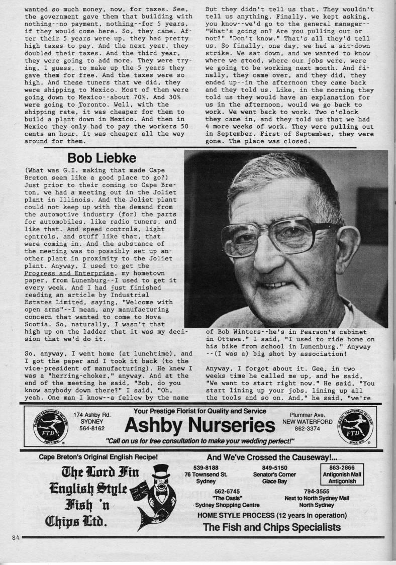wanted so much money, now, for taxes. See, the government gave them that building with nothing--no payment, nothing--for 5 years, if they would come here. So, they came. Af? ter their 5 years were up, they had pretty high taxes to pay. And the next year, they doubled their taxes. And the third year, they were going to add more. They were try? ing, I guess, to make up the 5 years they gave them for free. And the taxes were so high. And these tuners that we did, they were shipping to Mexico. Most of them were going down to Mexico--about 70%. And 30% were going to Toronto. Well, with the shipping rate, it was cheaper for them to build a plant down in Mexico. And then in Mexico they only had to pay the workers 50 cents an hour. It was cheaper all the way around for them. But they didn't tell us that. They wouldn't tell us anything. Finally, we kept asking, you know--we'd go to the general manager-- "What's going on? Are you pulling out or not?" "Don't know." That's all they'd tell us. So finally, one day, we had a sit-down strike. We sat down, and we wanted to know where we stood, where our jobs were, were we going to be working next month. And fi? nally, they came over, and they did, they ended up--in the afternoon they came back and they told us. Like, in the morning they told us they would have an explanation for us in the afternoon, would we go back to work. We went back to work. Two o'clock they came in, and they told us that we had 4 more weeks of work. They were pulling out in September. First of September, they were gone. The place was closed. Bob Liebke (What was G.I. making that made Cape Breton seem like a good place to go?) Just prior to their coming to Cape Bre? ton, we had a meeting out in the Joliet plant in Illinois. And the-Joliet plant could not keep up with the demand from the automotive industry (for) the parts for automobiles, like radio tuners, and like that. And speed controls, light cpntrols, and stuff like that, that were coming in. And the substance of the meeting was to possibly set up an? other plant in proximity to the Joliet plant. Anyway, I used to get the Progress and Enterprise, my hometown paper, from Lunenburg--I used to get it every week. And I had just finished reading an article by Industrial Estates Limited, saying, "Welcome with open arms"--I mean, any manufacturing concern that wanted to come to Nova Scotia. So, naturally, I wasn't that high up on the ladder that it was my deci sion that we'd do it. So, anyway, I went home (at lunchtime), and I got the paper and I took it back (to the vice-president of manufacturing). He knew I was a "herring-choker," anyway. And at the end of the meeting he said, "Bob, do you know anybody down there?" I said, "Oh, yeah. One man I know--a fellow by the name of Bob Winters--he's in Pearson's cabinet in Ottawa." I said, "I used to ride home on his bike from school in Lunenburg." Anyway --(I was a) big shot by association! Anyway, I forgot about it. Gee, in two weeks time he called me up, and he said, "We want to start right now." He said, "You start lining up your jobs, lining up all the tools and so on. And," he said, "we're Your Prestige Florist for Quality and Service Ashby Nurseries Plummer Ave, NEW WATERFORD 862-3374 'C'all on us tor free consultation to make your wedding perfect!' Cape Breton's Original English Recipe! 863-2866 Antigonish Mall Antigonish And We've Crossed the Causeway!, 539-8188 849-5150 76 Townsend St. Senator's Comer Sydney Glaoe Bay 562-6745 794-3555 "The Oasis" Next to North Sydney Mall Sydney Shopping Centre North Sydney HOME STYLE PROCESS (12 years in operation) The Fish and Chips Specialists