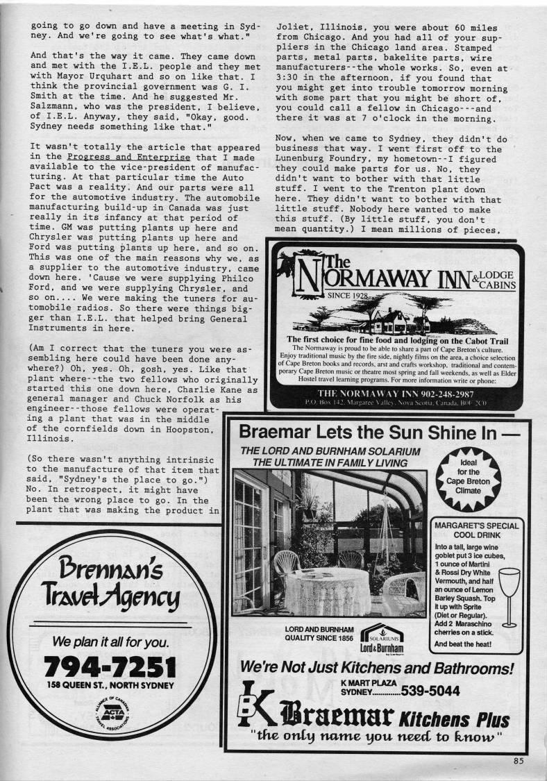 going to go down and have a meeting in Syd? ney. And we're going to see what's what." And that's the way it came. They came down and met with the I.E.L. people and they met with Mayor Urquhart and so on like that. I think the provincial government was G. I. Smith at the time. And he suggested Mr. Salzmann, who was the president, I believe, of I.E.L. Anyway, they said, "Okay, good. Sydney needs something like that." It wasn't totally the article that appeared in the Progress and Enterprise that I made available to the vice-president of manufac? turing. At that particular time the Auto Pact was a reality. And our parts were all for the automotive industry. The automobile manufacturing build-up in Canada was just really in its infancy at that period of time. GM was putting plants up here and Chrysler was putting plants up here and Ford was putting plants up here, and so on. This was one of the main reasons why we, as a supplier to the automotive industry, came down here. 'Cause we were supplying Philco Ford, and we were supplying Chrysler, and so on.... We were making the tuners for au? tomobile radios. So there were things big? ger than I.E.L. that helped bring General Instruments in here. (Am I correct that the tuners you were as? sembling here could have been done any? where?) Oh, yes. Oh, gosh, yes. Like that plant where--the two fellows who originally started this one down here, Charlie Kane as general manager and Chuck Norfolk as his engineer--those fellows were operat ing a plant that was in the middle of the cornfields down in Hoopston, Illinois. Joliet, Illinois, you were about 60 miles from Chicago. And you had all of your sup? pliers in the Chicago land area. Stamped parts, metal parts, bakelite parts, wire manufacturers--the whole works. So, even at 3:30 in the afternoon, if you found that you might get into trouble tomorrow morning with some part that you might be short of, you could call a fellow in Chicago and there it was at 7 o'clock in the morning. Now, when we came to Sydney, they didn't do business that way. I went first off to the Lunenburg Foundry, my hometown--I figured they could make parts for us. No, they didn't want to bother with that little stuff. I went to the Trenton plant down here. They didn't want to bother with that little stuff. Nobody here wanted to make this stuff. (By little stuff, you don't mean quantity.) I mean millions of pieces. (So there wasn't anything intrinsic to the manufacture of that item that said, "Sydney's the place to go.") No. In retrospect, it might have been the wrong place to go. In the plant that was making the product in TrAveAgef)Ci) We plan it all for you. 794-7251 158 QUEEN ST., NORTH SYDNEY f ACTA* IQRMAWAYINN4S The first choice for fine food and lodging on the Cabot Trail The Normaway is proud to be able to share a part of Cape Breton's culture. Enjoy traditional music by the fire side, nightly films on the area, a choice selection of Cape Breton books and records, arst and crafts workshop, traditional and contem? porary Cape Breton music or theatre most spring and fall weekends, as well as Elder Hostel travel learning programs. For more information write or phone: '. NORMAWAY INN 902-248-2987 Braemar Lets the Sun Shine In • THE LORD AND BURNHAM SOLARIUM THE ULTIMATE IN FAMIL Y LIVING LORD AND BURNHAM QUALITY SINCE 1856 MARGARET'S SPECIAL COOL DRINK Into a tall, large wine goblet put 3 ice cubes, 1 ounce of Martini & Rossi Dry White f'' Vermouth, and half an ounce of Lemon Barley Squash. Top it up with Sprite (Diet or Regular). Add 2 Maraschino cherrtes on a stick. And beat the heat! U Lonl&Burniiam; We're Not Just Kitchens and Bathrooms! KMART PLAZA W KMARTPLAZA _'' --*-- T' SYDNEY 539-5044 'Mvntmnt Kitchens Plus "the only name you need to h'now"