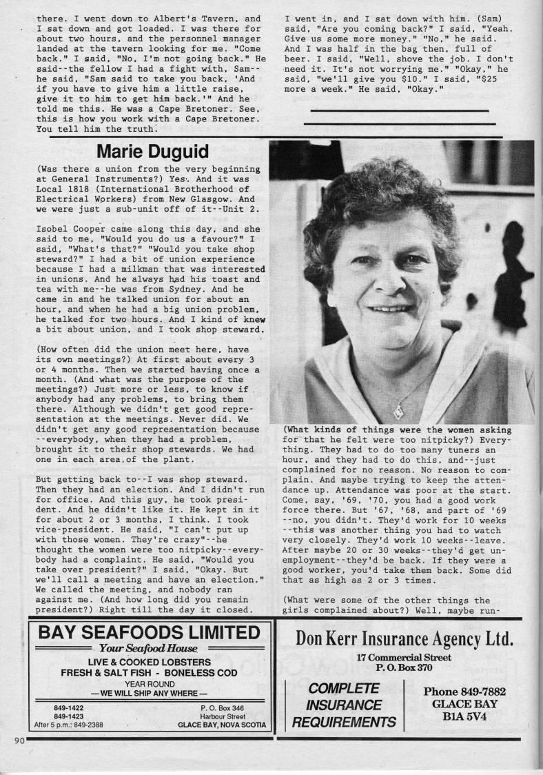 there. I went down to Albert's Tavern, and I sat down and got loaded. I was there for about two hours, and the personnel manager landed at the tavern looking for me. "Come back." I said, "No, I'm not going back." He said--the fellow I had a fight with, Sam-- he said, "Sam said to take you back, 'And if you have to give him a little raise, give it to him to get him back.'" And he told me this. He was a Cape Bretoner. See, this is how you work with a Cape Bretoner. You tell him the truth'. I went in, and I sat down with him. (Sam) said, "Are you coming back?" I said, "Yeah. Give us some more money." "No," he said. And I was half in the bag then, full of beer. I said, "Well, shove the job. I don't need it. It's not worrying me." "Okay," he said, "we'll give you $10." I said, "$25 more a week." He said, "Okay." Marie Duguid (Was there a union from the very beginning at General Instruments?) Yes-. And it was Local 1818 (International Brotherhood of Electrical Wprkers) from New Glasgow. And we were just a sub-unit off of it--Unit 2. Isobel Cooper came along this day, and she said to me, "Would you do us a favour?" I said, "What's that?" "Would you take shop steward?" I had a bit of union experience because I had a milkman that was interested in unions. And he always had his toast and tea with me--he was from Sydney. And he came in and he talked union for about an hour, and when he had a big union problem, he talked for two h6urs. And I kind of knew a bit about union, and I took shop steward. (How often did the union meet here, have its own meetings?) At first about every 3 or 4 months. Then we started having once a month. (And what was the purpose of the meetings?) Just more or less, to know if anybody had any problems, to bring them there. Although we didn't get good repre? sentation at the meetings. Never did. We didn't get any good representation because --everybody, when they had a problem, brought it to their shop stewards. We had one in each area.of the plant. But getting back to--I was shop steward. Then they had an election. And I didn't run for office. And this guy, he took presi? dent. And he didn't like it. He kept in it for about 2 or 3 months, I think. I took vice-president. He said, "I can't put up with those women. They're crazy"--he thought the women were too nitpicky--every? body had a complaint. He said, "Would you take over president?" I said, "Okay. But we'll call a meeting and have an election." We called the meeting, and nobody ran against me. (And how long did you remain president?) -Right till the day it closed. for Liiac he j.exi. were Luo nj-tpicky .-'; r-very- thing. They had to do too many tuners an hour, and they had to do this, and--just complained for no reason. No reason to com? plain. And maybe trying to keep the atten? dance up. Attendance was poor at the start. Come, say, '69, '70, you had a good work force there. But '67, '68, and part of '69 --no, you didn't. They'd work for 10 weeks --this was another thing you had to watch very closely. They'd work 10 weeks--leave. After maybe 20 or 30 weeks--they'd get un? employment- -they 'd be back. If they were a good worker, you'd take them back. Some did that as high as 2 or 3 times. (What were some of the other things the girls complained about?) Well, maybe run- BAY SEAFOODS LIMITED ===== Your Seafood House = LIVE & COOKED LOBSTERS FRESH & SALT FISH - BONELESS COD YEAR ROUND • WE WILL SHIP ANY WHERE • 849>1422 849-1423 After 5 p.m.: 849-2388 P. O. Box 346 Harbour Street GLACE BAY, NOVA SCOTIA Don Kerr Insurance Agency Ltd. 17 Commercial Street P.O. Box 370 COMPLETE INSURANCE REQUIREMENTS Phone 849-7882 GLACE BAY B1A5V4