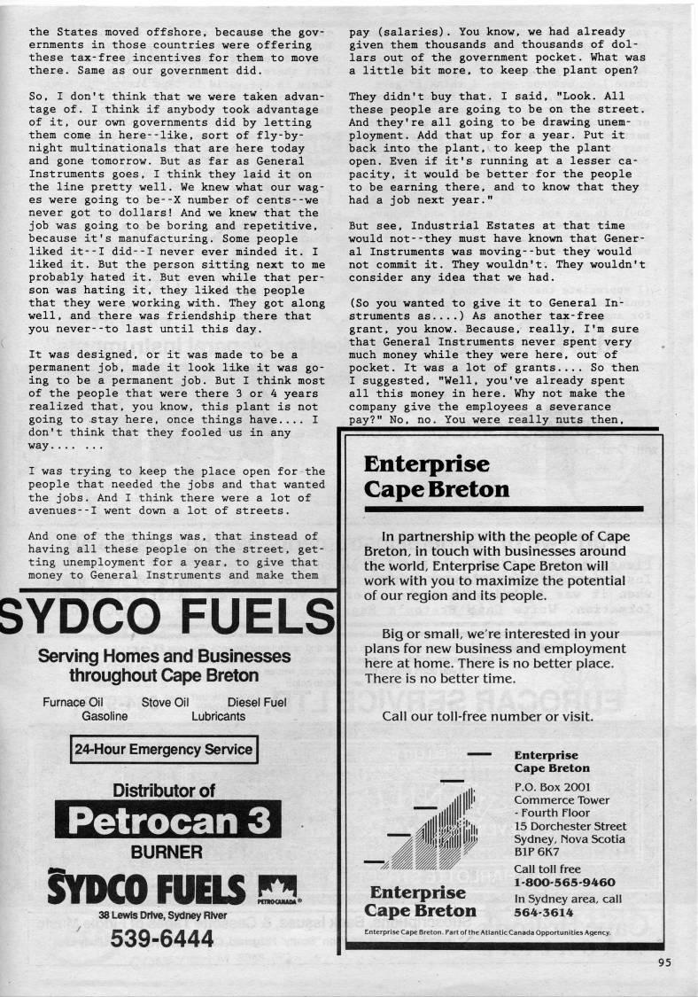 the States moved offshore, because the gov? ernments in those countries were offering these tax-free incentives for them to move there. Same as our government did. So, I don't think that we were taken advan? tage of. I think if anybody took advantage of it, our own governments did by letting them come in here--like, sort of fly-by- night multinationals that are here today and gone tomorrow. But as far as General Instruments goes, I think they laid it on the line pretty well. We knew what our wag? es were going to be--X number of cents--we never got to dollars! And we knew that the job was going to be boring and repetitive, because it's manufacturing. Some people liked it--I did--I never ever minded it. I liked it. But the person sitting next to me probably hated it. But even while that per? son was hating it, they liked the people that they were working with. They got along well, and there was friendship there that you never--to last until this day. It was designed, or it was made to be a permanent job, made it look like it was go? ing to be a permanent job. But I think most of the people that were there 3 or 4 years realized that, you know, this plant is not going to stay here, once things have.... I don't think that they fooled us in any way I was trying to keep the place open for the people that needed the jobs and that wanted the jobs. And I think there were a lot of avenues--I went down a lot of streets. And one of the things was, that instead of having all these people on the street, get? ting unemployment for a year, to give that money to General Instruments and make them SYDCO FUELS Serving Homes and Businesses throughout Cape Breton Furnace Oil Stove Oil Diesel Fuel Gasoline Lubricants 24-Hour Emergency Service Distributor of Petrocan 3 BURNER SYDCO lUOS !!3. 38 Lewis Drive, Sydney River 539-6444 pay (salaries). You know, we had already given them thousands and thousands of dol? lars out of the government pocket. What was a little bit more, to keep the plant open? They didn't buy that. I said, "Look. All these people are going to be on the street. And they're all going to be drawing unem? ployment. Add that up for a year. Put it back into the plant, to keep the plant open. Even if it's running at a lesser ca? pacity, it would be better for the people to be earning there, and to know that they had a job next year." But see. Industrial Estates at that time would not--they must have known that Gener? al Instruments was moving--but they would not commit it. They wouldn't. They wouldn't consider any idea that we had. (So you wanted to give it to General In? struments as....) As another tax-free grant, you know. Because, really, I'm sure that General Instruments never spent very much money while they were here, out of pocket. It was a lot of grants.... So then I suggested, "Well, you've already spent all this money in here. Why not make the company give the employees a severance pay?" No, no. You were really nuts then. Enterprise Cape Breton In partnership with the people of Cape Breton, in touch with businesses around the world. Enterprise Cape Breton will work with you to maximize the potential of our region and its people. Big or small, we're interested in your plans for new business and employment here at home. There is no better place. There is no better time. Call our toll-free number or visit. Enterprise Cape Breton P.O. Box 2001 Commerce Tower - Fourth Floor 15 Dorchester Street Sydney, nova Scotia BIP 6K7 Call toll free 1-800-565-9460 In Sydney area, call 564-3614 Enterprise Cape Breton. Part of the Atlantic Canada Opportunities Agency. Enterprise Cape Breton