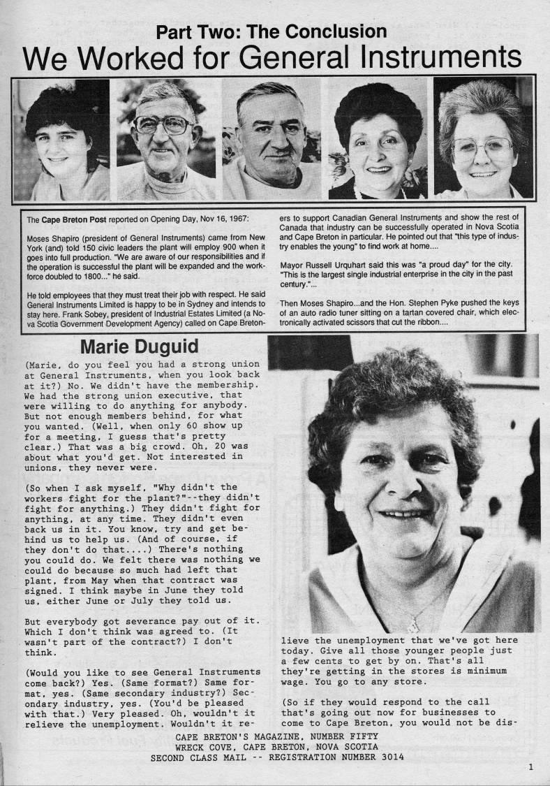 Part Two: The Conclusion We Worked for General Instruments The Cape Breton Post reported on Opening Day, Nov 16,1967: Moses Shapiro (president of Genera! instruments) came from New Yorl< (and) told 150 civic leaders the plant will employ 900 when it goes into full production. "We are aware of our responsibilities and if the operation is successful the plant will be expanded and the work? force doubled to 1800..." h6 said. He told employees that they must treat their job with respect. He said General Instruments Limited is happy to be in Sydney and intends to stay here. Frank Sobey, president of Industrial Estates Limited (a No? va Scotia Government Development Agency) called on Cape Breton- ers to support Canadian General Instruments and show the rest of Canada that industry can be successfully operated in Nova Scotia and Cape Breton in particular. He pointed out that "this type of indus? try enables the young" to find work at home.... Mayor Russell Urquhart said this was "a proud day" for the city. "This is the largest single industrial enterprise in the city in the past century."... Then Moses Shapiro...and the Hon. Stephen Pyke pushed the keys of an auto radio tuner sitting on a tartan covered chair, which elec? tronically activated scissors that cut the ribt)on.... Marie Duguid (Marie, do you feel you had a strong union at General Instruments, when you look back at it?) No. We didn't have the membership. We had the strong union executive, that were willing to do anything for anybody. But not enough members behind, for what you wanted. (Well, when only 60 show up for a meeting, I guess that's pretty clear.) That was a big crowd. Oh, 20 was about what you'd get. Not interested in unions, they never were. (So when I ask myself, "Why didn't the workers fight for the plant?"--they didn't fight for anything.) They didn't fight for anything, at any time. They didn't even back us in it. You know, try and get be? hind us to help us. (And of course, if they don't do that....) There's nothing you could do. We felt there was nothing we could do because so much had left that plant, from May when that contract was signed. I think maybe in June they told us, either June or July they told us. But everybody got severance pay out of it. Which I don't think was agreed to. (It wasn't part of the contract?) I don't think. (Would you like to see General Instruments come back?) Yes. (Same format?) Same for? mat, yes. (Same secondary industry?) Sec? ondary industry, yes. (You'd be pleased with that.) Very pleased. Oh, wouldn't it relieve the unemployment. Wouldn't it re? lieve the unemployment that we've got here today. Give all those younger people just a few cents to get by on. That's all they're getting in the stores is minimum wage. You go to any store. (So if they would respond to the call that's going out now for businesses to come to Cape Breton, you would not be dis- CAPE BRETON'S MAGAZINE, NUMBER FIFTY WRECK COVE, CAPE BRETON, NOVA SCOTIA SECOND CLASS MAIL - - REGISTRATION NUMBER 3014