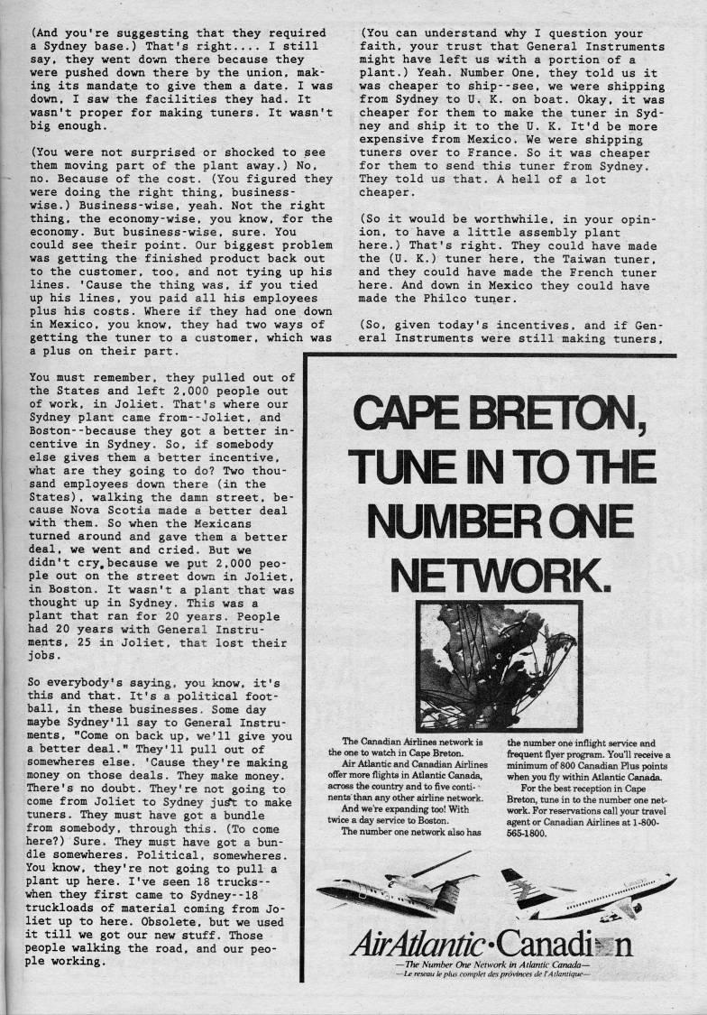 (And you're suggesting that they required a Sydney base.) That's right.... I still say, they went down there because they were pushed down there by the union, mak? ing its mandat.e to give them a date. I was down, I saw the facilities they had. It wasn't proper for making tuners. It wasn't big enough. (You were not surprised or shocked to see them moving part of the plant away.) No, no. Because of the cost. (You figured they were doing the right thing, business- wise.) Business-wise, yeah. Not the right thing, the economy-wise, you know, for the economy. But business-wise, sure. You could see their point. Our biggest problem was getting the finished product back out to the customer, too, and not tying up his lines. 'Cause the thing was, if you tied up his lines, you paid all his employees plus his costs. Where if they had one down in Mexico, you know, they had two ways of getting the tuner to a customer, which was a plus on their part. You must remember, they pulled out of the States and left 2,000 people out of work, in Joliet. That's where our Sydney plant came from--Joliet, and Boston--because they got a better in? centive in Sydney. So, if somebody else gives them a better incentive, what are they going to do? Two thou? sand employees down there (iii the States), walking the damn street, be? cause Nova Scotia made a better deal with them. So when the Mexicans turned around and gave them a better deal, we went and cried. But we didn't cry,because we put 2,000 peo? ple out on the street down in Joliet, in Boston. It wasn't a plant that was thought up in Sydney. This was a plant that ran for 20 years. People had 20 years with General Instru? ments, 25 in Joliet, that lost their jobs. So everybody's saying, you know, it's this and that. It's a political foot? ball, in these businesses. Some day maybe Sydney'11 say to General Instru? ments, "Come on back up, we'll give you a better deal." They'll pull out of somewheres else. 'Cause they're making money on those deals. They make money. There's no doubt. They're not going to come from Joliet to Sydney ju' to make tuners. They must have got a bundle from somebody, through this. (To come here?) Sure. They must have got a bun? dle somewheres. Political, somewheres. You know, they're not going to pull a plant up here. I've seen 18 trucks-- when they first came to Sydney--18 truckloads of material coming from Jo? liet up to here. Obsolete, but we used it till we got our new stuff. Those people walking the road, and our peo? ple working. (You can understand why I question your faith, your trust that General Instruments might have left us with a portion of a plant.) Yeah. Number One, they told us it was cheaper to ship--see, we were shipping from Sydney to U. K. on boat. Okay, it was cheaper for them to make the tuner in Syd? ney and ship it to the U. K. It'd be more expensive from Mexico. We were shipping tuners over to France. So it was cheaper for them to send this tuner from Sydney. They told us that. A hell of a lot cheaper. (So it would be worthwhile, in your opin? ion, to have a little assembly plant here.) That's right. They could have made the (U. K.) tuner here, the Taiwan tuner, and they could have made the French tuner here. And down in Mexico they could have made the Philco tuner. (So, given today's incentives, and if Gen? eral Instruments were still making tuners. CAPE BRETON, TUNE IN TO THE NUMBER ONE NETWORK. The Canadian Airlines network is the