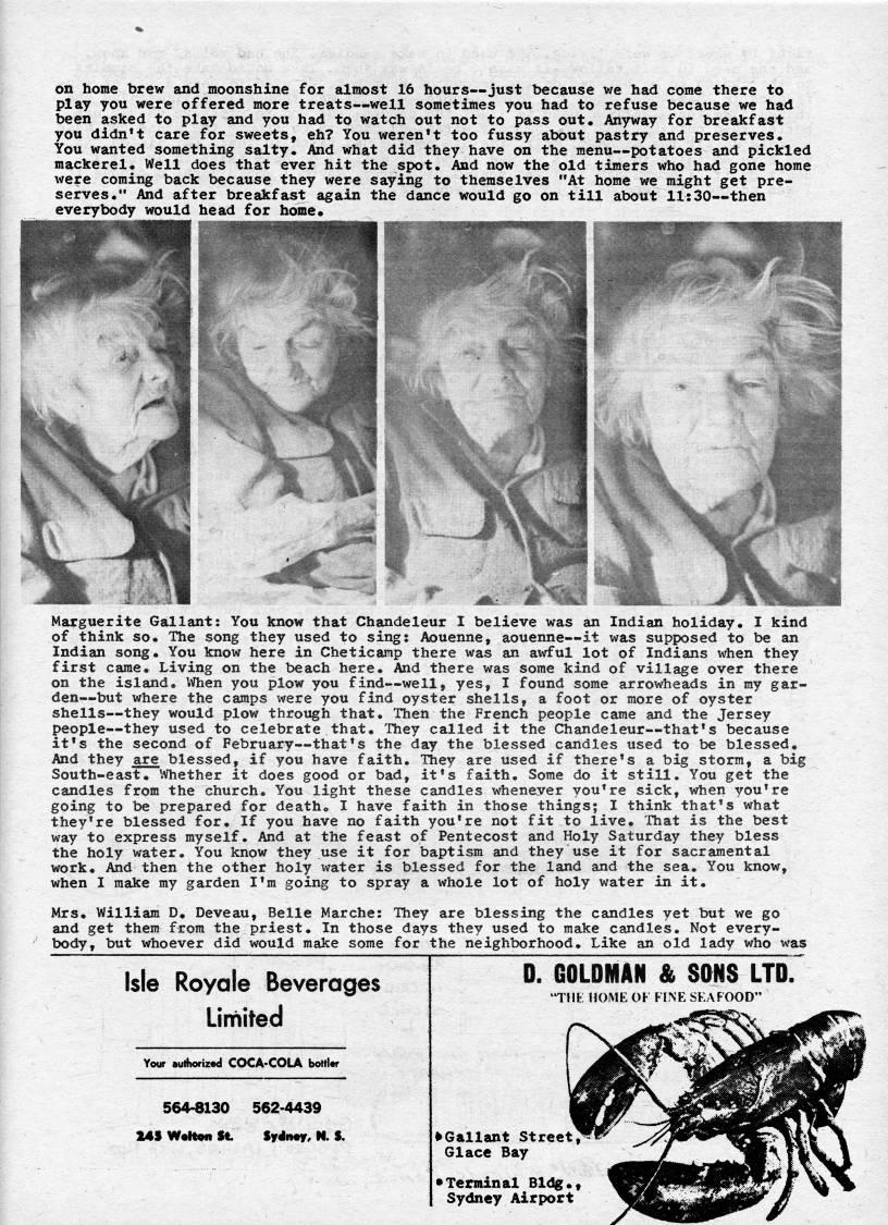 on home brew and moonshine for almost 16 hours • just because we had come there to play you were offered more treats • well sometimes you had to refuse because we had been asked to play and you had to watch out not to pass out. Anyway for breakfast you didn't care for sweets, eh? You weren't too fussy at>out pastry and preserves. You wanted something salty. And what did they have on the menu • potatoes and pickled mackerel. Well does that ever hit the spot. And now the old timers who had gone home were coming back because they were saying to themselves "At home we might get pre? serves." And after breakfast again the dance would go on till about 11:30 • then everybody would head for home. ' 1 'x 'i "' '';, Marguerite Gallant: You know that Chandeleur I believe was an Indian holiday. I kind of think so. The song they used to sing: Aouenne, aouenne • it was supposed to be an Indian song. You know here in Cheticamp there was an awful lot of Indians when they first came. Living on the beach here. And there was some kind of village over there on the island. When you plow you find • well, yes, I found some arrowheads in my gar? den • but where the camps were you find oyster shells, a foot or more of oyster shells • they would plow through that. Then the French people came and the Jersey people • they used to celebrate that. They called it the Chandeleur • that's because it's the second of February • that's the day the blessed candles used to be blessed. And they are blessed, if you have faith. They are used if there's a big storm, a big South-east. Whether it does good or bad, it's faith. Some do it still. You get the candles from the church. You light these candles whenever you're sick, when you're going to be prepared for death. I have faith in those things; I think that's what they're blessed for. If you have no faith you're not fit to live. That is the best way to express myself. And at the feast of Pentecost and Holy Saturday they bless the holy water. You know they use it for baptism and they use it for sacramental work. And then the other holy water is blessed for the land and the sea. You know, when I make my garden I'm going to spray a whole lot of holy water in it. Mrs. William D. Deveau, Belle Marche: They are blessing the candles yet but we go and get them from the priest. In those days they used to make candles. Not every? body, but whoever did would make some for the neighborhood. Like an old lady who was Isle Royale Beverages Limited Your auihoriz?d COCA-COLA botflw 564-8130 562-4439 lAi Wcltoii St. Sf4tm, N. S. D. GOLDM/ "Tilt; HOME 'Gallant Street''tF Glace Bay • Terminal Bldg., V Sydney Airport ' {H & SONS LTD. OF FINE SEAFOOD" 1'' "' "wliin''' •