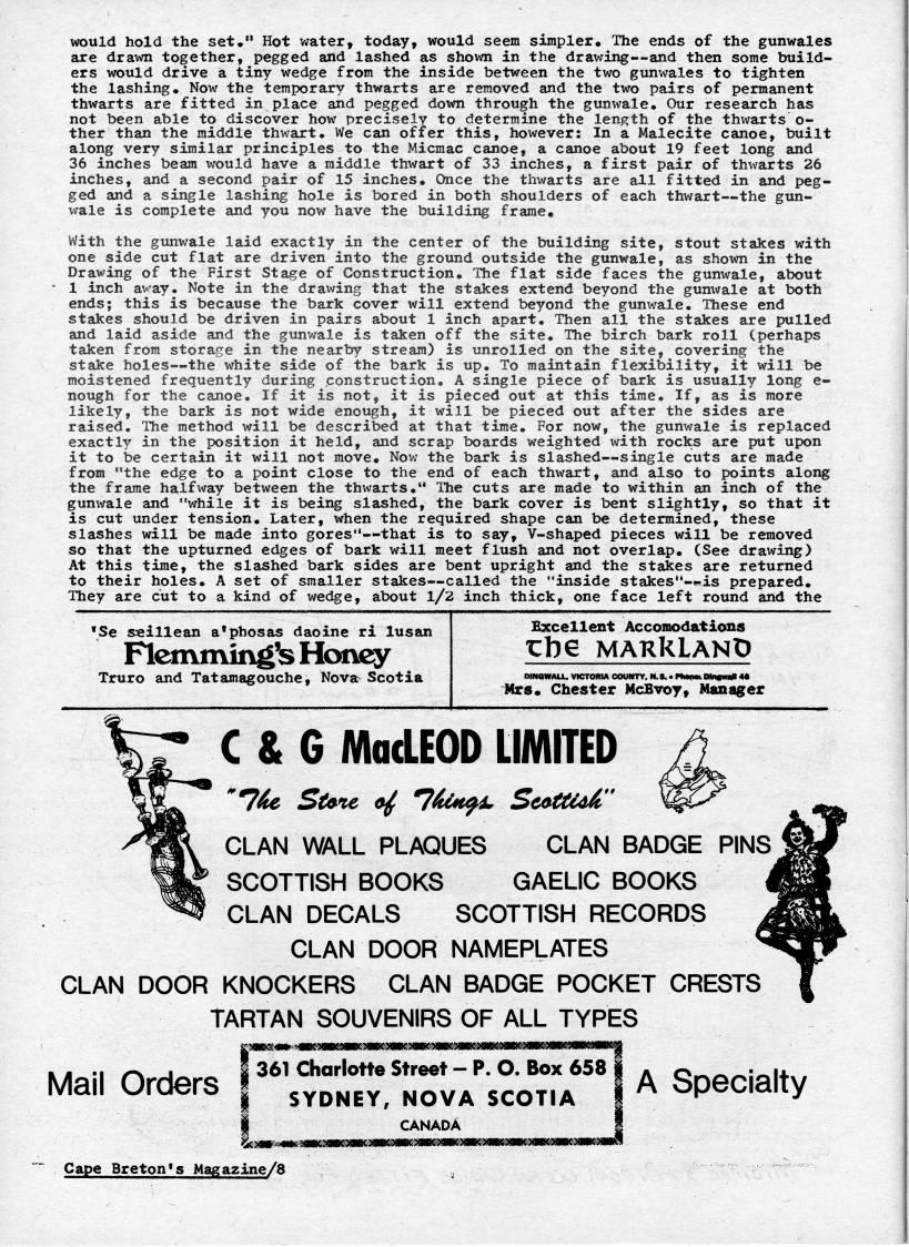 Published by Ronald Caplan on 1975/3/31 (719 reads)would hold the set." Hot water, today, would seem simpler. The ends of the gunwales are drawn together, pegged and lashed as shown in the drawing • and then some build? ers would drive a tiny wedge from the inside between the two gunwales to tighten the lashing. Now the temporary thwarts are removed and the two pairs of permanent thwarts are fitted in place and pegged down through the gunwale. Our research has not been able to discover how precisely to determine the length of the thwarts o- ther than the middle thwart. We can offer this, however: In a Malecite canoe, built along very similar principles to the Micmac canoe, a canoe about 19 feet long and 36 inches beam would have a middle thwart of 33 inches, a first pair of thwarts 26 inches, and a second pair of 15 inches. Once the thwarts are all fitted in and peg? ged and a single lashing hole is bored in both shoulders of each thwart • the gun? wale is complete and you now have the building frame. With the gunwale laid exactly in the center of the building site, stout stakes with one side cut flat are driven into the ground outside the gunwale, as shown in the Drawing of the First Stage of Construction. The flat side faces the gunwale, about 1 inch away. Note in the drawing that the stakes extend beyond the gunwrale at both ends; this is because the bark cover will extend beyond the gunwale. These end stakes should be driven in pairs about 1 inch apart. Then all the stakes are pulled and laid aside and the gunwale is taken off the site. The birch bark roll (perhaps taken from storage in the nearby stream) is unrolled on the site, covering the stake holes • the white side of the bark is up. To maintain flexibility, it will be moistened frequently during construction. A single piece of bark is usually long e- nough for the canoe. If it is not, it is pieced out at this time. If, as is more likely, the bark is not wide enough, it will be pieced out after the sides are raised. The method will be described at that time. For now, the gunwale is replaced exactly in the position it held, and scrap boards weighted with rocks are put upon it to be certain it will not move. Now the bark is slashed • single cuts are made from "the edge to a point close to the end of each thwart, and also to points along the frame halfway between the thwarts." llie cuts are made to within an inch of the gunwale and "while it is being slashed, the bark cover is bent slightly, so that it is cut under tension. Later, when the required shape can be determined, these slashes will be made into gores" • that is to say, V-shaped pieces will be removed so that the upturned edges of bark will meet flush and not overlap. (See drawing) At this time, the slashed bark sides are bent upright and the stakes are returned to their holes, A set of smaller stakes • called the "inside stakes"--is prepared. They are cut to a kind of wedge, about l/2 inch thick, one face left round and the ?Se seillean a'phosas daoine ri lusan Flcnvntving' Hon' Truro and Tatamagouche, Nova Scotia Excellent Accomodations x:h?? MARklAND omaWALL. VICTORM COUMTV, N. S, • HMfW). OilWMti 4* 14r8. Chester McBvoy, Manager C & G MadEOD IIMITED ''74c Su%c 0' TAiK' ScoUiaA" CLAN WALL PLAQUES CLAN BADGE PINS SCOTTISH BOOKS GAELIC BOOKS CLAN DECALS SCOTTISH RECORDS CLAN DOOR NAMEPLATES CLAN DOOR KNOCKERS CLAN BADGE POCKET CRESTS TARTAN SOUVENIRS OF ALL TYPES 361 Charlotte Street - P. O. Box 658 | Mail Orders | sydney, nova scotia I CANADA Cape Breton's Maeazine/8 A Specialty