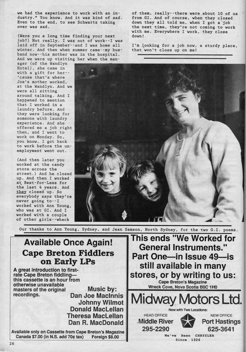 we had the experience to work with an in? dustry." You know. And it was kind of sad. Even to the end, to see Schwartz taking over was sad. (Were you a long time finding your next job?) Not really. I was out of work--I was laid off in September--and I was home all winter. And then when summer came--my hus? band now--his mother was in the hospital. And we were up visiting her when the man? ager (of the Wandlyn Hotel), she came in with a gift for her-- 'cause that's where Joe's mother worked, at the Wandlyn. And we were all sitting around talking. And I happened to mention that I worked in a laundry before. And they were looking for someone with laundry experience. And she offered me a job right then, and I went to work on Monday. So, you know, I got back to work before the un? employment went out. (And then later you worked at the candy store across the street.) And he closed up. And then I worked at Best-for-Less for the last 4 years. And they closed up. So everybody says they're never going to--I worked with Ann Young, who was at Gl. And I worked with a couple of other girls--whack of them, really--there were about 10 of us from Gl. And of course, when they closed down they all told me, when I got a job the next time, they're not coming to work with me. Everywhere I work, they close down! I'm looking for a job now, a sturdy place, that won't close up on me! Our thanks to Ann Young, Sydney, and Jean Samson, North Sydney, for the two G.I. poems. Available Once Again! Cape Breton Fiddlers on Early LPs A great introduction to first- rate Cape Breton fiddling • this cassette is an hour from otherwise unavailable . masters of the original MUSIC by: recordings. Dan Joe Maclnnis Johnny Wilmot Donald MacLellan Theresa MacLellan Dan R. MacDonald Available only on Cassette from Cape Breton's Magazine Canada $7.00 (in N.S. add 700 tax) Foreign $8.00 This ends "We Worked for General Instruments." Part One • in Issue 49's still available in many stores, or by writing to us: Cape Breton's Magazine Wreck Cove, Nova Scotia BOC 1 HO Midway Motors Ltd. Now With Two Locations: HEAD OFFICE '' NEW OFFICE Middle River w5' Port Hastings 295-2290 '' 625-3641 We've Been CHRYSLER Since 1926