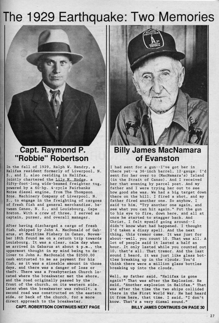 The 1929 Earthquake: Two Memories Capt. Raymond P. "Robbie" Robertson In the fall of 1929, Ralph W. Hendry, a Halifax resident formerly of Liverpool, N. S., and I, also residing in Halifax, jointly chartered the Lily M. Hodge, a fifty-foot-long wide-beamed freighter tug, powered by a 60-hp. 4-cycle Fairbanks Morse diesel engine, from The Thompson Bros. Machinery Company of Liverpool, N. S., to engage in the freighting of cargoes of fresh fish and general merchandise, be? tween Canso, N. S., and Louisbourg, Cape Breton. With a crew of three, I served as captain, purser, and overall manager. After having discharged a cargo of fresh fish, shipped by John A. MacDonald of Gab- arus, at Maritime Fishery in Canso, Novem? ber 18th found me on a return trip towards Louisbourg. It was a clear, calm day when we arrived in Gabarus at about 4 p.m., the uppermost thought in my mind being to de? liver to John A. MacDonald the $2500.00 cash entrusted to me as payment for his fish, as it was a sizeable amount in those days, and there was a danger of loss or theft. There was a Presbyterian Church lo? cated where the breakwater met the shore, and the road originally passed by the front of the church, on its western side. Later when the breakwater was rebuilt, a second road was constructed on the eastern side, or back of the church, for a more direct approach to the breakwater. CAPT. ROBERTSON CONTINUES NEXT PAGE Billy James MacNamara of Evanston I had sent for a gun--I've got her in there yet--a 36-inch barrel, 12-gauge. I'd sent for her over to (MacNamara's) Island (in the Strait of Canso). And I received her that evening by parcel post. And my father and I were trying her out to see how good she was. We had a big target down there on the hill. I fired a shot, and my father fired another one. So anyhow, I said to him, "Try another one again, and see what you can hit again." Put the gun to his eye to fire, down here, and all at once he started to stagger back. And Christ, I felt myself going around--I didn't know what had happened. I thought I'd taken a dizzy spell. And the next thing, this tremor came. It was just for about--well, you count 10. That was all. A lot of people said it lasted a half an hour. It only lasted while you counted out 10, that's all. That tremor. And the last sound I heard, it was just like glass bot? tles breaking up in the clouds. You'd think there were a million glass bottles breaking up into the clouds. Well, my father said, "Halifax is gone again!" That was after the Explosion. He said, "Another explosion in Halifax." That was after the time the two ships collided there in the First World War. He had heard it from here, that time. I said, "I don't know. That's a very dismal sound." BILLY JAMES CONTINUES ON PAGE 30