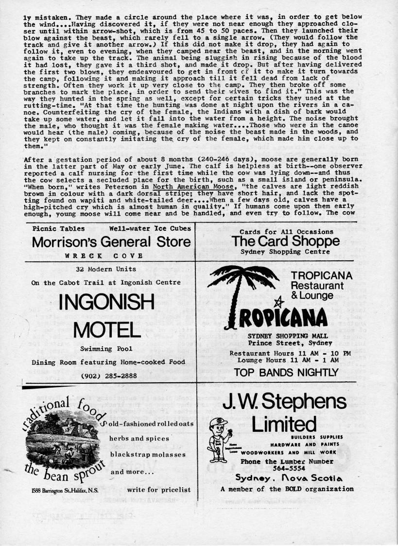Published by Ronald Caplan on 1975/3/31 (704 reads)ly mistaken. They made a circle around the place where it was, in order to get below the wind....Having discovered it, if they were not near enough they approached clo? ser until within arrow-shot, which is from 45 to 50 paces. Then they launched their blow against the beast, which rarely fell to a single arrow. (They would follow the track and give it another arrow.) If this did not make it drop, they had again to follow it, even to evening, when they camped near the beast, and in the morning went again to take up the track. The animal being sluggish in rising because of the blood it had lost, they gave it a third shot, and made it drop. But after having delivered the first two blows, they endeavoured to get in front cf it to malce it turn towards the camp, following it and making it approach till it fell dead from lack of strength. Often they work it up very close to the camp. They then broke off some branches to mark the place, in order to send their wives to find it." This was the way they hunted in the spring as well, except for certain tricks they used at the rutting-time. "At that time the huntir' was done at night upon the rivers in a ca? noe. Counterfeiting the cry of the female, the Indians with a dish of bark would take up some water, and let it fall into the water from a height. The noise brought the male, who thought it was the female making water....Those who were in the canoe would hear (the male) coming, because of the noise the beast made in the woods, and they kept on constantly imitating the cry of the female, which made him close up to them." After a gestation period of about 8 months (240-246 days), moose are generally born in the latter part of May or early Jime. The calf is helpless at birth • one observer reported a calf nursing for the first time while the cow v;as lying down • and thus the cow selects a secluded place for the birth, such as a small island or peninsula. "When born," writes Peterson in North American Moose, "the calves are light reddish brown in colour with a dark dorsal stripe; they have short hair, and lack the spot? ting found on wapiti and white-tailed deer....When a few days old, calves have a high-pitched cry which is almost human in quality." If humans come upon them early enoi'h, young moose will come near and be handled, and even try to follow. The cow Picnic Tables Well-water Ice Cubes Morrison's General Store WRECK COVE 1 32 Modern Units On the Cabot Trail at Ingonish Centre INGONISH MOTEL Swimming Pool Dining Room featuring Home-cooked Food (902) 285-2888 Cards for All Occasions The Card Shoppe Sydney Shopping Centre -'SSf'S' TROPICANA ''''' V' Restaurant 1 A & Lounge SYDNEY SHOPPING? MALL Prince Street, Sydney Restaurant Hours 11 AM - 10 PM Lounge Hours 11 AM - 1 AM TOP BANDS NIGHTLY ''m fo. )ean s' 1588 Barrington St,Halifax.N.S. P old-fashioned rolled oats herbs and spices blackstrap molasses |1[0 and more... write for pricelist J. W. Stephens Limited ?? UILDERS SUPPLIES HARDWARE AND PAINTS WOODWORKERS AND MILL WORK Phone the Lumber Number 564-5554 Sycli #y. fXoVdi Scotid' A member of the BOLD organization