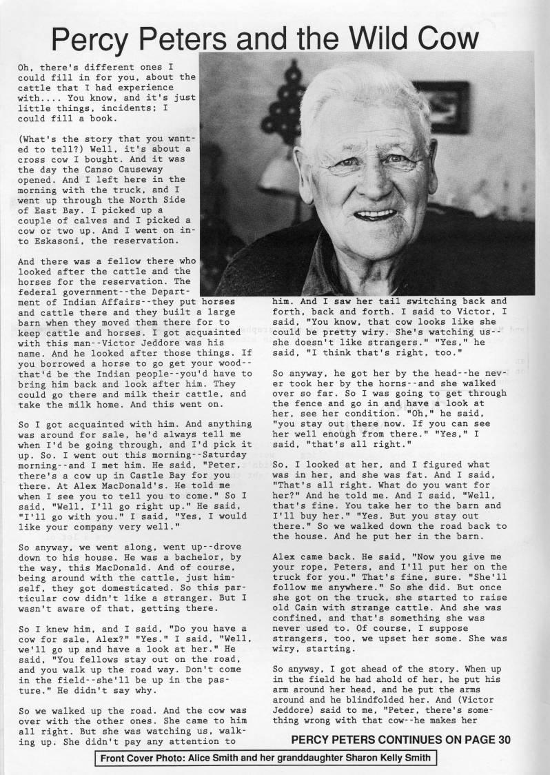 Published by Ronald Caplan on 1989/2/1 (865 reads)Percy Peters and the Wild Cow Oh, there's different ones I could fill in for you, about the cattle that I had experience with.... You know, and it's just little things, incidents; I could fill a book. (What's the story that you want? ed to tell?) Well, it's about a cross cow I bought. And it was the day the Canso Causeway opened. And I left here in the morning with the truck, and I went up through the North Side of East Bay. I picked up a couple of calves and I picked a cow or two up. And I went on in? to Eskasoni, the reservation. And there was a fellow there who looked after the cattle and the horses for the reservation. The federal government--the Depart- ment of Indian Affairs--they put horses and cattle there and they built a large barn when they moved them there for to keep cattle and horses. I got acquainted with this man--Victor Jeddore was his name. And he looked after those things. If you borrowed a horse to go get your wood-- that'd be the Indian people--you'd have to bring him back and look after him. They could go there and milk their cattle, and take the milk home. And this went on. So I got acquainted with him. And anything was around for sale, he'd always tell me when I'd be going through, and I'd pick it up. So. I went out this morning--Saturday morning--and I met him. He said, "Peter, there's a cow up in Castle Bay for you there. At Alex MacDonald's. He told me when I see you to tell you to come." So I said, "Well, I'll go right up." He said, "I'll go with you." I said, "Yes, I would like your company very well." So anyway, we went along, went up--drove down to his house. He was a bachelor, by the way, this MacDonald. And of course, being around with the cattle, just him? self, they got domesticated. So this par? ticular cow didn't like a stranger. But I wasn't aware of that, getting there. So I knew him, and I said, "Do you have a cow for sale, Alex?" "Yes." I said, "Well, we'll go up and have a look at her." He said, "You fellows stay out on the road, and you walk up the road way. Don't come in the field--she'11 be up in the pas? ture." He didn't say why. So we walked up the road. And the cow was over with the other ones. She came to him all right. But she was watching us, walk? ing up. She didn't pay any attention to him. And I saw her tail switching back and forth, back and forth. I said to Victor, I said, "You know, that cow looks like she could be pretty wiry. She's watching us-- she doesn't like strangers." "Yes," he said, "I think that's right, too." So anyway, he got her by the head--he nev? er took her by the horns--and she walked over so far. So I was going to get through the fence and go in and have a look at her, see her condition. "Oh," he said, "you stay out there now. If you can see her well enough from there." "Yes," I said, "that's all right." So, I looked at her, and I figured what was in her, and she was fat. And I said, "That's all right. What do you want for her?" And he told me. And I said, "Well, that's fine. You take her to the barn and I'll buy her." "Yes. But you stay out there." So we walked down the road back to the house. And he put her in the barn. Alex came back. He said, "Now you give me your rope, Peters, and I'll put her on the truck for you." That's fine, sure. "She'll follow me anywhere." So she did. But once she got on the truck, she started to raise old Cain with strange cattle. And she was confined, and that's something she was never used to. Of course, I suppose strangers, too, we upset her some. She was wiry, starting. So an3rway, I got ahead of the story. When up in the field he had ahold of her, he put his arm around her head, and he put the arms around and he blindfolded her. And (Victor Jeddore) said to me, "Peter, there's some? thing wrong with that cow--he makes her PERCY PETERS CONTINUES ON PAGE 30 Front Cover Photo: Alice Smith and her granddaughter Sharon Kelly Smith