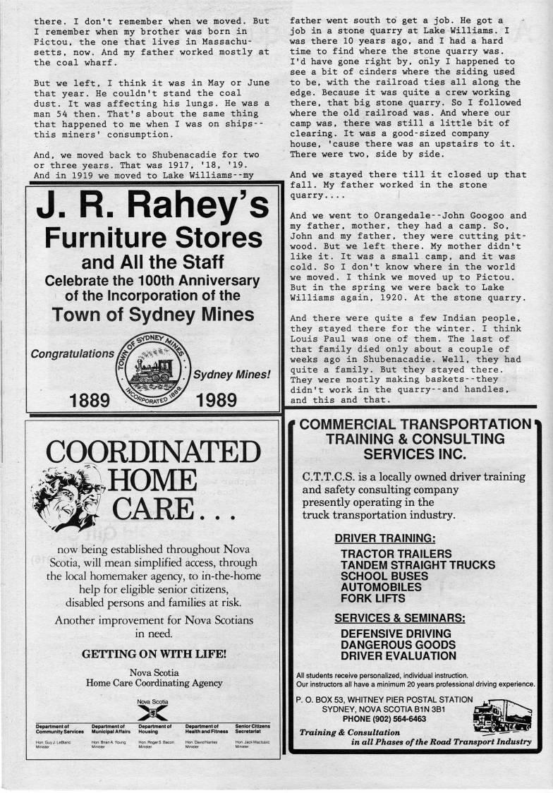 Published by Ronald Caplan on 1989/2/1 (444 reads)there. I don't remember when we moved. But I remember when my brother was born in Pictou, the one that lives in Massachu? setts, now. And my father worked mostly at the coal wharf. But we left, I think it was in May or June that year. He couldn't stand the coal dust. It was affecting his lungs. He was a man 54 then. That's about the same thing that happened to me when I was on ships-- this miners' consumption. And, we moved back to Shubenacadie for two or three years. That was 1917, '18, '19. And in 1919 we moved to Lake Williams--my J- R. Rahey's Furniture Stores and All the Staff Celebrate the 10Dth Anniversary of the Incorporation of the Town of Sydney Mines Sydney Mines! 1989 CODRDINArED rCARE... now being established throughout Nova Scotia, will mean simplified access, through the local homemaker agency, to in-the-home help for eligible senior citizens, disabled persons and families at risk. Another improvement for Nova Scotians in need. GETTING ON WITH LIFE! Nova Scotia Home Care Coordinating Agency father went south to get a job. He got a job in a stone quarry at Lake Williams. I was there 10 years ago, and I had a hard time to find where the stone quarry was. I'd have gone right by, only I happened to see a bit of cinders where the siding used to be, with the railroad ties all along the edge. Because it was quite a crew working there, that big stone quarry. So I followed where the old railroad was. And where our camp was, there was still a little bit of clearing. It was a good-sized company house, 'cause there was an upstairs to it. There were two, side by side. And we stayed there till it closed up that fall. My father worked in the stone quarry.... And we went to Orangedale--John Googoo and my father, mother, they had a camp. So, John and my father, they were cutting pit- wood. But we left there. My mother didn't like it. It was a small camp, and it was cold. So I don't know where in the world we moved. I think we moved up to Pictou. But in the spring we were back to Lake Williams again, 1920. At the stone quarry. And there were quite a few Indian people, they stayed there for the winter. I think Louis Paul was one of them. The last of that family died only about a couple of weeks ago in Shubenacadie. Well, they had quite a family. But they stayed there. They were mostly making baskets--they didn't work in the quarry--and handles, and this and that. COMIVIERCIAL TRANSPORTATION TRAINING & CONSULTING SERVICES INC. C.T.T.C.S. is a locally owned driver training and safety consulting company presently operating in the truck transportation industry. DRIVER TRAINING: TRACTOR TRAILERS TANDEM STRAIGHT TRUCKS SCHOOL BUSES AUTOMOBILES FORK LIFTS SERVICES & SEMINARS: DEFENSIVE DRIVING DANGEROUS GOODS DRIVER EVALUATION All students receive personalized, individual instruction. Our instructors all have a minimum 20 years professional driving experience. P. O. BOX 53, WHITNEY PIER POSTAL STATION SYDNEY, NOVA SCOTIA B1N 3B1 PHONE (902) 564-6463 Training & Consultation in all Phases of the Road Transport Industry
