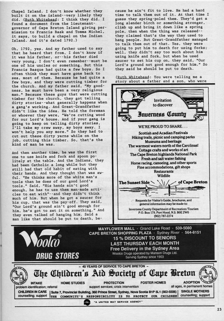 Published by Ronald Caplan on 1989/2/1 (340 reads)Chapel Island. I don't know whether they built it on the island--very likely they did. (Ruth Whitehead: I think they did. I found a document from the lieutenant- governor of Cape Breton Island giving per? mission to Francis Bask and Tomma Michel, it says, to build a chapel on the Indian Island. And it's dated 1792.) Oh, 1792, yes. And my father used to say that he heard that from, I don't know if it was his father, or--his father died very young, I don't even remember--must be one of his uncles or something. But this Francis Basque had quite a few boys. So I often think they must have gone back to sea, most of them. Because he had quite a few boys, and they were cutting timber for the church. And my father said, "My good? ness, he must have been a very religious man." Because these guys that were cutting timber for the church, they got telling dirty stories--what generally happens when a gang's working. And Great-Grandfather didn't like the idea. He told the foreman or whoever they were, "We're cutting wood for our Lord's house. And if your gang is going to keep on telling dirty stories, I'll take my crew away, my boys away. I won't help you any more." So they had to cut out these dirty yarns while on the job, cutting this timber. So, that's the kind of man he was. And then another time, he was the first one to use knife and fork and spoon po? litely at the table. And the Indians, they had been Catholic a long while but they still had that old habit of eating with their hands. And they thought that was aw? ful. "He thinks more of the white man's tools than he does of our good Lord's tools." Said, "His hands ain't good enough, he has to use them man-made arti? cles to eat with"--and they didn't think much of him. But when he got a saucer for his cup, that was the pay-off. They said, "Our Lord's ground ain't good enough for him, he's got to set it on something." And they even talked of hanging him. Said a man like that should be put to death, be? cause he ain't fit to live. He had a hard time to talk them out of it. At that time I guess they spring-poled them. They'd get a long slender birch or something stronger, climb up and bring it down like a spring pole, then when the thing was released-- they claimed that's the way they used to hang people. But Great-Grandfather managed to talk them out of that. Yes, they were going to put him to death for using forks; well, they didn't say too much about him using knife and fork, but when he used saucer to set his cup on, they said, "Our Lord's ground not good enough for him." So they said he should be put to death. (Ruth Whitehead: You were telling me a story about a father and a son, who were WE'RE PROUD TO SHARE... Scottish and Acadian Festivals Hiking trails, picnic and camping parks Museums and heritage The warmest waters north of the Carolinas! Cottage crafts and works of art The Cape Breton highlands National Park Fresh and salt water fishing Horse racing, canoeing, and other sports Fine accommodations, gift shops Restaurants Wildlife The Sunset Side of Cape Breton Requests for Visitor's Guide, brochures, and general information may be made to: Inverness County Department of Recreation/Tourism P.O. Box 179. Port Hood, N.S. BOE 2W0 (902)787-2274 DRUG STORES MAYFLOWER MALL - Grand Lake Road - 539-5080 CAPE BRETON SHOPPING PLAZA - Sydney River - 564-8151 15 % DISCOUNT TO SENIORS LAST THURSDAY EACH MONTH Free Delivery in the Sydney Area WooIco Drugs operated by Manson Drugs Ltd. Serving Sydney since 1903 ?? 40 YEARS OF SERVICE TO CAPE BRETON ~ 2U|e (Biiiihvm'B Aib 'ocietg of (tope Breton ' INTAKE HOME STUDIES PROTECTION FOSTER HOMES ADOPTION problem identificatton; referral support services; crisis intervention all ages, in permanent homes CHILDREN IN CARE I Suite 7, Provincial Bulging. 360 Prince Street, Sydney, Nova Scotia Bl P 5L1 (562-5506) I SINGLE MOTHERS counselling; support |jhe commonity'S responsibility is to protect our children! counselling; support 9 "A UNITED WAY SERVICE AGENCY"
