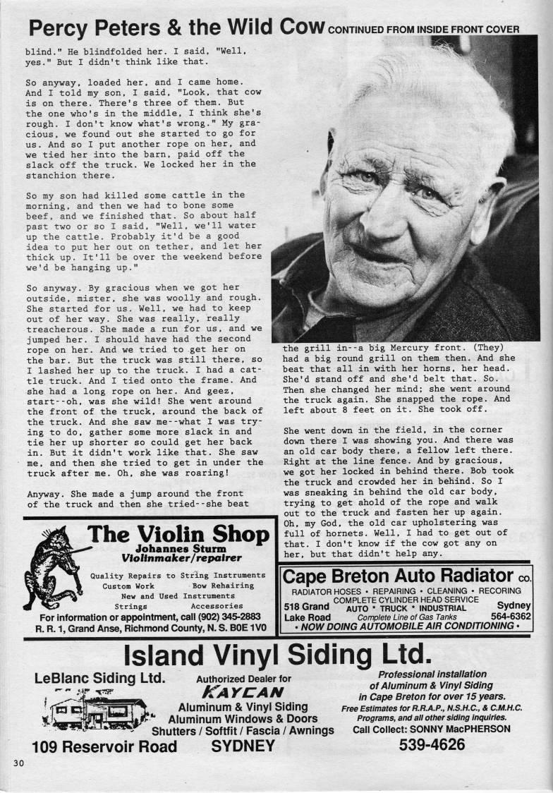 Published by Ronald Caplan on 1989/2/1 (367 reads)Percy Peters & the Wild Cow continued PRomi inside front cover blind." He blindfolded her. I said, yes." But I didn't think like that. 'Well, So anyway, loaded her, and I came home. And I told my son, I said, "Look, that cow is on there. There's three of them. But the one who's in the middle, I think she's rough. I don't know what's wrong." My gra? cious, we found out she started to go for us. And so I put another rope on her, and we tied her into the barn, paid off the slack off the truck. We locked her in the stanchion there. So my son had killed some cattle in the morning, and then we had to bone some beef, and we finished that. So about half past two or so I said, "Well, we'll water up the cattle. Probably it'd be a good idea to put her out on tether, and let her thick up. It'll be over the weekend before we'd be hanging up." So anyway. By gracious when we got her outside, mister, she was woolly and rough. She started for us. Well, we had to keep out of her way. She was really, really treacherous. She made a run for us. and we jumped her. I should have had the second rope on her. And we tried to get her on the bar. But the truck was still there, so I lashed her up to the truck. I had a cat? tle truck. And I tied onto the frame. And she had a long rope on her. And geez, start--oh, was she wild! She went around the front of the truck, around the back of the truck. And she saw me--what I was try? ing to do, gather some more slack in and tie her up shorter so could get her back in. But it didn't work like that. She saw me, and then she tried to get in under the truck after me. Oh, she was roaring! Anyway. She made a jump around the front of the truck and then she tried--she beat The Violin Shop ' Johannes Sturm Violinmaker/repairer Quality Repairs to String Instruments Custom Work Bow Rehairing New and Used Instruments Strings Accessories For Information or appointment, call (902) 345-2883 R. R. 1, Grand Anse, Richmond County, N. S. BOE 1V0 the grill in--a big Mercury front. (They) had a big round grill on them then. And she beat that all in with her horns, her head. She'd stand off and she'd belt that. So. Then she changed her mind; she went around the truck again. She snapped the rope. And left about 8 feet on it. She took off. She went down in the field, in the corner down there I was showing you. And there was an old car body there, a fellow left there. Right at the line fence. And by gracious, we got her locked in behind there. Bob took the truck and crowded her in behind. So I was sneaking in behind the old car body, trying to get ahold of the rope and walk out to the truck and fasten her up again. Oh, my God, the old car upholstering was full of hornets. Well, I had to get out of that. I don't know if the cow got any on her, but that didn't help any. Cape Breton Auto Radiator co RADIATOR HOSES • REPAIRING • CLEANING • RECORING .r..oi' . COMPLETE CYLINDER HEAD SERVICE _ . 518 Grand auto * truck * industrial Sydney Lake Road Complete Line of Gas Tanks 564-6362 . NOW DOING AUTOMOBILE AIR CONDITIONING • Island Vinyl Siding Ltd LeBlanc Siding Ltd. Authorized Dealer tor ' Kay CAN Aluminum & Vinyl Siding Aluminum Windows & Doors Shutters / Softfit / Fascia / Awnings 109 Reservoir Road SYDNEY Professional Installation of Aluminum & Vinyl Siding in Cape Breton for over 15 years. Free Estimates forR.R.A.P., N.S.H.C, & C.M.H.C. Programs, and all other siding Inquiries. Call Collect: SONNY MacPHERSON 539-4626