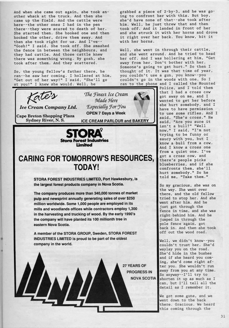 Published by Ronald Caplan on 1989/2/1 (268 reads)w And when she came out again, she took an? other whack at the truck. And then she came up the field. And the cattle were here--the other ones I had in the pen there--they were scared to death of her. She started then. She hooked one and then hooked the other, drive them away. And then she took right for us. And I've-- "Gosh!" I said. She took off. She smashed the fence in between the neighbours, and they had cattle. And those cattle knew there was something wrong. By gosh, she took after them. And they scattered. So, the young fellow's father there, he ran--he saw her coming. I hollered at him, "Get out of her way!" I said, "She'll go at you!" I knew she would. Well, he Ice Cream Company Ltd, Cape Breton Shopping Plaza Sydney River, N. S. Ti'e finest let Cream ;''' 9'ade 'Here ' ''' "EspeeiaCCy Jor O'ou OPEN 7 Days a Week ICE CREAM PARLOUR and BAKERY STORA' Stom Forest Industries UmHed CARING FOR TOMORROW'S RESOURCES, TODAY! STORA FOREST INDUSTRIES LIMrTED, Port Hawkesbury, is the largest forest products company in Nova Scotia. The company produces more than 340,000 tonnes of market pulp and newsprint annually generating sales of over $250 million worldwide. Some 1,000 people are employed in Its mills and woodlands offices while contractors employ 1,300 In the harvesting and trucking of wood. By the early I990's the company will have planted its 100 millionth tree in eastern Nova Scotia. A member of the STORA GROUP, Sweden, STORA FOREST INDUSTRIES LIMITED is proud to be part of the oldest company in the world. 27 YEARS OF PROGRESS IN NOVA SCOTIA grabbed a piece of 2-by-3, and he was go? ing to confront her with this. But boy, she'd have none of that--she took after him. Well, he just threw that and then took off. And it landed in front of her and she struck it with her horns and drove it right over her back. You know, hit it with her horns. Well, she went in through their cattle, and she went around. And he tried to head her off. And I was hollering at him, "Get away from her. Don't bother with her. Someone's going to get hurt." So then I thought of it. It was that time of year, you couldn't use a gun, you know--you couldn't go in the woods with one. So I ran to the phone and I called the Mounted Police, and I told them that I had a cross cow got away on me, and I wanted to get her before she hurt somebody, and I have to have permission to use some rifles. And I said, "She's cross." He said, "Are you sure it isn't a bull?" "Well now," I said, "I'm not trying to be funny or saucy with you, but I know a bull from a cow. And I know a cross one from a quiet one. I've got a cross cow, and there's people picks blueberries, and if she confronts them, she'll hurt somebody." So he told me, "Take them." So my gracious, she was on the way. She went over there, and the old fellow tried to stop her. And she went after him. And he just got through the fence in time, and she was right behind him. And he jumped in through the pole fence again, got back in. And then she took off out the wood road. Well, we didn't know--you couldn't trust her. She'd waylay you on the road. She'd hide in the bushes and if she heard you com? ing, she'd come right af? ter you. She wouldn't run away from you at any time. So anyway--I'11 try to shorten it up as much as I can, but I'll tell all the detail as I remember it. We got some guns, and we went down to the back there. Gracious. We heard this coming through the 31