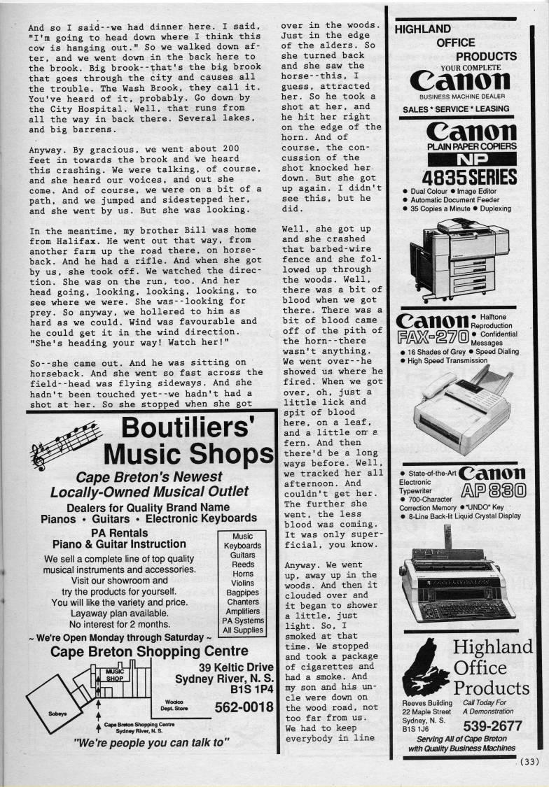 Published by Ronald Caplan on 1989/2/1 (267 reads)And so I said--we had dinner here. I said, "I'm going to head down where I think this cow is hanging out." So we walked down af? ter, and we went down in the back here to the brook. Big brook--that's the big brook that goes through the city and causes all the trouble. The Wash Brook, they call it. You've heard of it, probably. Go down by the City Hospital. Well, that runs from all the way in back there. Several lakes, and big barrens. Anyway. By gracious, we went about 200 feet in towards the brook and we heard this crashing. We were talking, of course, and she heard our voices, and out she come. And of course, we were on a bit of a path, and we jumped and sidestepped her, and she went by us. But she was looking. In the meantime, my brother Bill was home from Halifax. He went out that way, from another farm up the road there, on horse? back. And he had a rifle. And when she got by us, she took off. We watched the direc? tion. She was on the run, too. And her head going, looking, looking, looking, to see where we were. She was--looking for prey. So an3rway, we hollered to him as hard as we could. Wind was favourable and he could get it in the wind direction. "She's heading your way! Watch her!" So--she came out. And he was sitting on horseback. And she went so fast across the field--head was flying sideways. And she hadn't been touched yet--we hadn't had a shot at her. So she stopped when she got Boutiliers' Music Shops Cape Breton's Newest Locally-Owned Musical Outlet Dealers for Quality Brand Name Pianos • Guitars • Electronic Keyboards PA Rentals Piano & Guitar Instruction We sell a complete line of top quality musical instruments and accessories. Visit our showroom and try the products for yourself. You will like the variety and price. Layaway plan available. No interest for 2 months. ' We're Open Monday through Saturday ~ Cape Breton Shopping Centre 39 Keltic Drive Sydney River, N. S B1S1P4 :S:?? 562-0018 Music Keyboards Guitars Reeds Horns Violins Bagpipes Chanters Amplifiers PA Systems All Supplies We're people you can talk to" over in the woods. Just in the edge of the alders. So she turned back and she saw the horse--this, I guess, attracted her. So he took a shot at her, and he hit her right on the edge of the horn. And of course, the con? cussion of the shot knocked her down. But she got up again. I didn't see this, but he did. Well, she got up and she crashed that barbed-wire fence and she fol? lowed up through the woods. Well, there was a bit of blood when we got there. There was a bit of blood came off of the pith of the horn--there wasn't anything. We went over--he showed us where he fired. When we got over, oh, just a little lick and spit of blood here, on a leaf, and a little on a fern. And then there'd be a long ways before. Well, we tracked her all afternoon. And couldn't get her. The further she went, the less blood was coming. It was only super? ficial, you know. An5rway. We went up, away up in the woods. And then it clouded over and it began to shower a little, just light. So, I smoked at that time. We stopped and took a package of cigarettes and had a smoke. And my son and his un? cle were down on the wood road, not too far from us. We had to keep everybody in line HIGHLAND OFFICE PRODUCTS _-- _ YOUR COMPLETE Canon BUSINESS MACHINE DEALER SALES * SERVICE * LEASING Canon PLAIN PAPER COPIERS a835SERIES * Dual Colour • Innage Editor Automatic Document Feeder 35 Copies a Minute • Duplexing Canon rJ Halftone I Reproduction • 16 Shades of Grey • Speed Dialing • High Speed Transmission ?>// "Canon • State-of-the-Art I Electronic Typewriter • 700-Character Correction Memory • "UNDO" Key • 8-Line Back-lit Liquid Crystal Display ' Highland Office Products Reeves Building Call Today For 22 Maple Street A Demonstration iS'-'- 539-2677 Serving All of Cape Breton with Quality Business Machines . (33)
