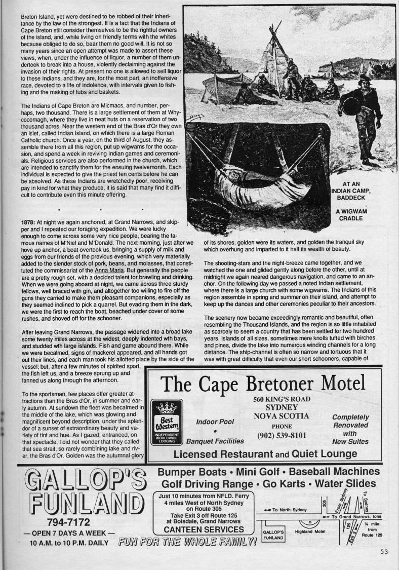 Published by Ronald Caplan on 1989/2/1 (166 reads)Breton Island, yet were destined to be robbed of their inheri? tance by the law of the strongest. It is a fact that the Indians of Cape Breton still consider themselves to be the rightful owners of the island, and, while living on friendly terms with the whites because obliged to do so, bear them no good will. It is not so many years since an open attempt was made to assert these views, when, under the influence of liquor, a number of them un? dertook to break into a house, violently declaiming against the invasion of their rights. At present no one is allowed to sell liquor to these Indians, and they are, for the most part, an inoffensive race, devoted to a life of indolence, with intervals given to fish? ing and the making of tubs and baskets. The Indians of Cape Breton are Micmacs, and number, per? haps, two thousand. There is a large settlement of them at Why? cocomagh, where they live in neat huts on a reservation of two thousand acres. Near the western end of the Bras d'Or they own an islet, called Indian Island, on which there is a large Roman Catholic church. Once a year, on the third of August, they as? semble there from all this region, put up wigwams for the occa? sion, and spend a week in reviving Indian games and ceremoni? als. Religious services are also performed in the church, which are intended to sanctify them for the ensuing twelvemonth. Each individual is expected to give the priest ten cents before he can be absolved. As these Indians are wretchedly poor, receiving pay in kind for what they produce, it is said that many find it diffi? cult to contribute even this minute offering. 1878: At night we again anchored, at Grand Narrows, and skip? per and I repeated our foraging expedition. We were lucky enough to come across some very nice people, bearing the fa? mous names of M'Niel and M'Donald. The next moming, just after we hove up anchor, a boat overtook us, bringing a supply of milk and eggs from our friends of the previous evening, which very materially added to the slender stock of pork, beans, and molasses, that consti? tuted the commissariat of the Anna Maria. But generally the people are a pretty rough set, with a decided talent for brawling and drinking. When we were going aboard at night, we came across three sturdy fellows, well braced with gin, and altogether too willing to fire off the guns they carried to make them pleasant companions, especially as they seemed inclined to pick a quarrel. But evading them in the dari<, we were the first to reach the boat, beached under cover of some rushes, and shoved oft for the schooner. After leaving Grand Narrows, the passage widened into a broad lake some twenty miles across at the widest, deeply indented wth bays, and studded wth large islands. Fish and game abound there. While we were becalmed, signs of mackerel appeared, and all hands got out their lines, and each man took his allotted place by the side of the vessel; but, after a few minutes of spirited sport, A WIGWAM CRADLE of its shores, golden were its waters, and golden the tranquil sky which overhung and imparted to it half its wealth of beauty. The shooting-stars and the night-breeze came together, and we watched the one and glided gently along before the other, until at midnight we again neared dangerous navigation, and came to an an? chor. On the following day we passed a noted Indian settlement, where there is a large church with some wigwams. The Indians of this region assemble in spring and summer on their island, and attempt to keep up the dances and other ceremonies peculiar to their ancestors. The scenery now became exceedingly romantic and beautiful, often resembling the Thousand Islands, and the region is so little inhabited as scarcely to seem a country that has been settled for two hundred years. Islands of all sizes, sometimes mere knolls tufted with birches and pines, divide the lake into numerous winding channels for a long distance. The ship-channel is often so narrow and tortuous that it was with great difficulty that even our short schooners, capable of the fish left us, and a breeze sprung up and fanned us along through the afternoon. To the sportsman, few places offer greater at? tractions than the Bras d'Or, in summer and ear? ly autumn. At sundown the fleet was becalmed in the middle of the lake, which was glowing and magnificent beyond description, under the splen dor of a sunset of extraordinary beauty and va? riety of tint and hue. As I gazed, entranced, on that spectacle, I did not wonder that they called that sea strait, so rarely combining lake and riv? er, the Bras d'Or. Golden was the autumnal glory The Cape Bretoner Motel indoor Pool Banquet Facilities 560 KING'S ROAD SYDNEY NOVA SCOTIA PHONE (902) 539-8101 Completely Renovated with New Suites Licensed Restaurant and Quiet Lounge 'tlJB'LaM?? Bumper Boats • Mini Golf • Baseball Machines Golf Driving Range • Go Karts • Water Slides 794-7172 • OPEN 7 DAYS A WEEK - 10 A.M. to 10 P.M. DAILY Just 10 minutes from NFLD. Ferry 4 miles West of North Sydney on Route 305 Take Exit 3 off Route 125 at Boisdale, Grand Narrows CANTEEN SERVICES mm iFm mn wmm mmi