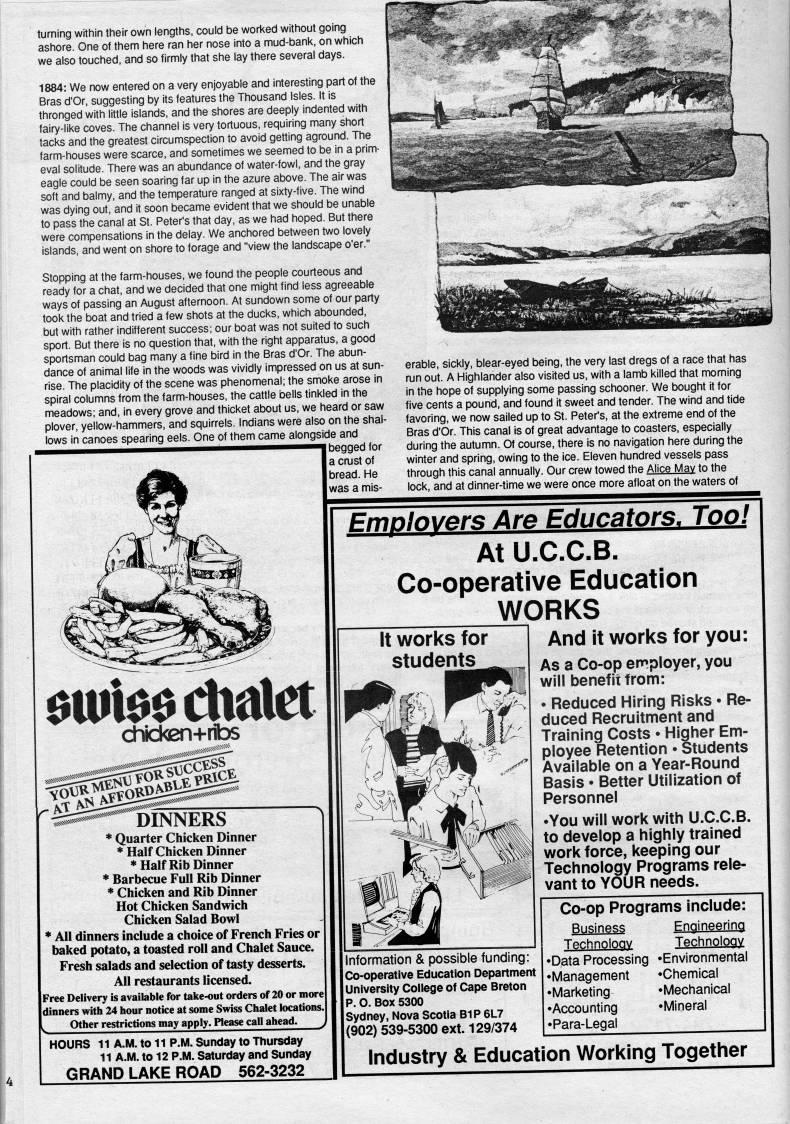 Published by Ronald Caplan on 1989/2/1 (158 reads)turning within their own lengths, could be worked without going ashore. One of them here ran her nose into a mud-bank, on which we also touched, and so firmly that she lay there several days. 1884: We now entered on a very enjoyable and interesting part of the Bras d'Or, suggesting by its features the Thousand Isles. It is thronged with little islands, and the shores are deeply indented with fairy-like coves. The channel is very tortuous, requiring many short tacks and the greatest circumspection to avoid getting aground. The farm-houses were scarce, and sometimes we seemed to be in a prim? eval solitude. There was an abundance of water-fowl, and the gray eagle could be seen soaring far up in the azure above. The air was soft and balmy, and the temperature ranged at sixty-five. The wind was dying out, and it soon became evident that we should be unable to pass the canal at St. Peter's that day, as we had hoped. But there were compensations in the delay. We anchored between two lovely islands, and went on shore to forage and "view the landscape o'er." Stopping at the farm-houses, we found the people courteous and ready for a chat, and we decided that one might find less agreeable ways of passing an August afternoon. At sundown some of our party took the boat and tried a few shots at the ducks, which abounded, but with rather indifferent success; our boat was not suited to such sport. But there is no question that, with the right apparatus, a good sportsman could bag many a fine bird in the Bras d'Or. The abun? dance of animal life in the woods was vividly impressed on us at sun? rise. The placidity of the scene was phenomenal; the smoke arose in spiral columns from the farm-houses, the cattle bells tinkled in the meadows; and, in every grove and thicket about us, we heard or saw plover, yellow-hammers, and squirrels. Indians were also on the shal? lows in canoes spearing eels. One of them came alongside and I begged for a cmst of bread. He was a mis- $uii$$didlet chicken+ribs DINNERS * Quarter Chicken Dinner * Half Chicken Dinner * Half Rib Dinner * Barbecue Full Rib Dinner * Chicken and Rib Dinner Hot Chicken Sandwich Chicken Salad Bowl * All dinners include a choice of French Fries or baked potato, a toasted roll and Chalet Sauce. Fresh salads and selection of tasty desserts. All restaurants licensed. Free Delivery is available for take-out orders of 20 or morel jdinners with 24 hour notice at some Swiss Chalet locations.| Other restrictions may apply. Hease call ahead. HOURS 11 A.M. to 11 P.M. Sunday to Thursday 11 A.M. to 12 P.M. Saturday and Sunday GRAND LAKE ROAD 562-3232 erable, sickly, blear-eyed being, the very last dregs of a race that has run out. A Highlander also visited us, with a lamb killed that morning in the hope of supplying some passing schooner. We bought it for five cents a pound, and found it sweet and tender. The wind and tide favoring, we now sailed up to St. Peter's, at the extreme end of the Bras d'Or. This canal is of great advantage to coasters, especially during the autumn. Of course, there is no navigation here during the winter and spring, owing to the ice. Eleven hundred vessels pass through this canal annually. Our crew towed the Alice May to the lock, and at dinner-time we were once more afloat on the waters of Emplovers Are Educators. Too! At U.C.C.B. Co-operative Education WORKS And it works for you: It works for students p'rF' As a Co-op employer, you will benefit from: • Reduced Hiring Risks • Re? duced Recruitment and Training Costs • Higher Em? ployee Retention • Students Available on a Year-Round Basis • Better Utilization of Personnel • You will work with U.C.C.B. to develop a highly trained work force, keeping our Technology Programs rele? vant to YOUR needs. Information & possible funding: Co-operative Education Department University College of Cape Breton P. O. Box 5300 Sydney, Nova Scotia BIP 6L7 (902) 539-5300 ext. 129/374 Co-op Programs include: Business Engineering Technology ??Data Processing • Management • Marketing • Accounting • Para-Legal Technology • Environmental • Chemical • Mechanical • Mineral Industry & Education Working Together